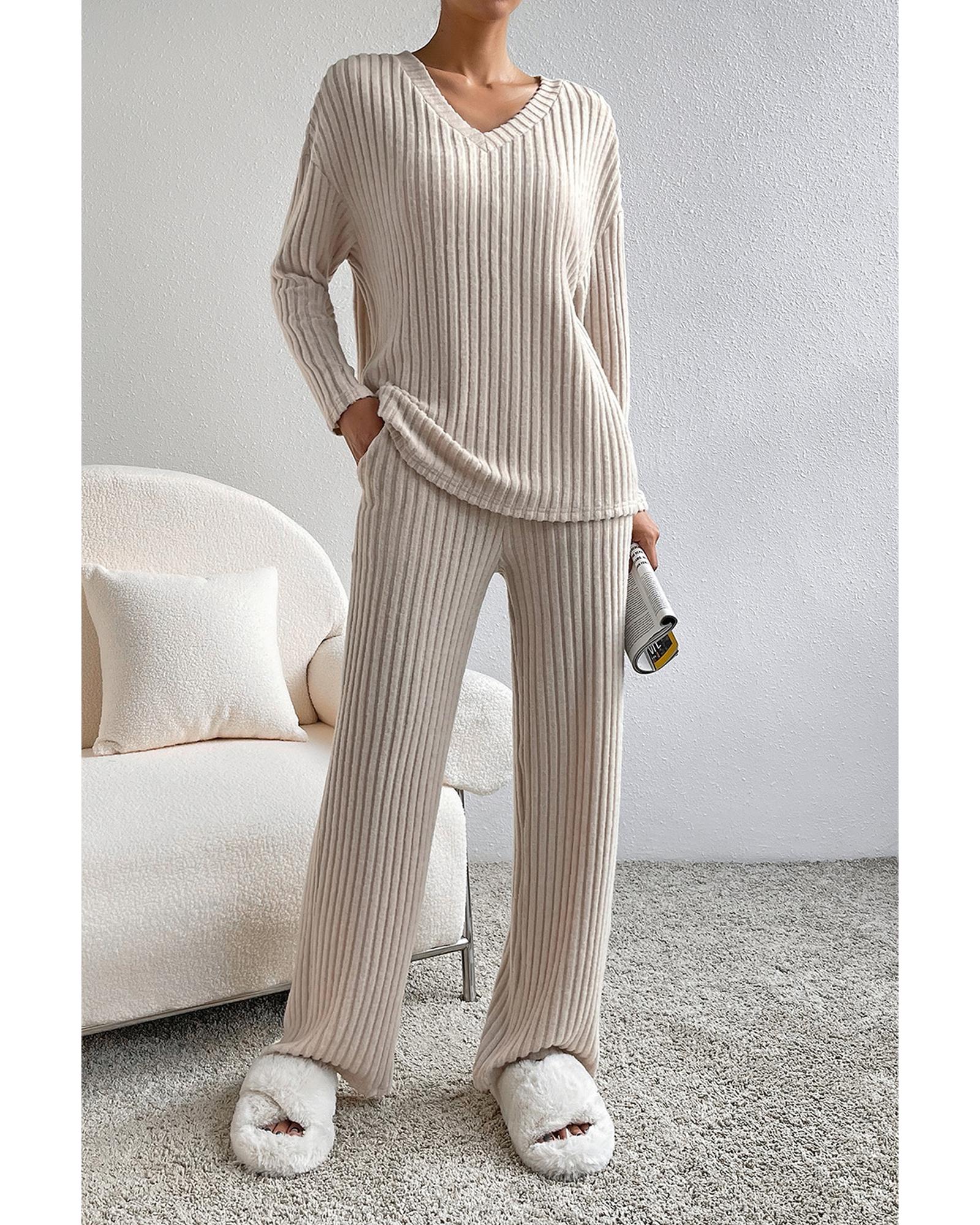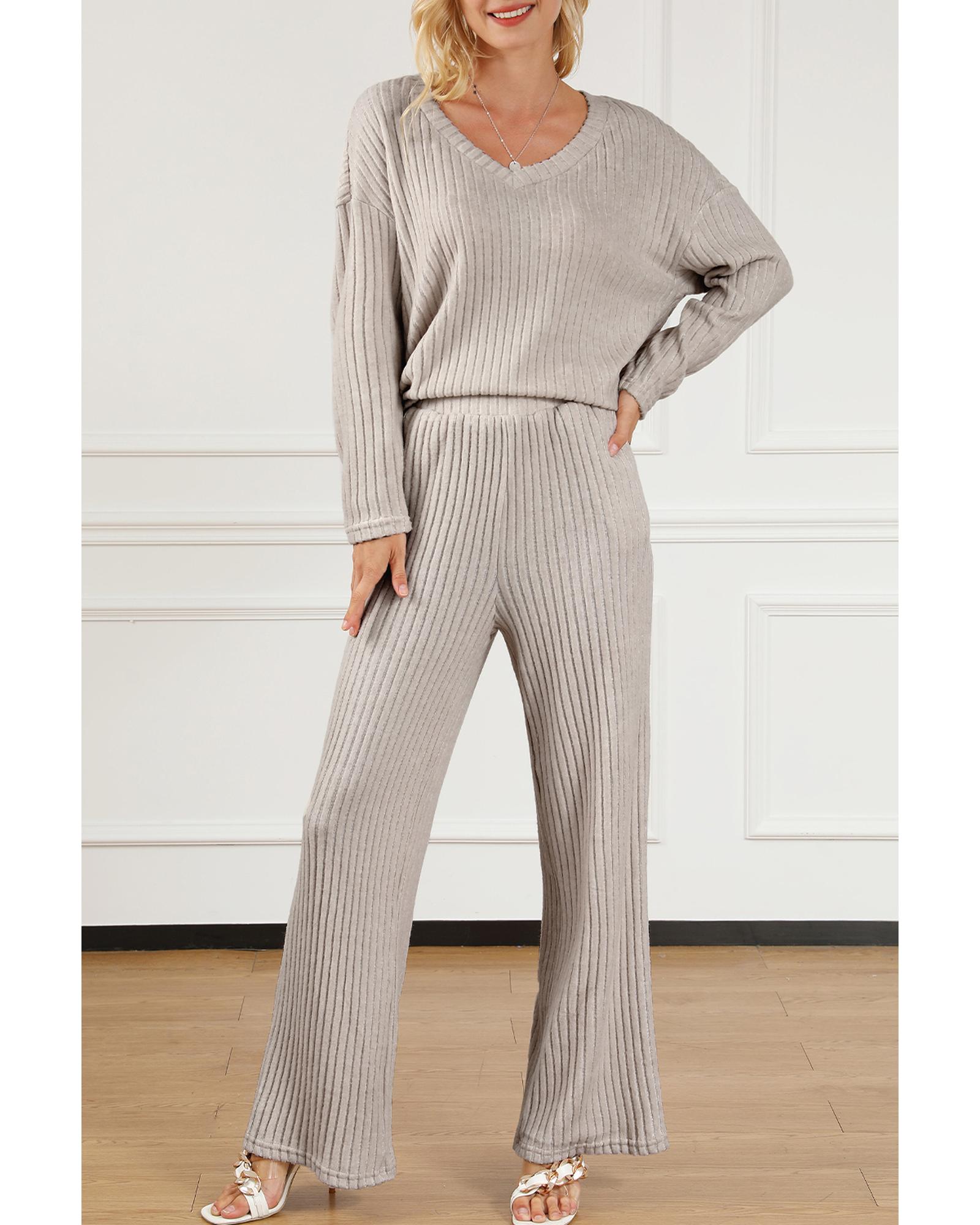 Khaki Ribbed Knit V Neck Slouchy Two-piece Outfit – S