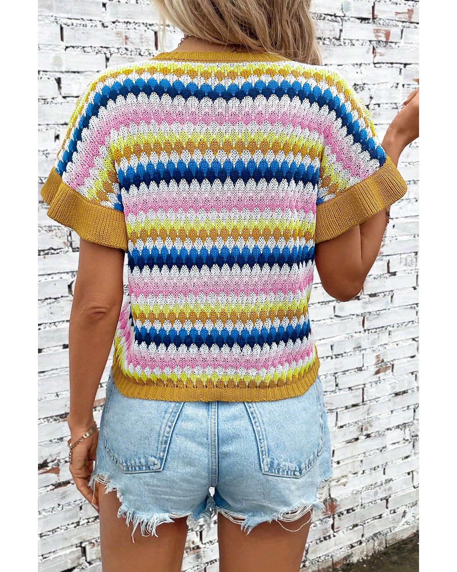 Khaki Trimmed Ruffle Sleeve Colorful Textured Sweater – L