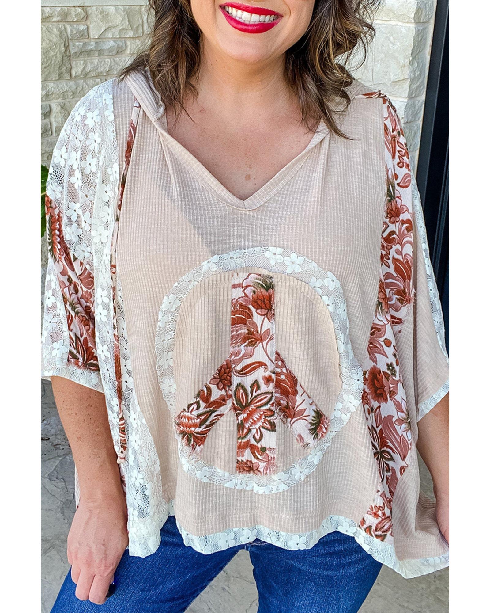 Khaki V Neck Floral Peace Sign Graphic Lace Patch Ribbed Plus Size Hooded Top – 2X