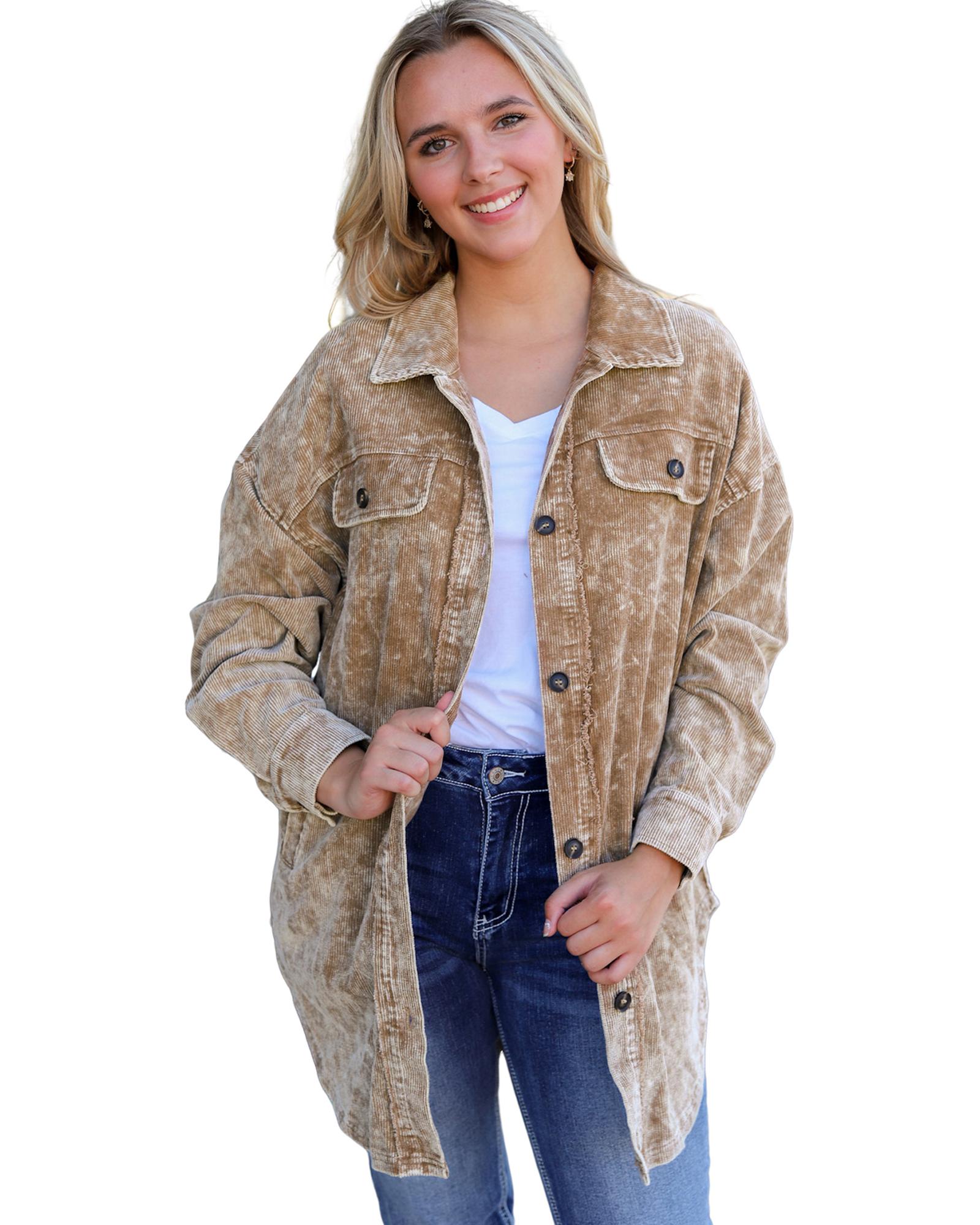 Khaki Vintage Distressed Mineral Wash Oversized Shacket – S