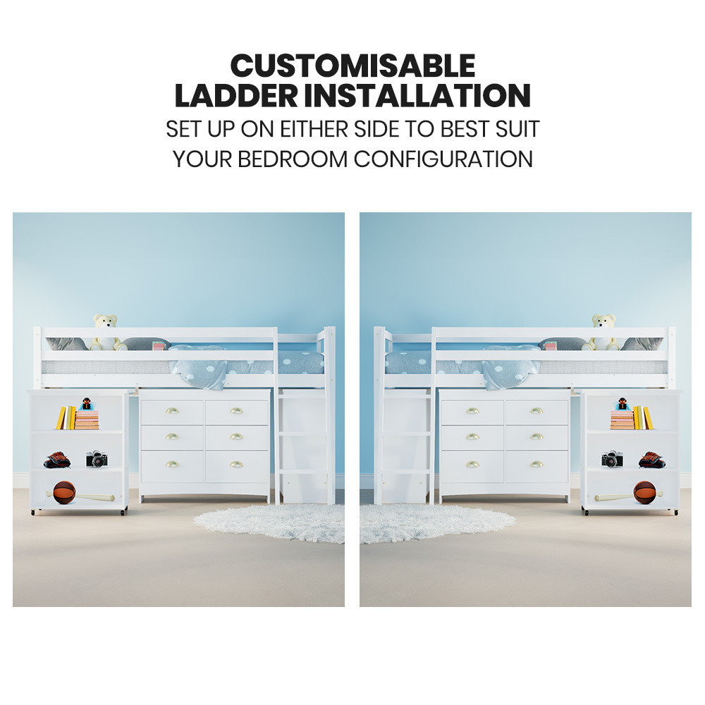 KINGSTON SLUMBER Wooden Kids Single Loft Bed Frame with Pull Out Desk, Storage Drawers, Cabinet – White