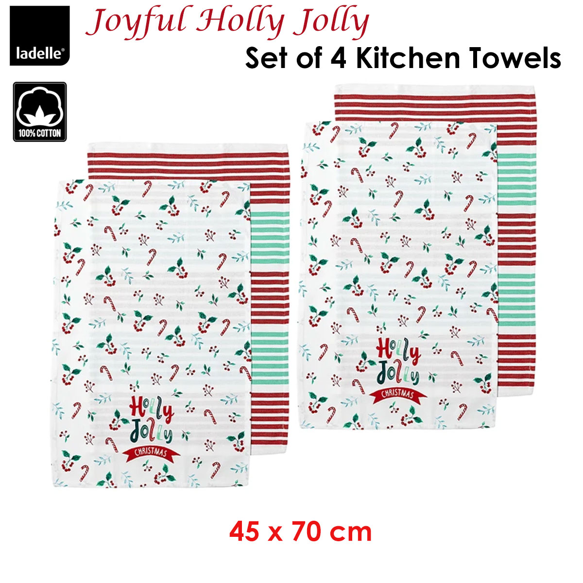 Ladelle Joyful Holly Jolly Christmas Set of 4 Cotton Kitchen Towels 45 x 70 cm