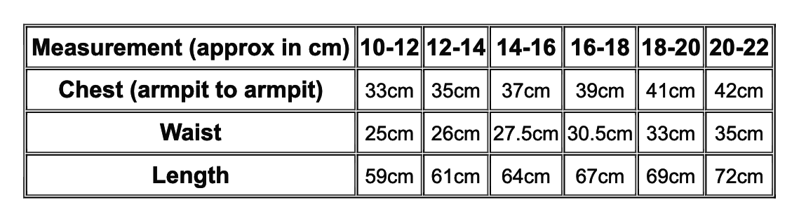 | Chest (armpit to armpit) | 33cm | 35cm | 36cm | 37.5cm | 38.5cm | 40cm |