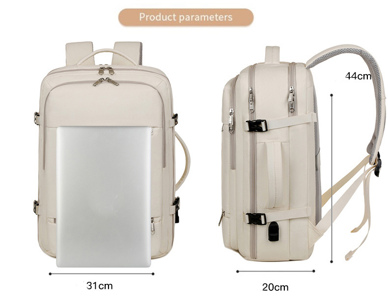 This stylish and functional large-capacity backpack is designed to make your travels hassle-free. With a lightweight design, dedicated compartments, and a built-in USB charging port, it is ideal for both daily use and extended trips. The beige color adds a touch of elegance while ensuring practicality.