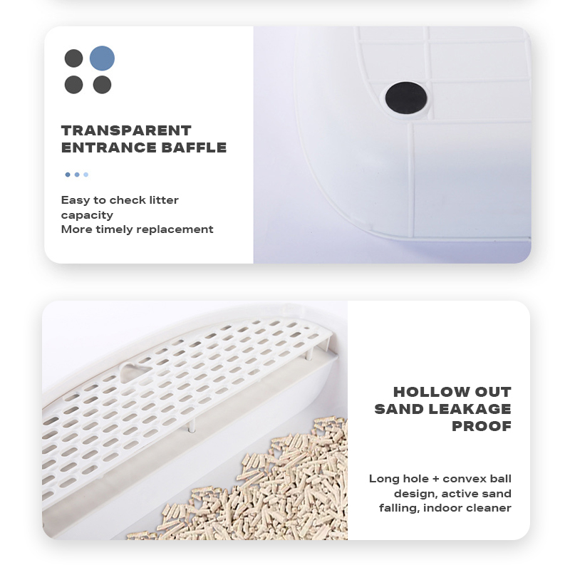 - One-Way Door:The front door of the litter box is only used for in and out, to prevent the litter spill outside, the cat could go in and out through the top door at will, which is benefitial to exercising the cats body and increasing the fun of life. The hollow holes at the top of the litter tray filter the litter, so that when the cat jumps out the litter will fall back into the tray without causing a mess and reducing the number of cleanings.