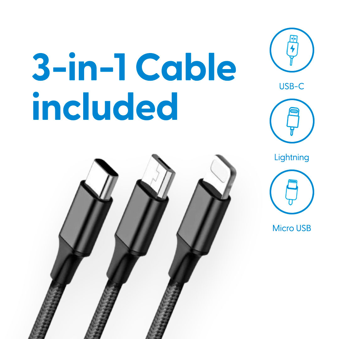 - 3-in-1 Cable Included: No need to stress about carrying multiple cables for your phone, tablet, earbuds, and more. The included 3-in-1 cable ensures a connection for USB-C, Micro-USB, and Apple Lightning devices