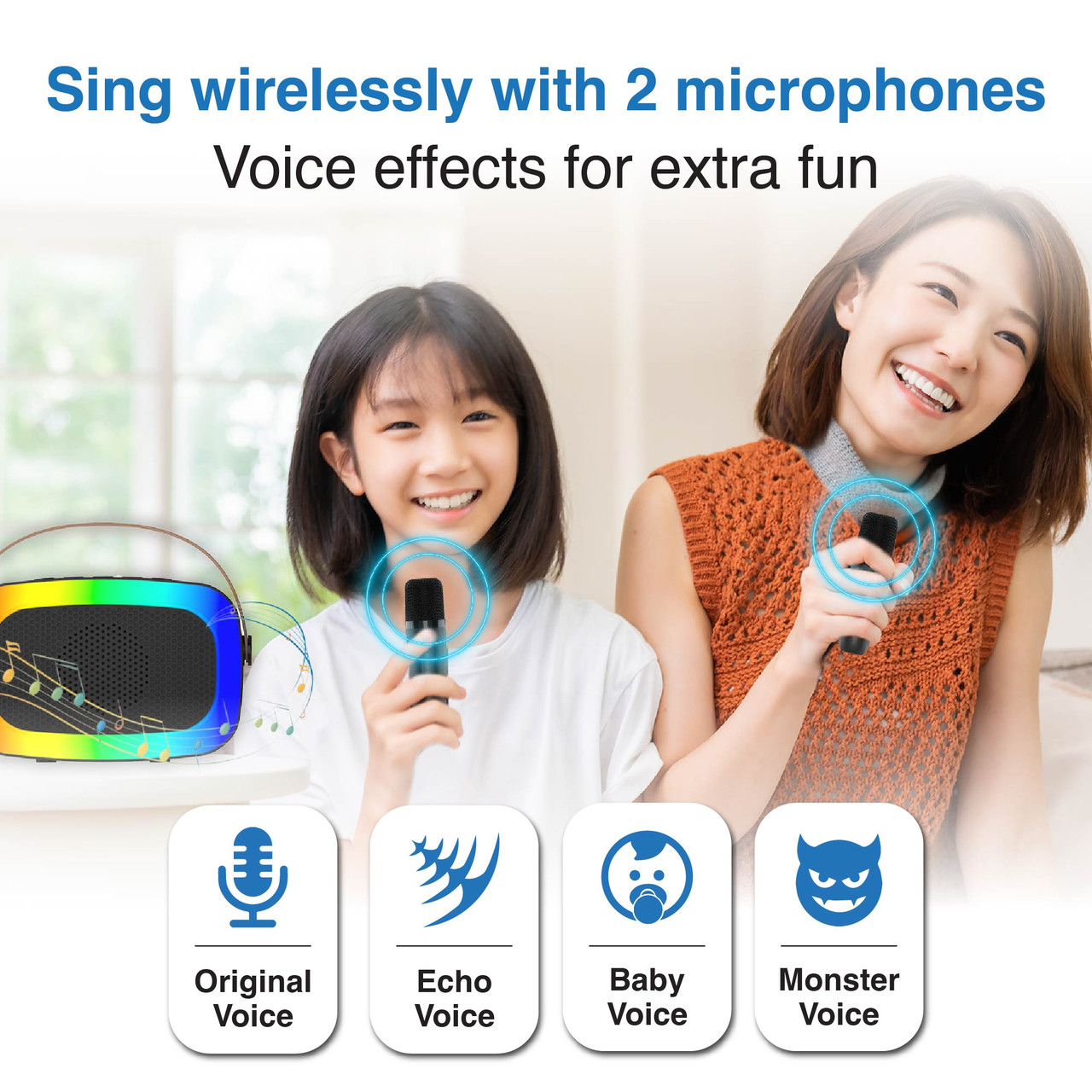 - Two Wireless Mics Perfect for duets, with voice effects to add a bit of flair.