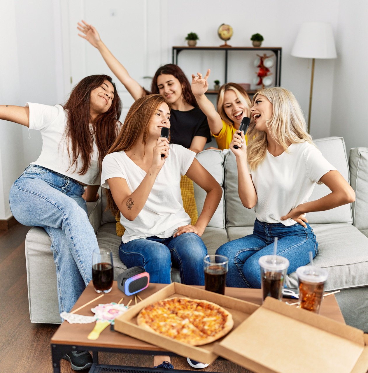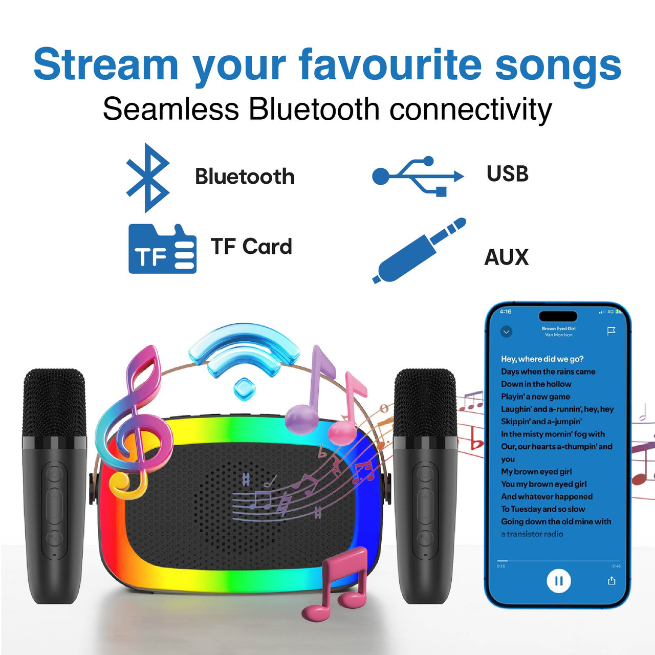 Simply connect your phone to the speaker, line up your favourite songs on your chosen music app (like Spotify, Apple Music, YouTube) – even better if your song has lyrics of Karaoke mode and sing along.