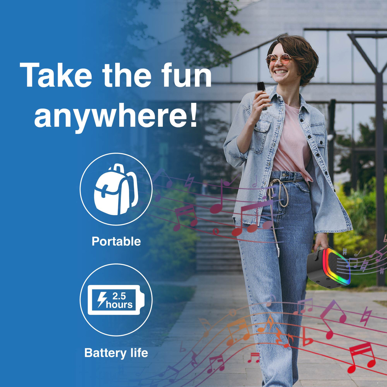 Sing along to your favourite tunes with this Portable Karaoke speaker and two wireless microphones.