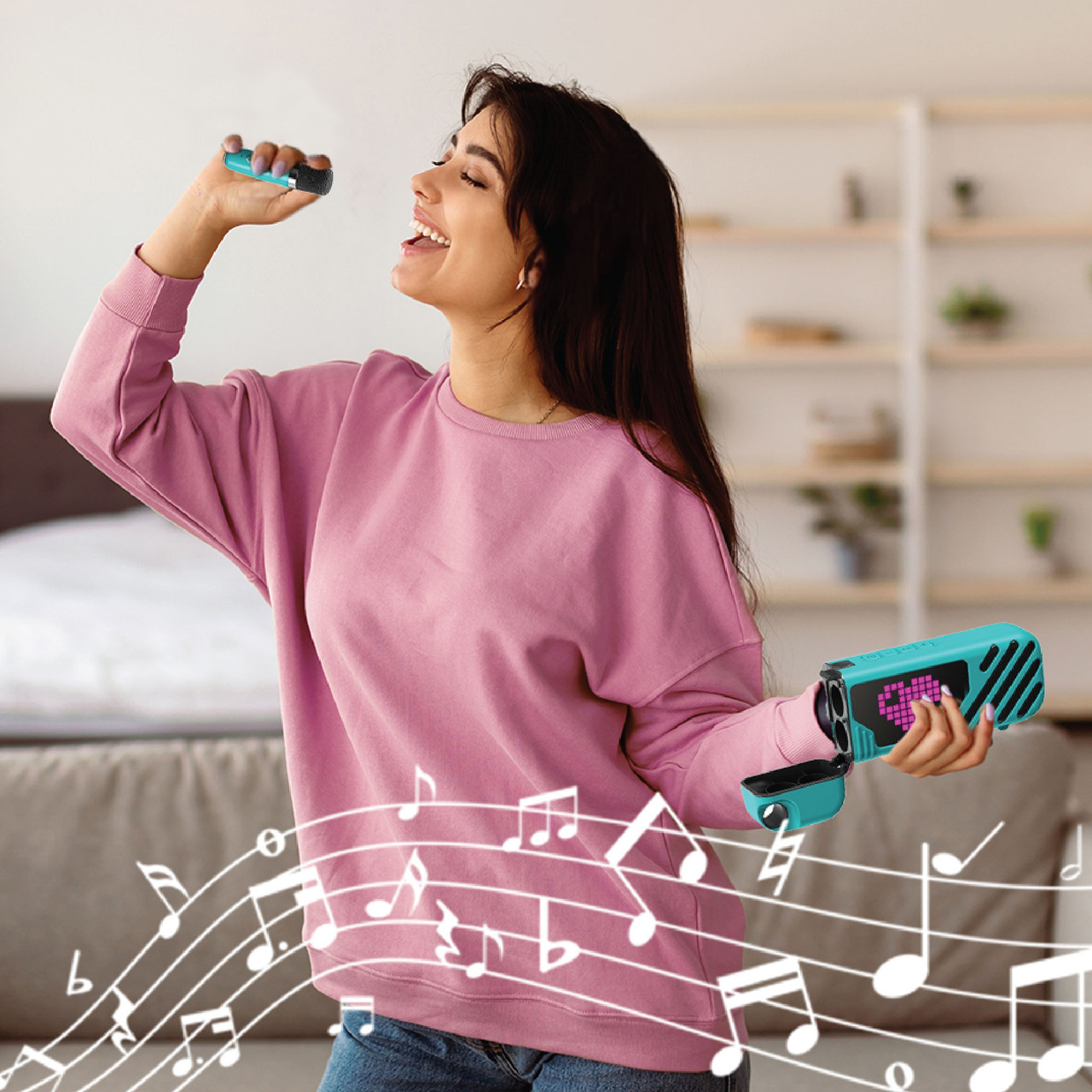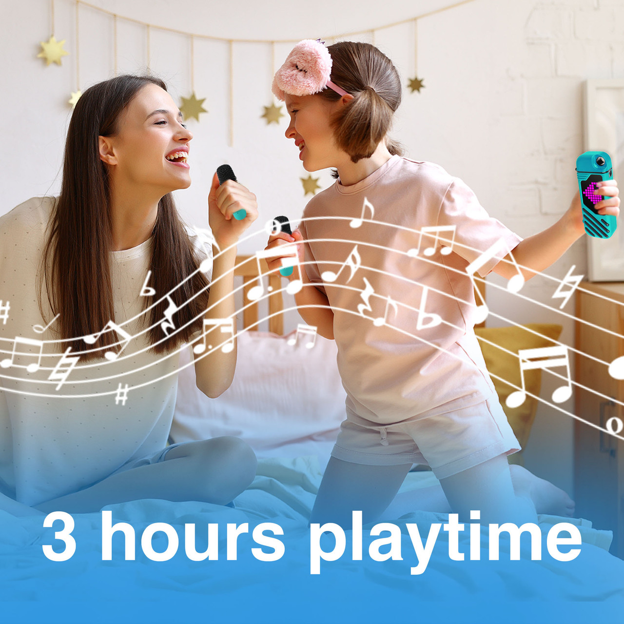 • Two Wireless Microphones: Sing solo or duet with a friend, with complete freedomno tangled cords or interruptions.
