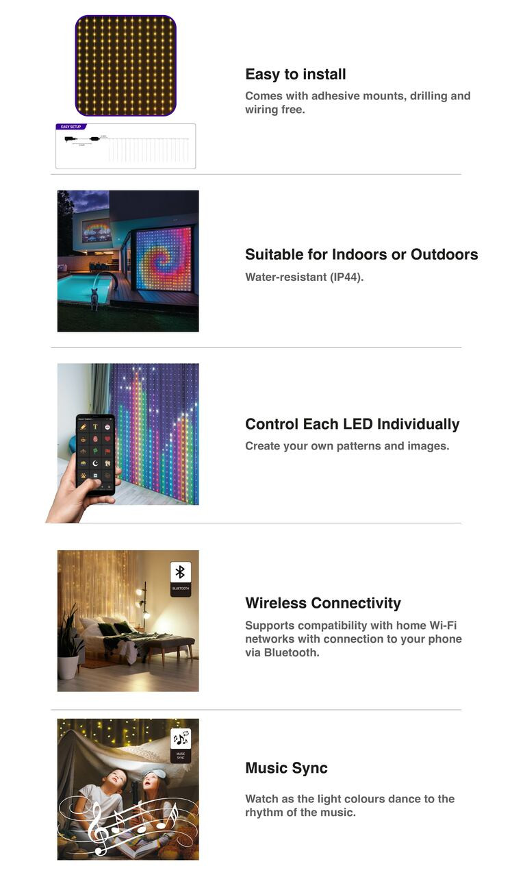 - Music Sync Mode Built-in microphone allows the LED strip to react to sound, creating dynamic effects for music and movies.