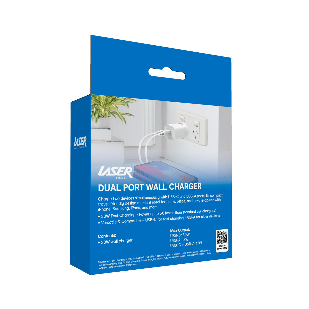 Charge smarter with the Laser USB-A and USB-C 30W Wall Charger in White a compact, powerful solution for fast, efficient charging at home, in the office, or on the move.