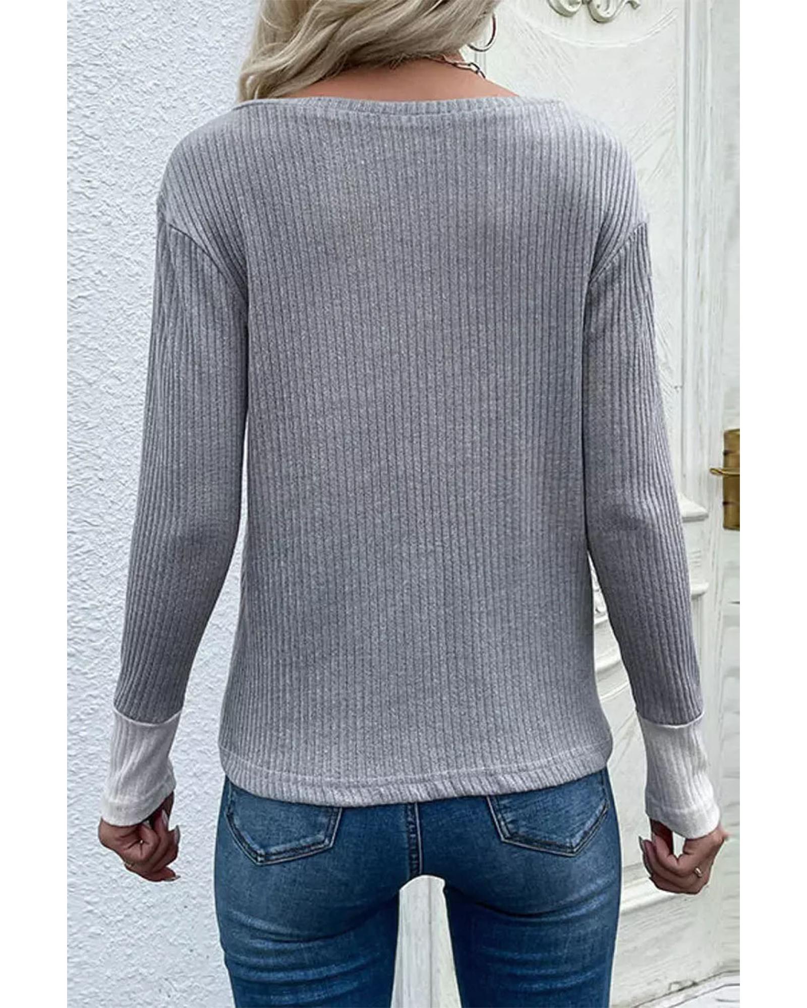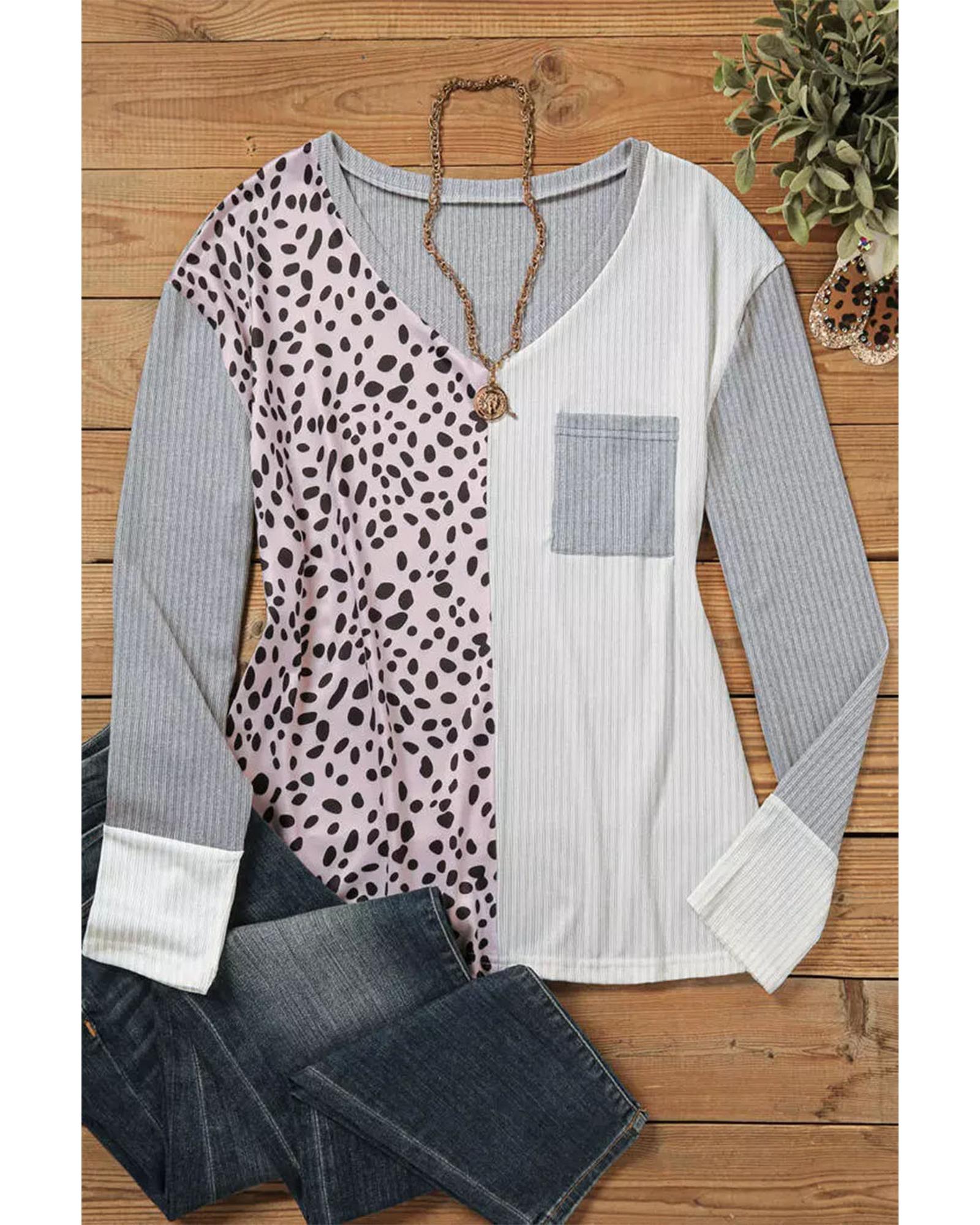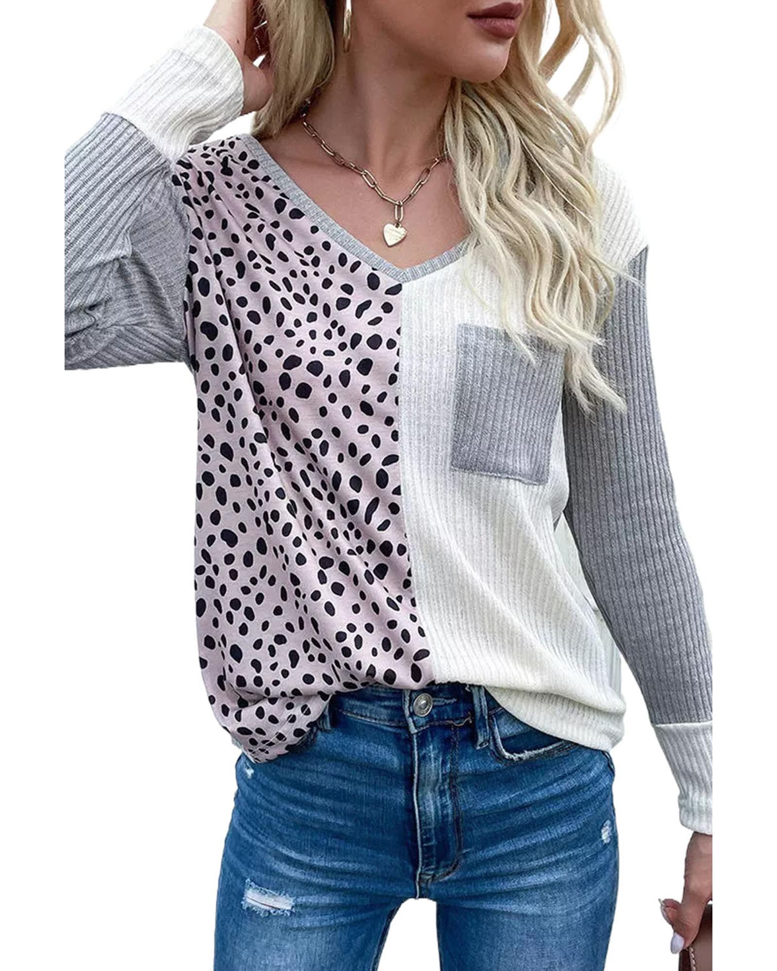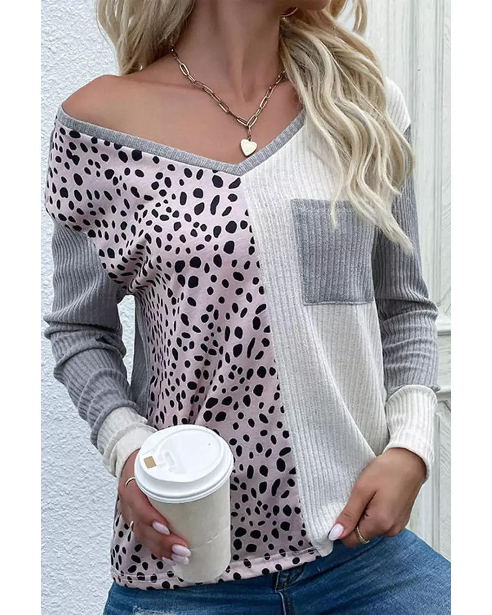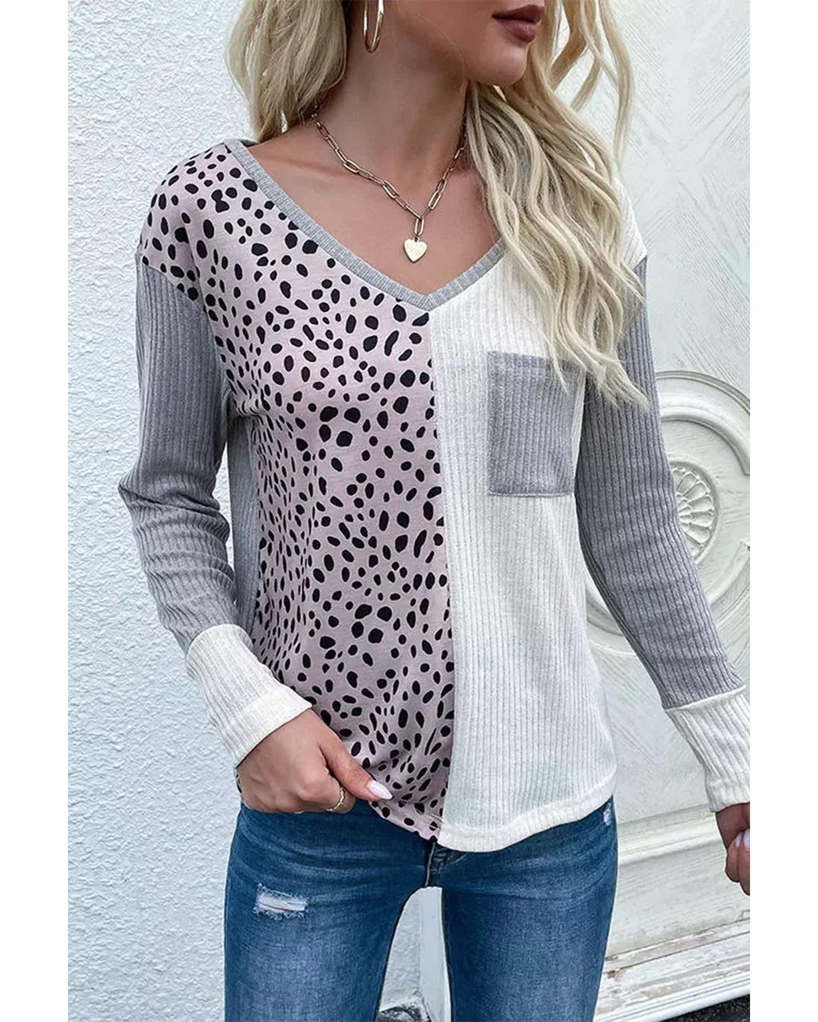 Leopard Patchwork Ribbed Color Block V Neck Top – XL