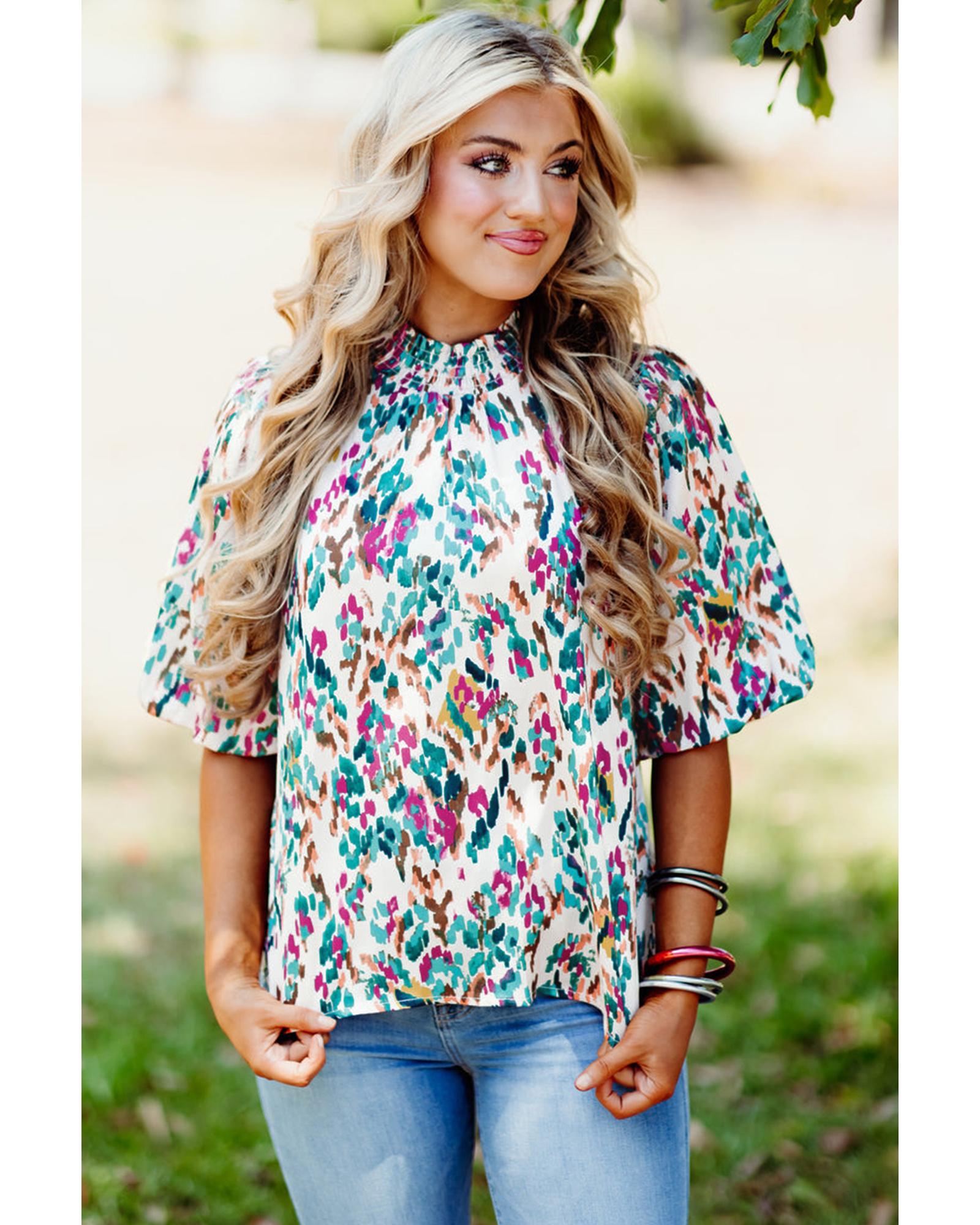 - Light Blue Abstract Print Puff Sleeve Mock Neck Blouse