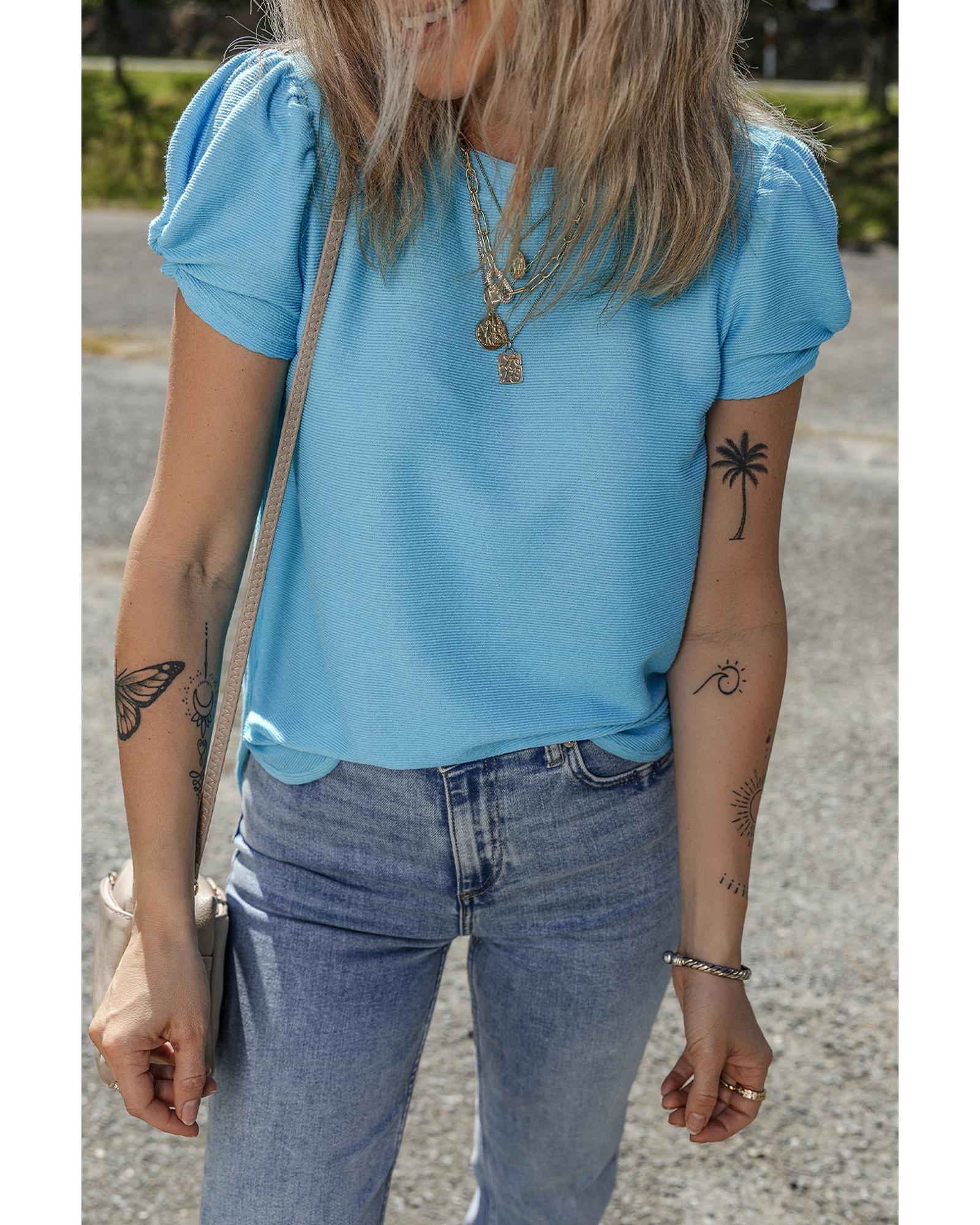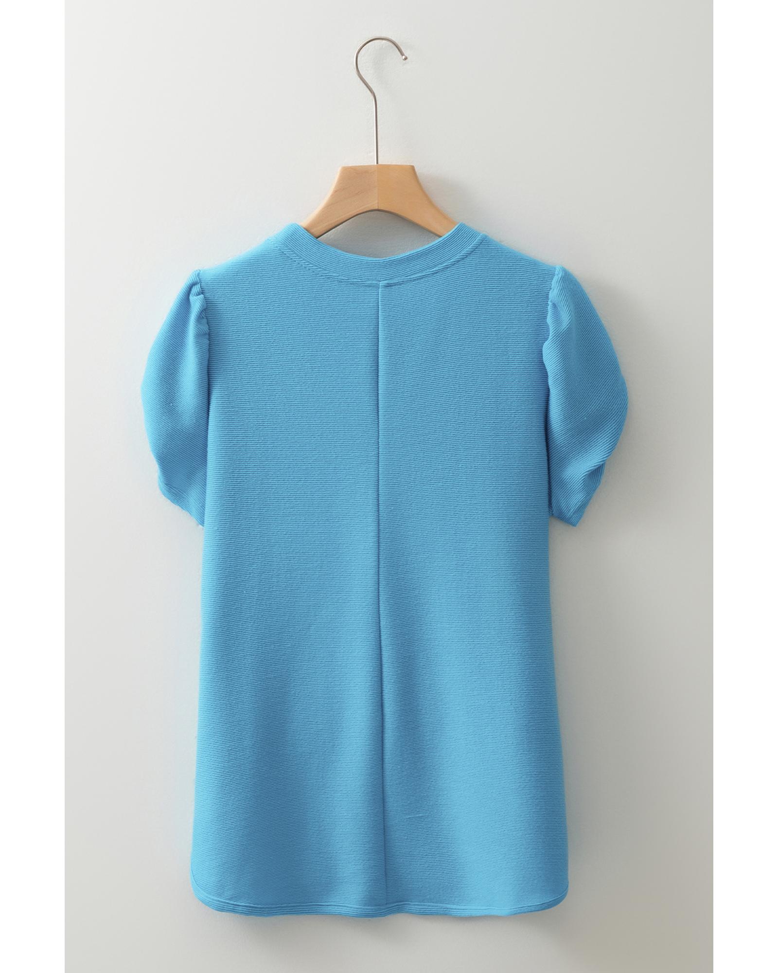 Light Blue Bubble Sleeve Solid Color Elegant T-Shirt – M