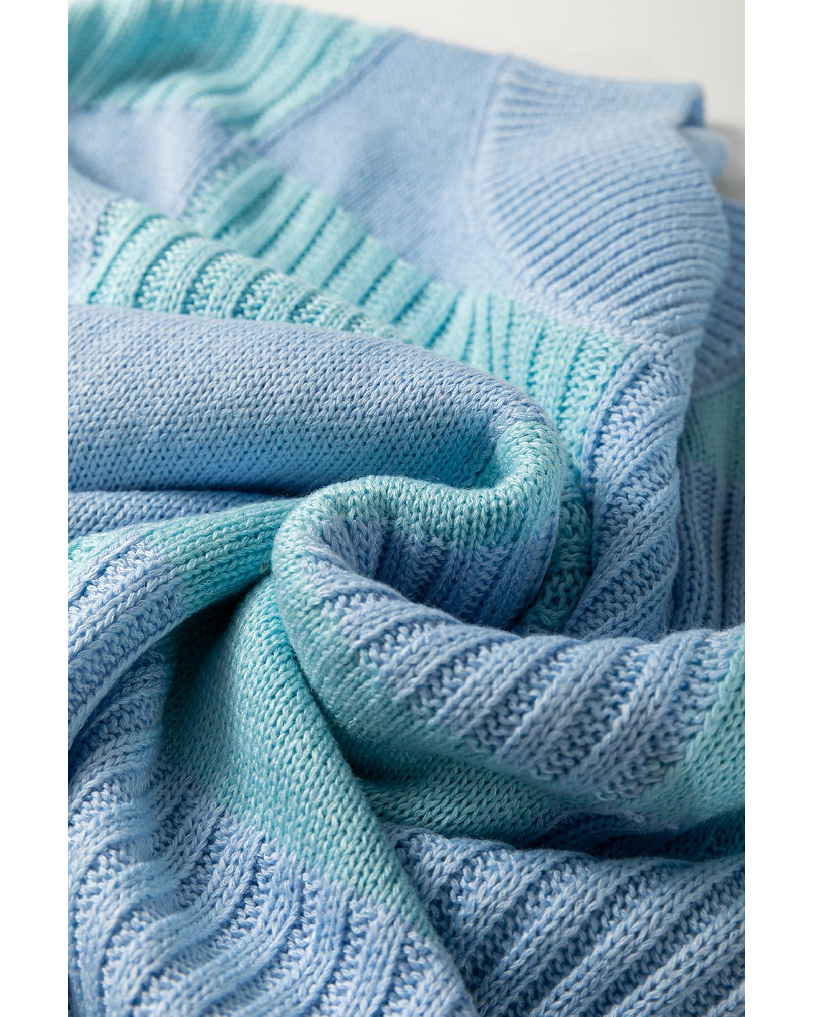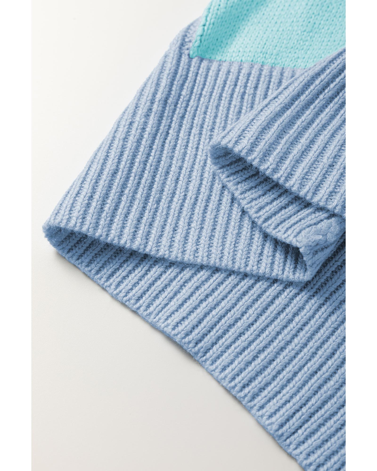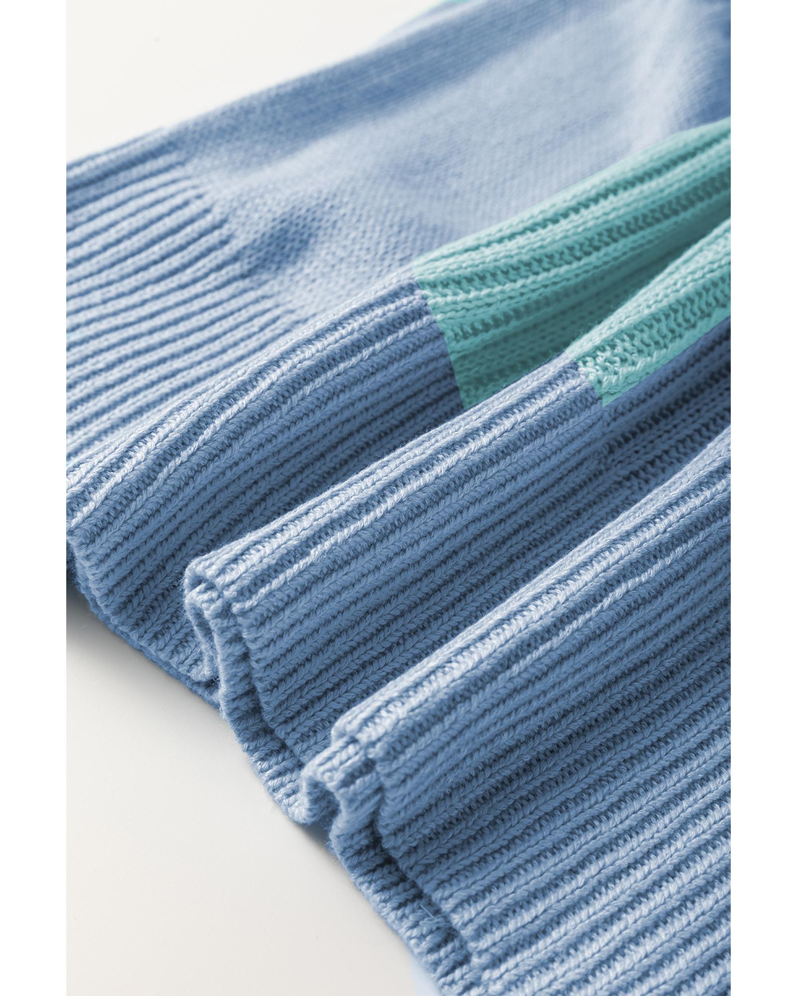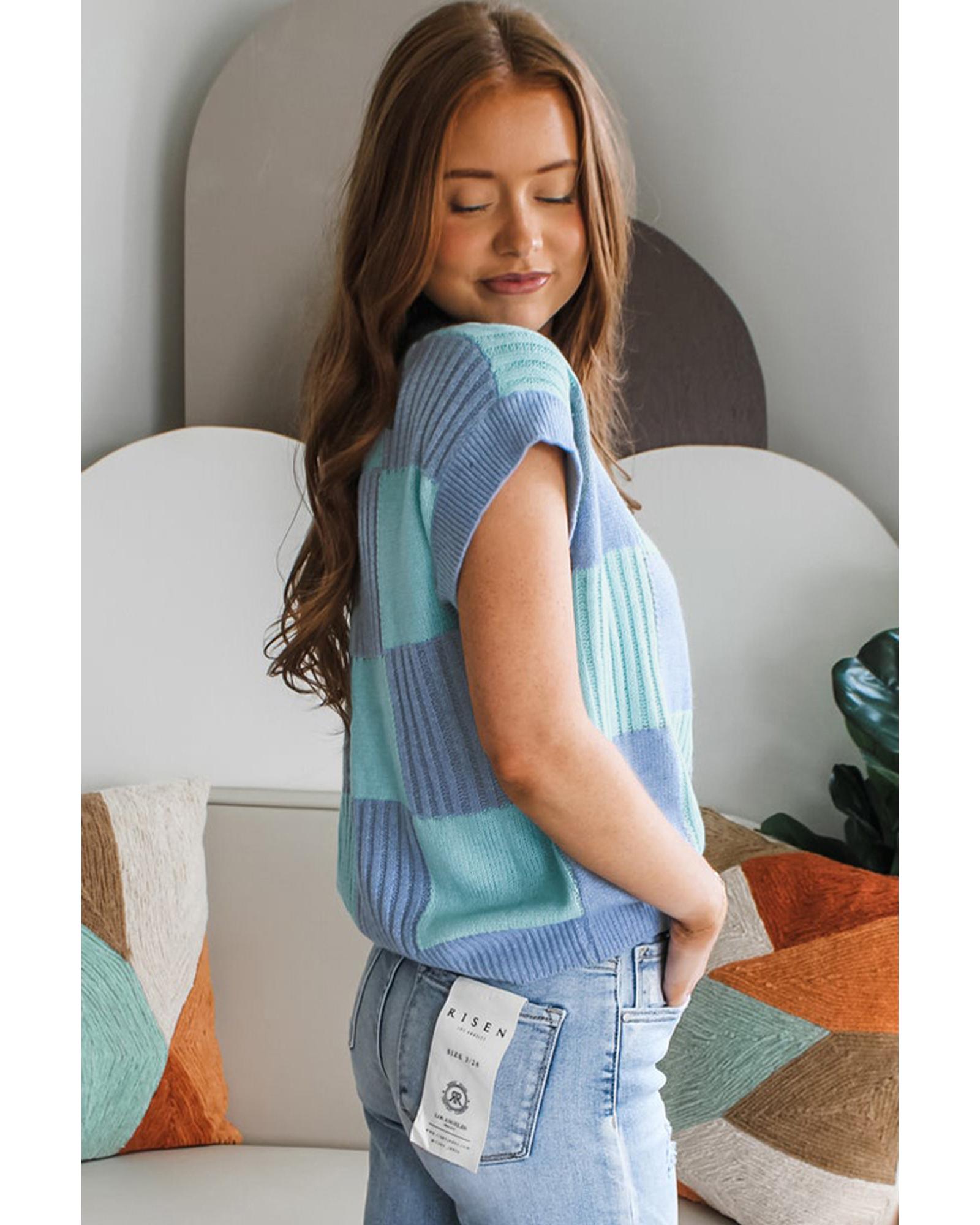 Light Blue Checkered Color Block Crew Neck Short Sleeve Sweater – L