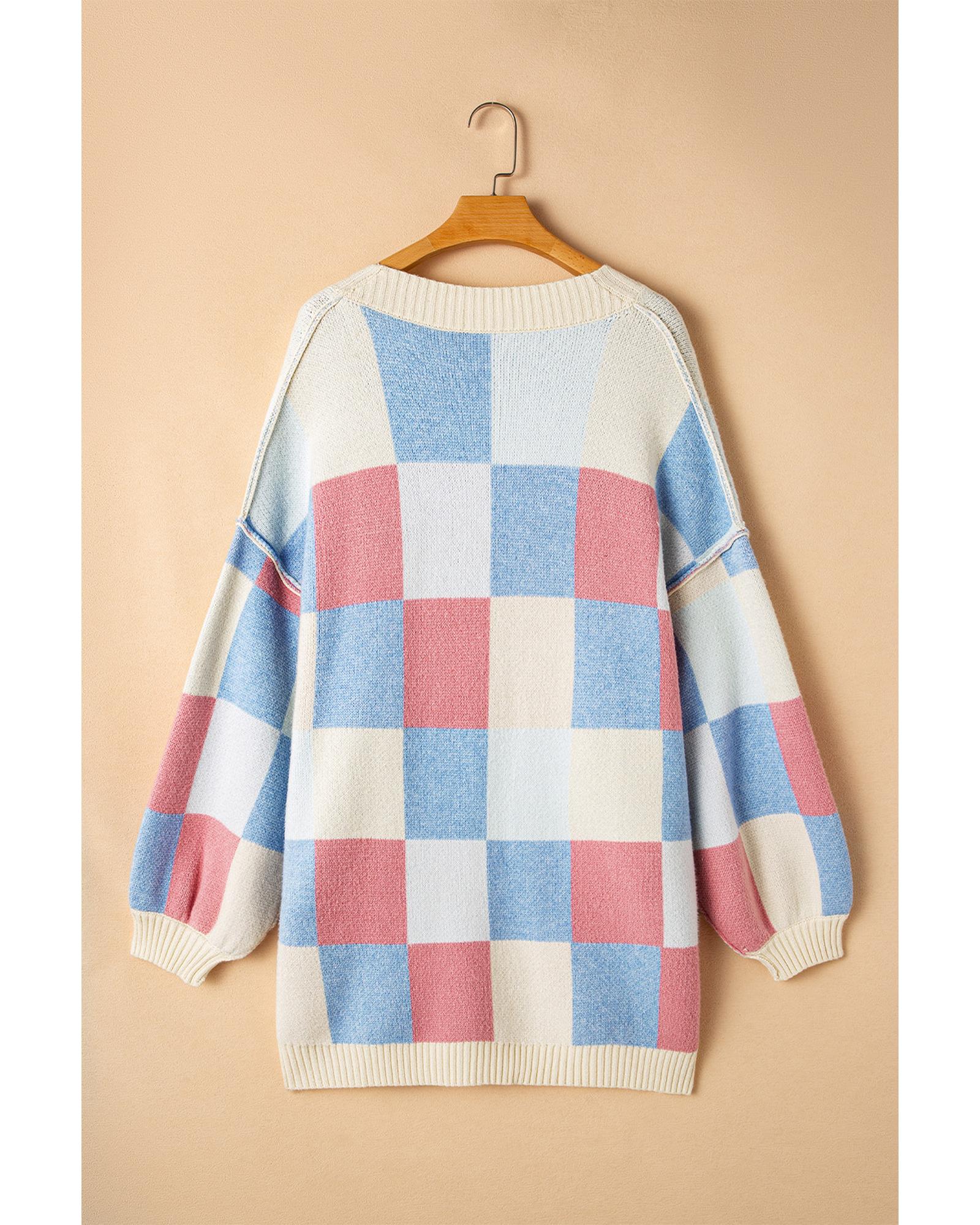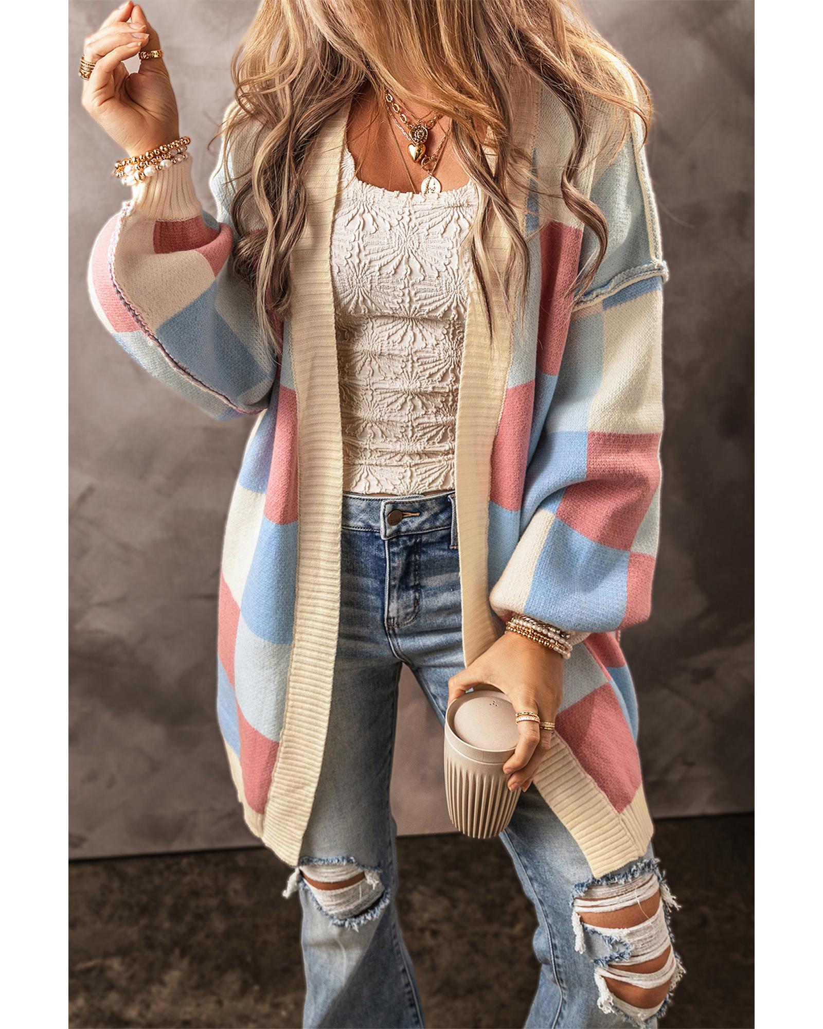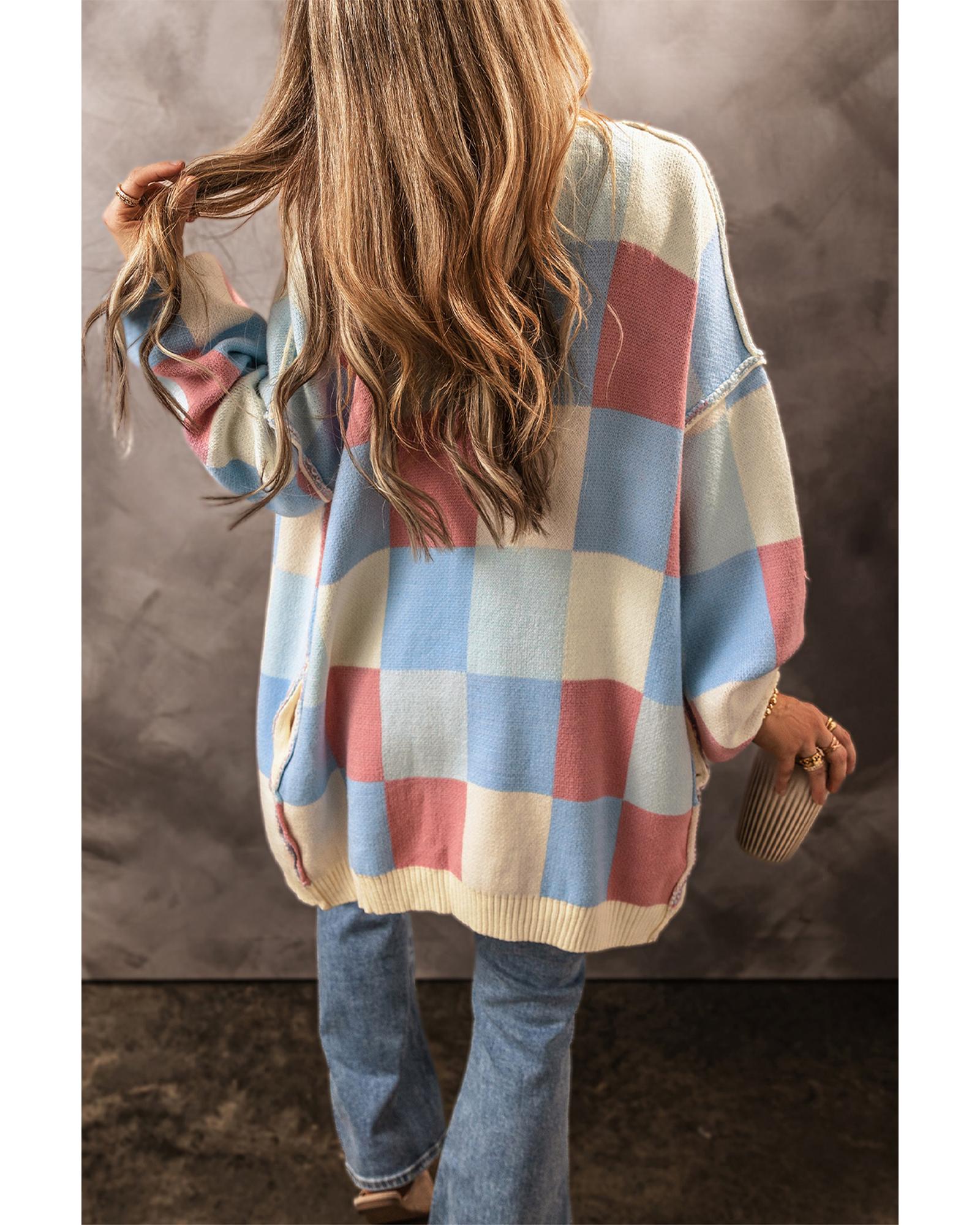 Light Blue Checkered Drop Shoulder Exposed Seam Open Front Cardigan – XL