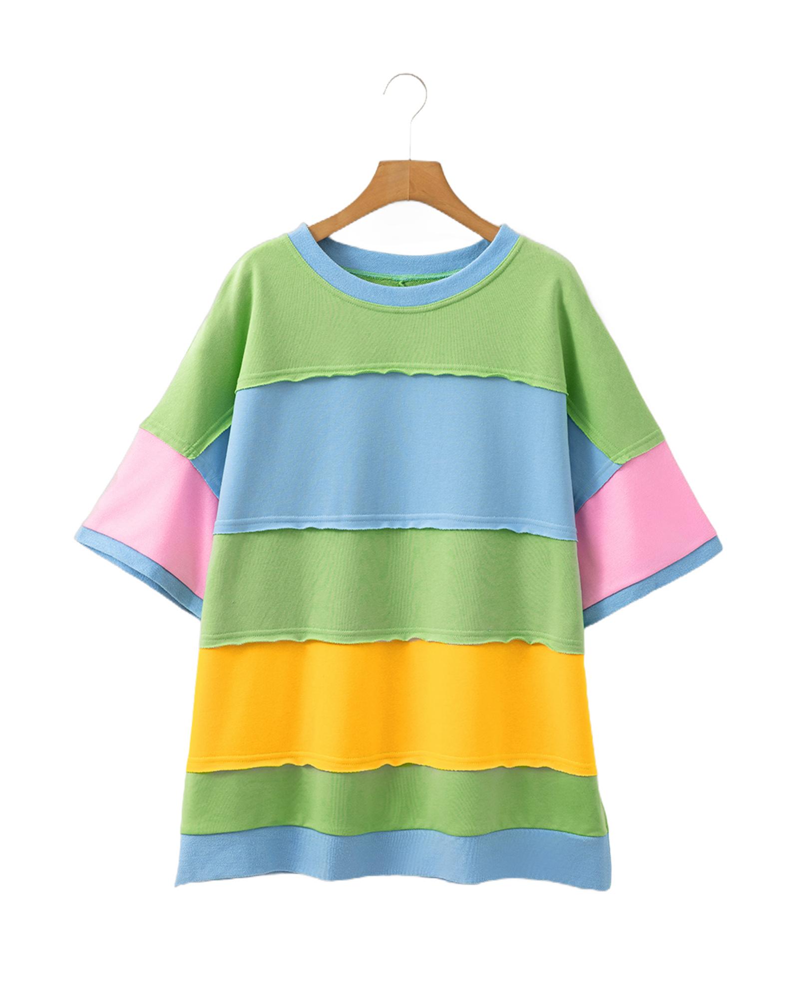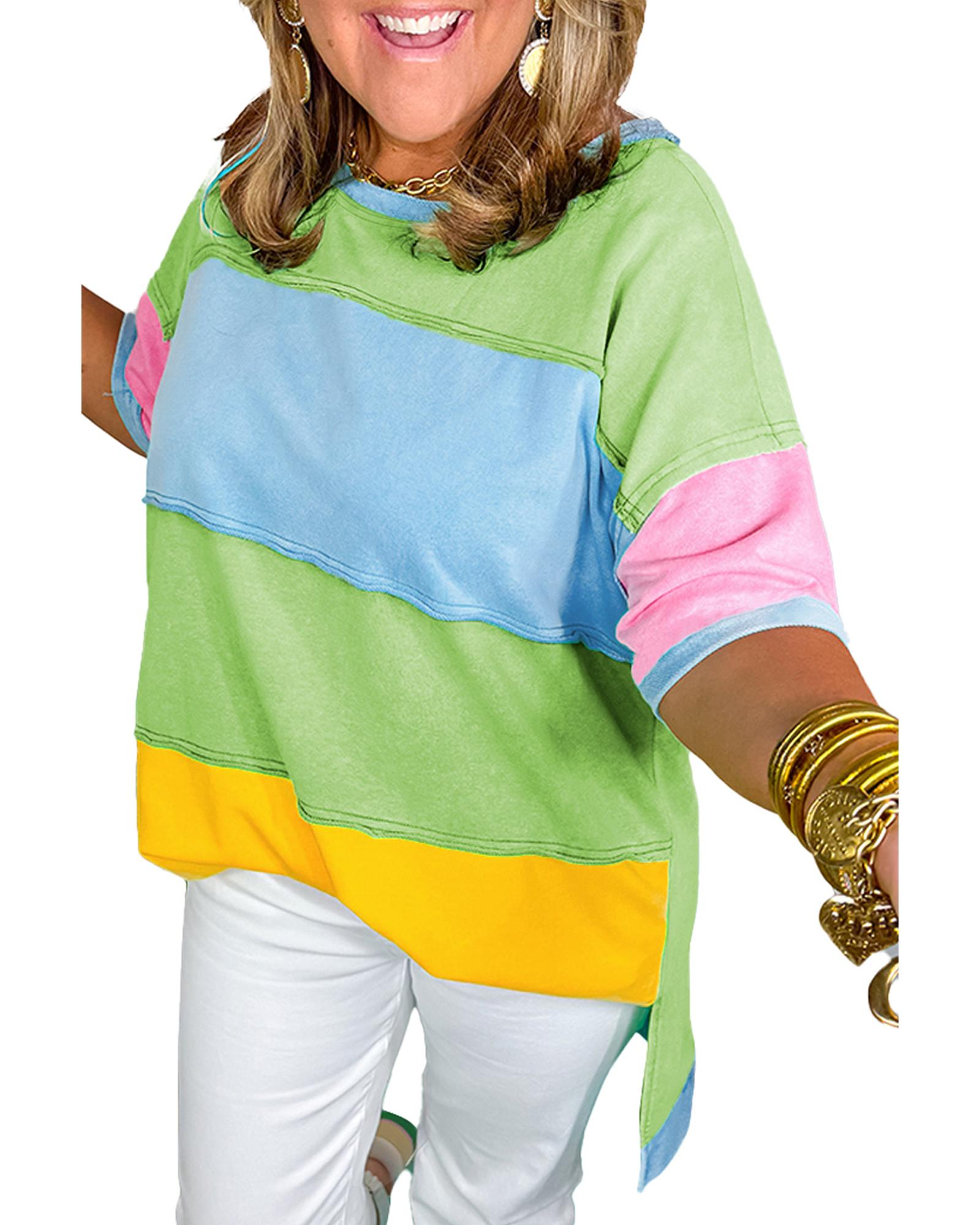 Light Blue Color Block Exposed Seam Patchwork Plus Size T Shirt – 2X