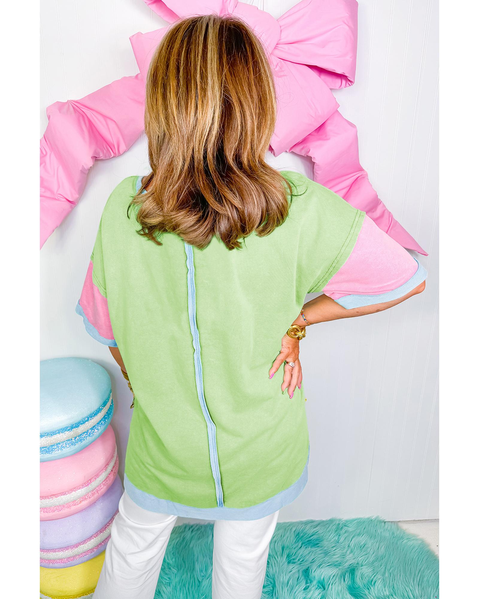 Light Blue Color Block Exposed Seam Patchwork Plus Size T Shirt – 3X