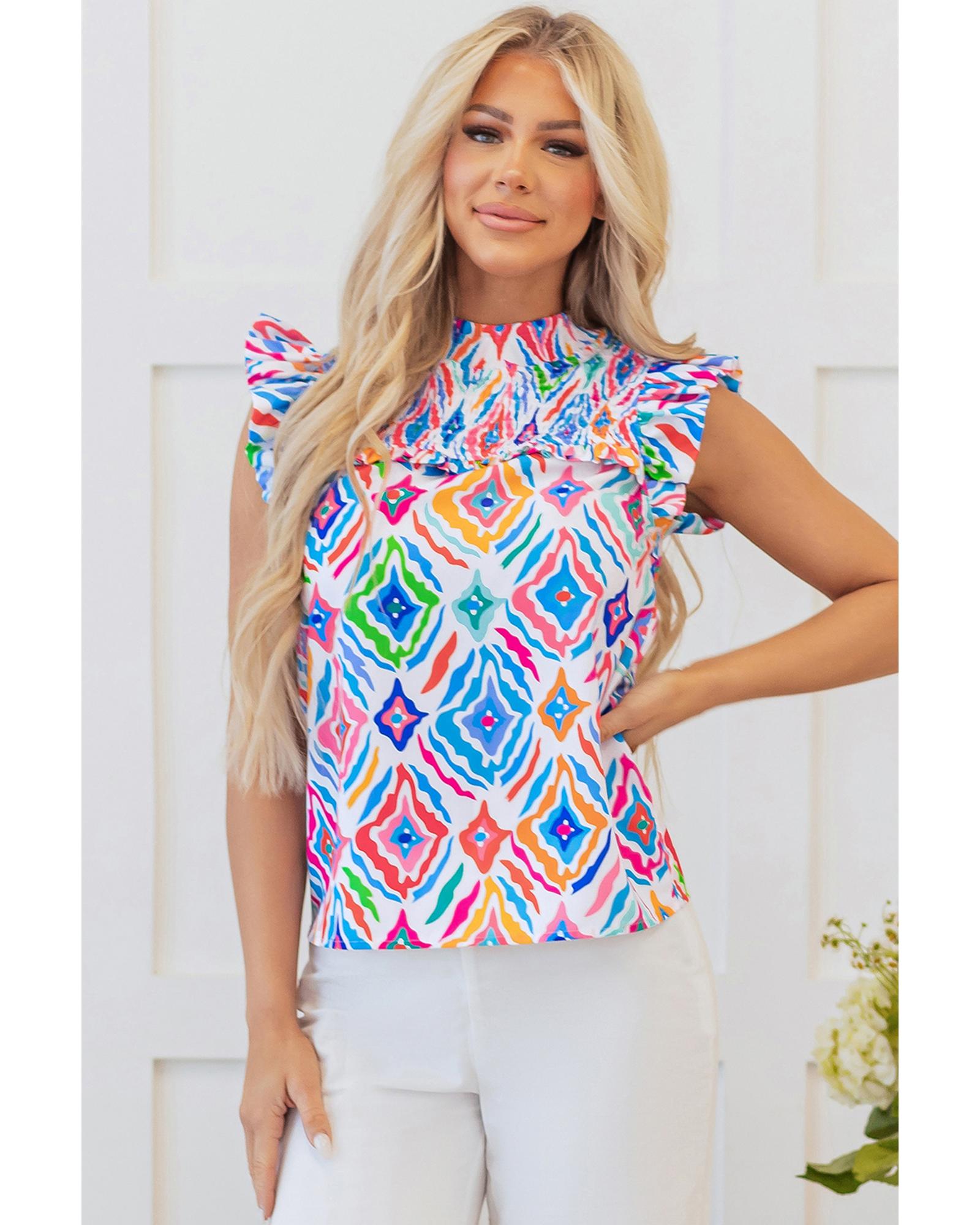 Light Blue Geometric Printed Flutter Sleeve Mock Neck Shirred Blouse – XL
