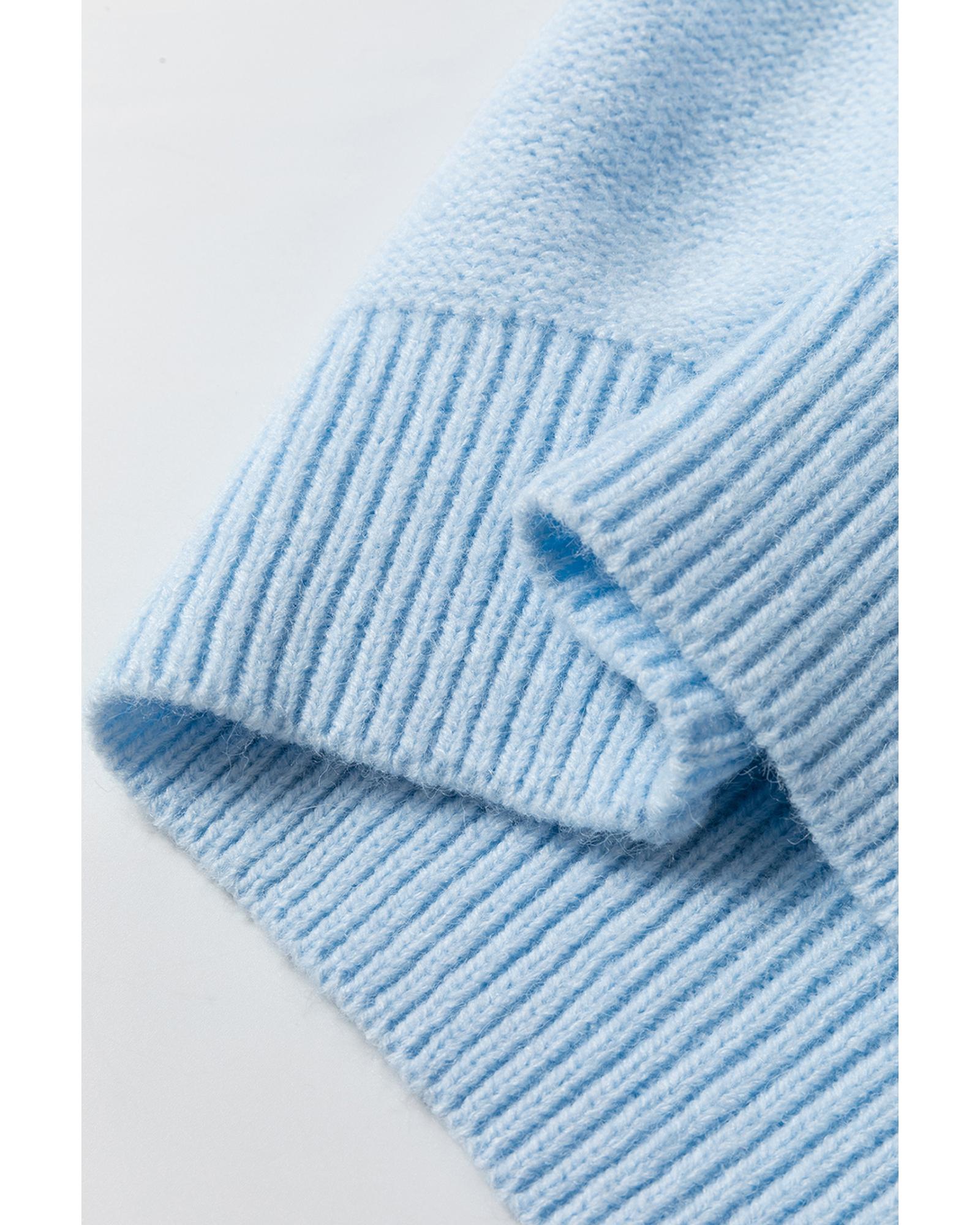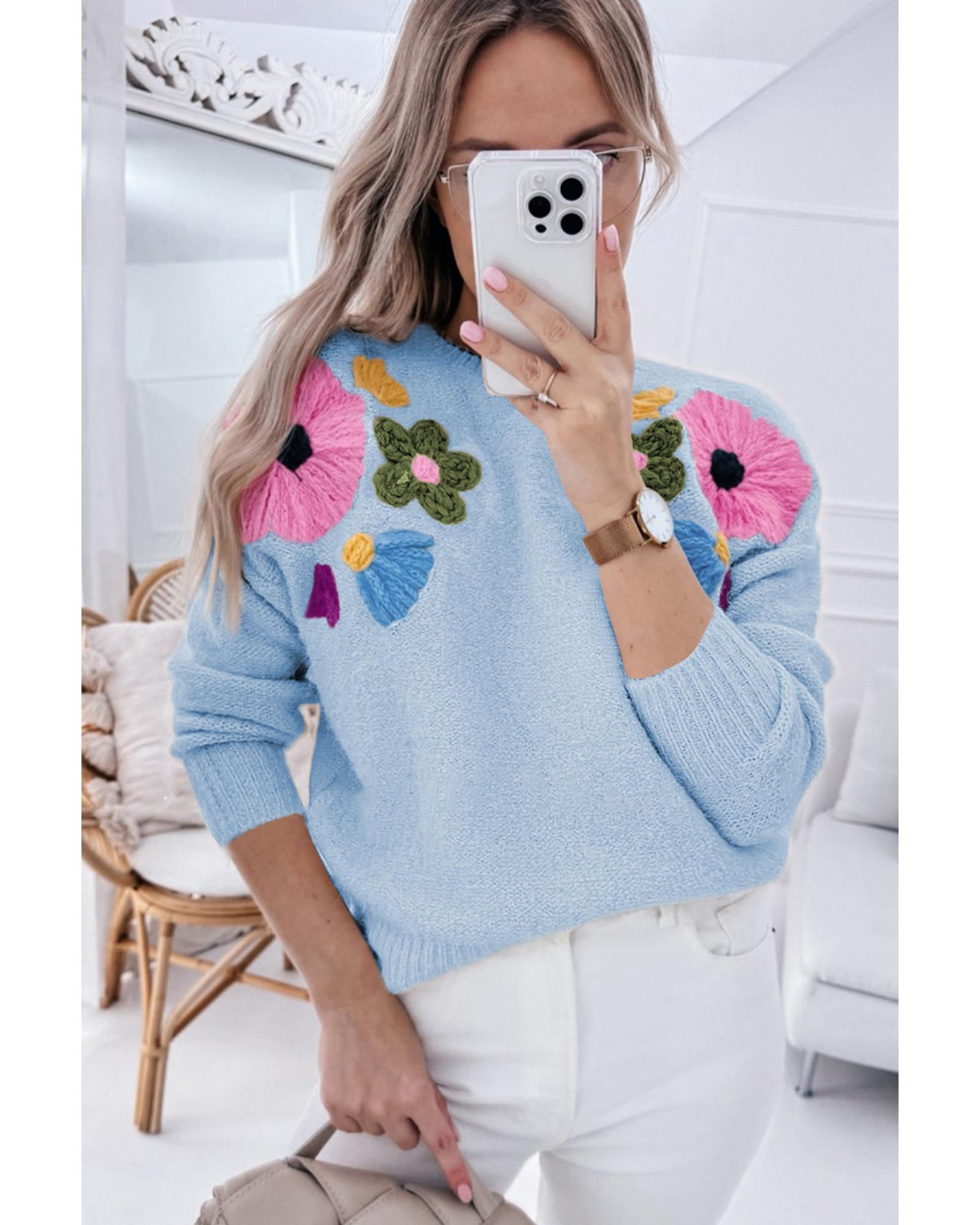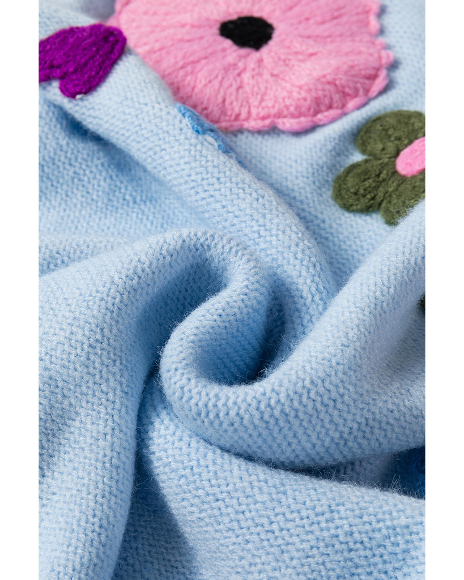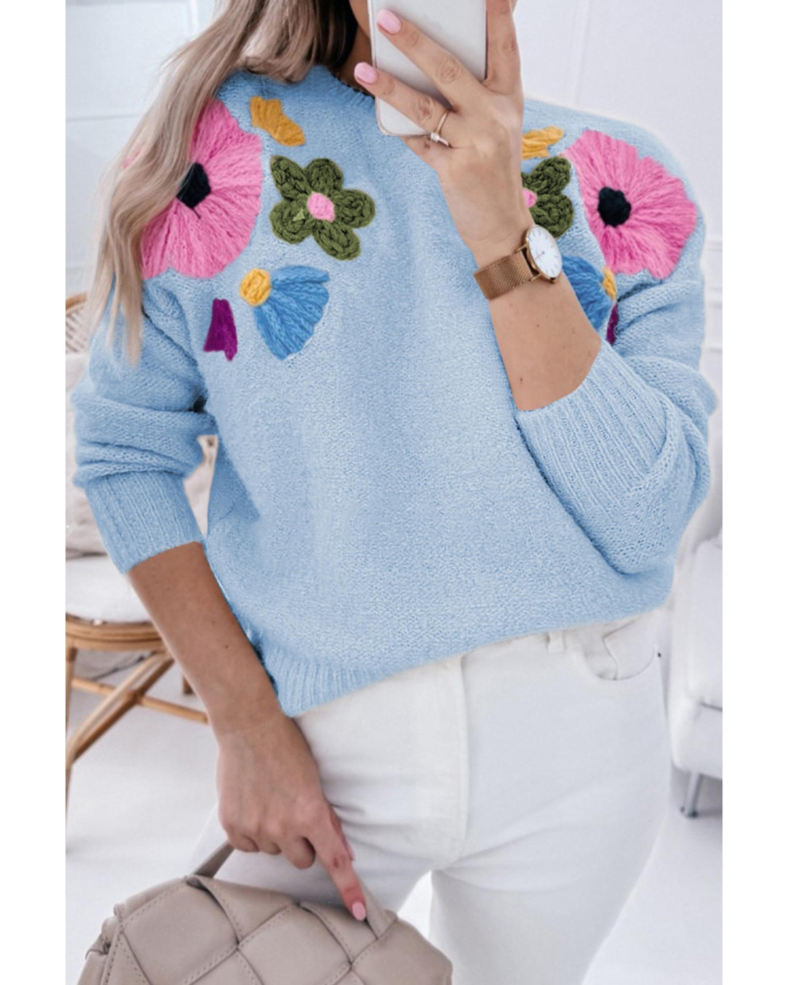 Light Blue Knitted Flower Pattern Ribbed Edge Sweater – L