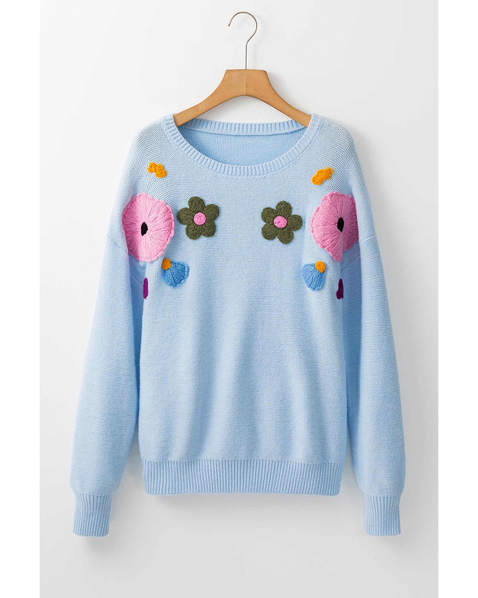Light Blue Knitted Flower Pattern Ribbed Edge Sweater – XL