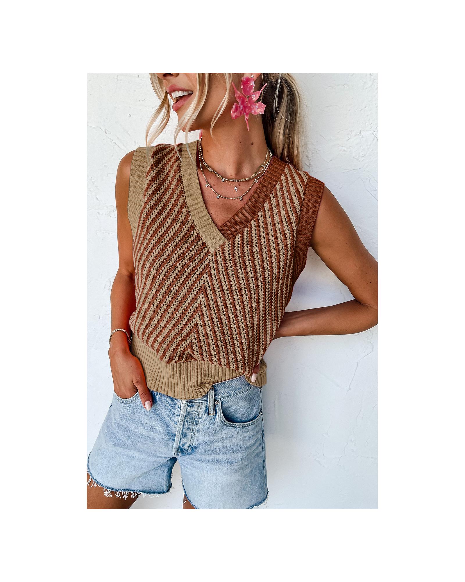 - Light French Beige Contrast Chevron Knit V Neck Sweater Vest