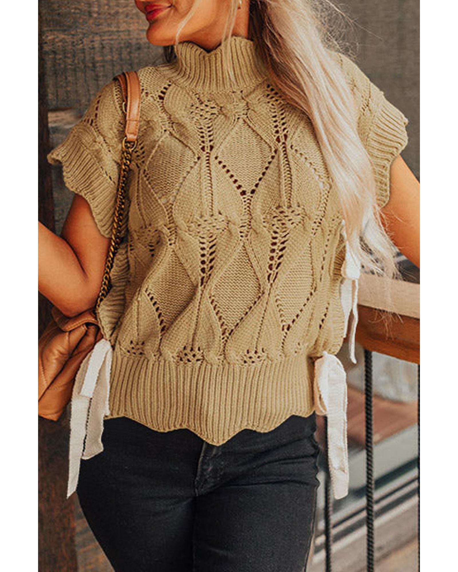 Light French Beige Hollowed Knit Scalloped Trim High Neck Sweater – M
