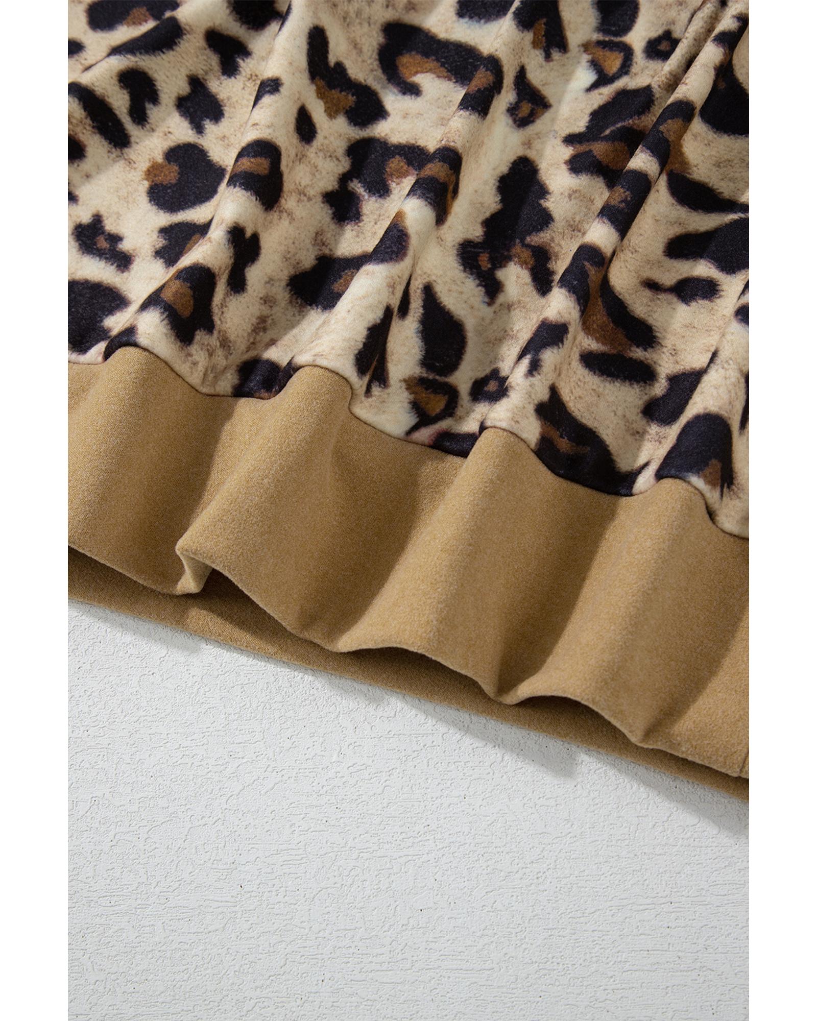 Light French Beige Leopard Print Patchwork Raglan Sleeve Half Buttons Hoodie – M