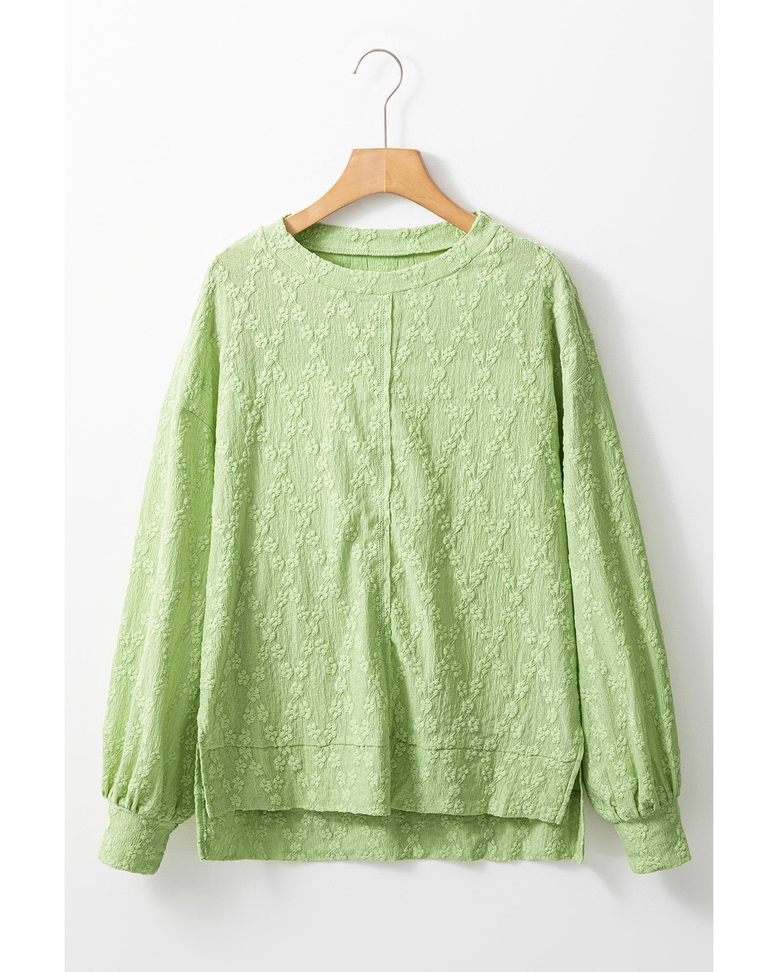 Light Green Solid Color Textured Side Split Crew Neck Blouse – S