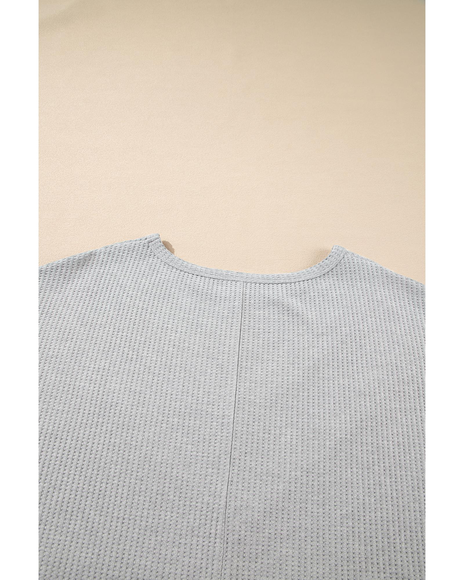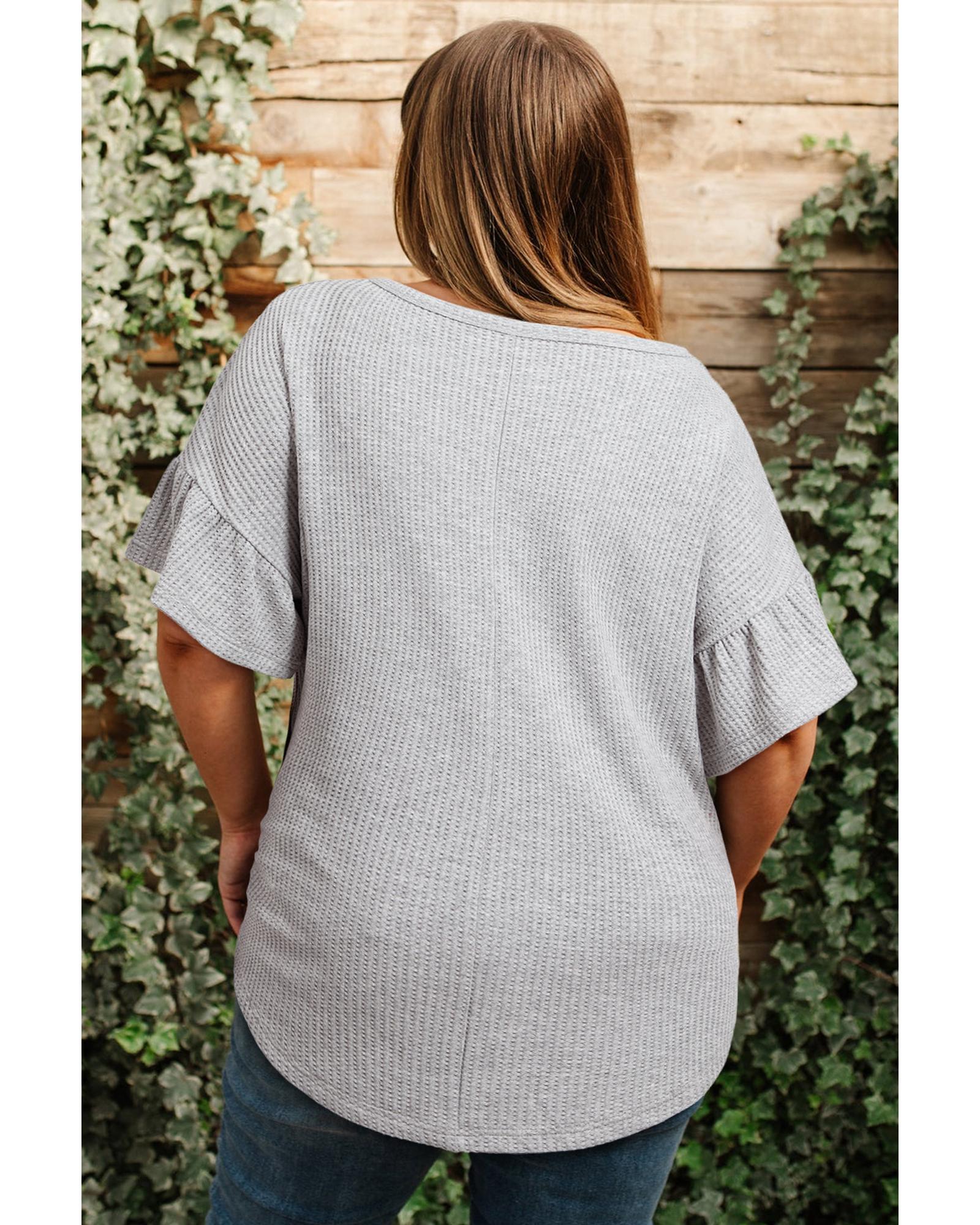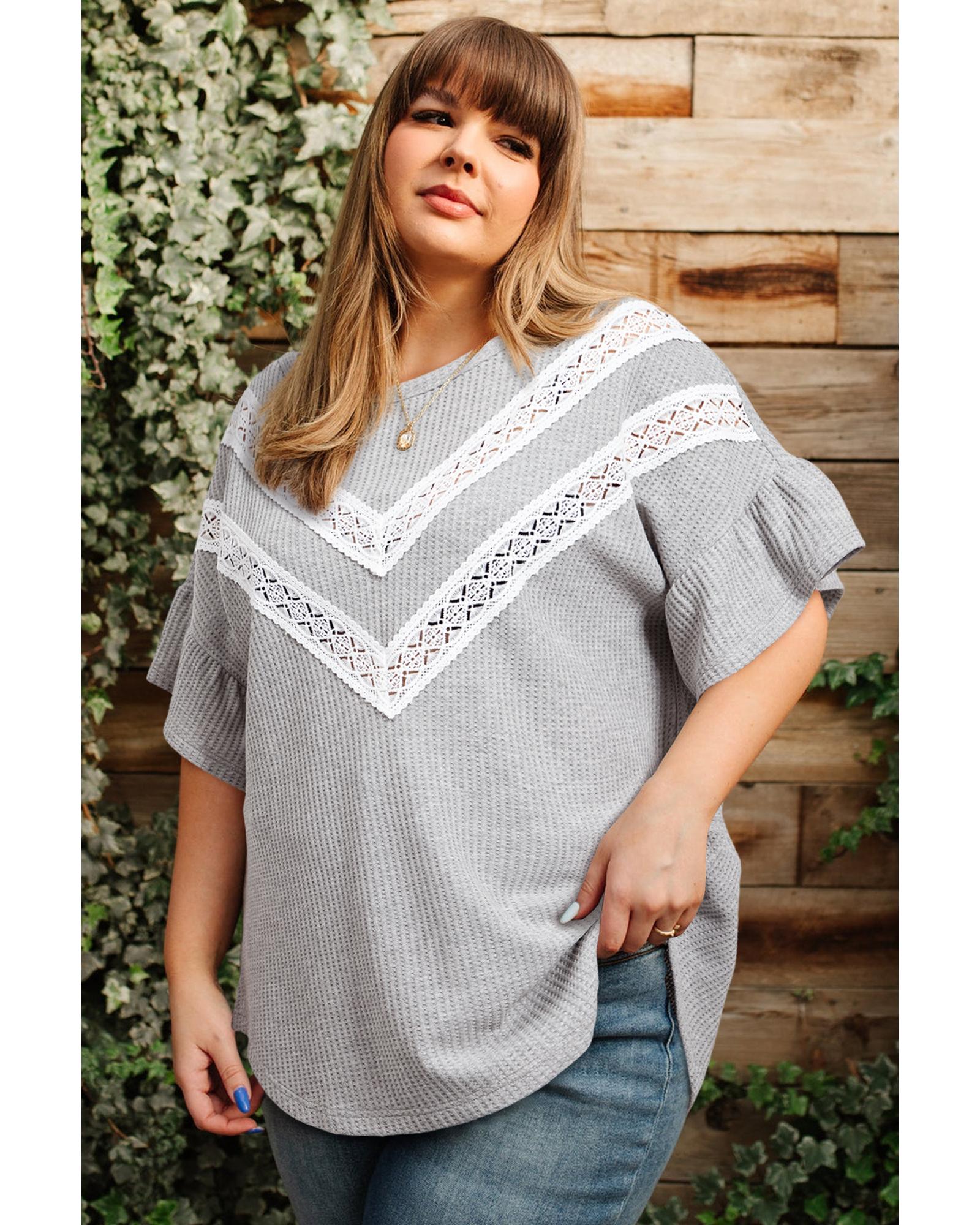 Light Grey Lace Insert Waffle Ruffle Short Sleeve Plus Size Top – 4X