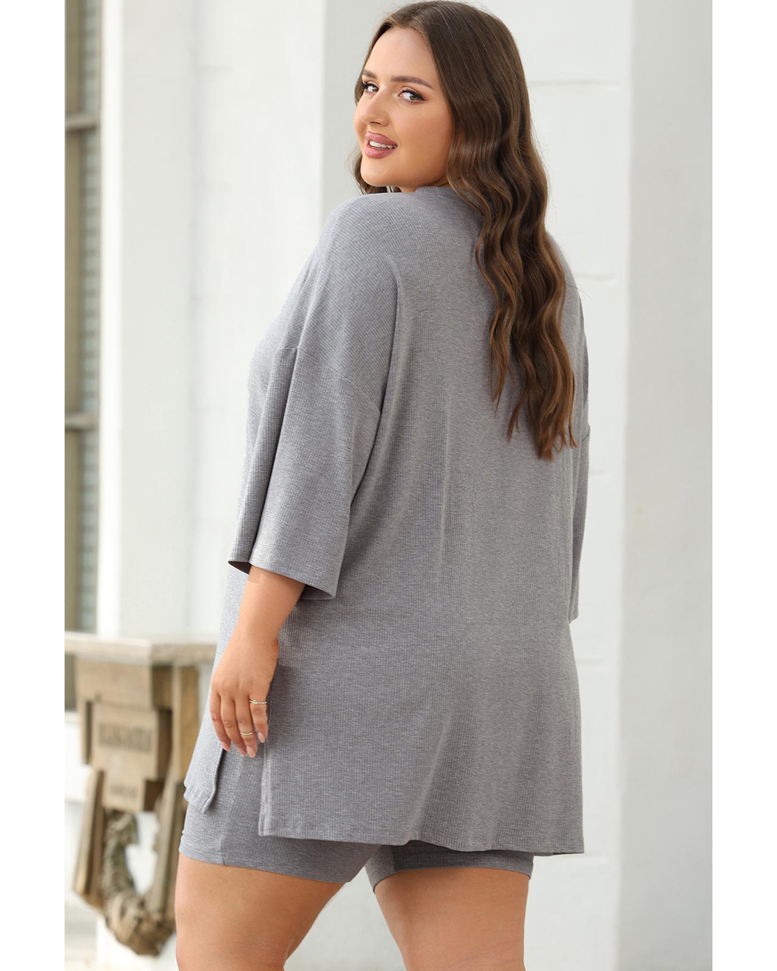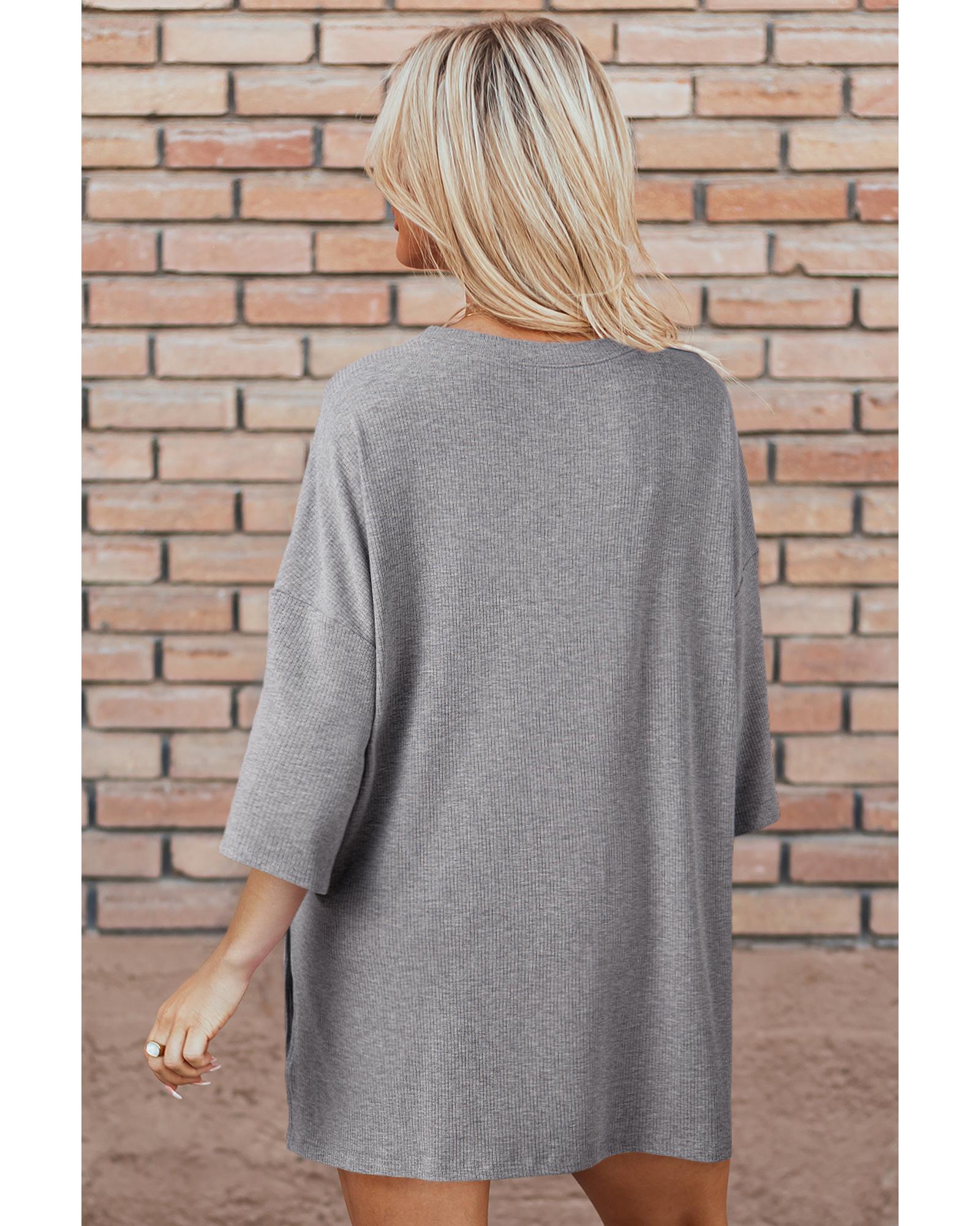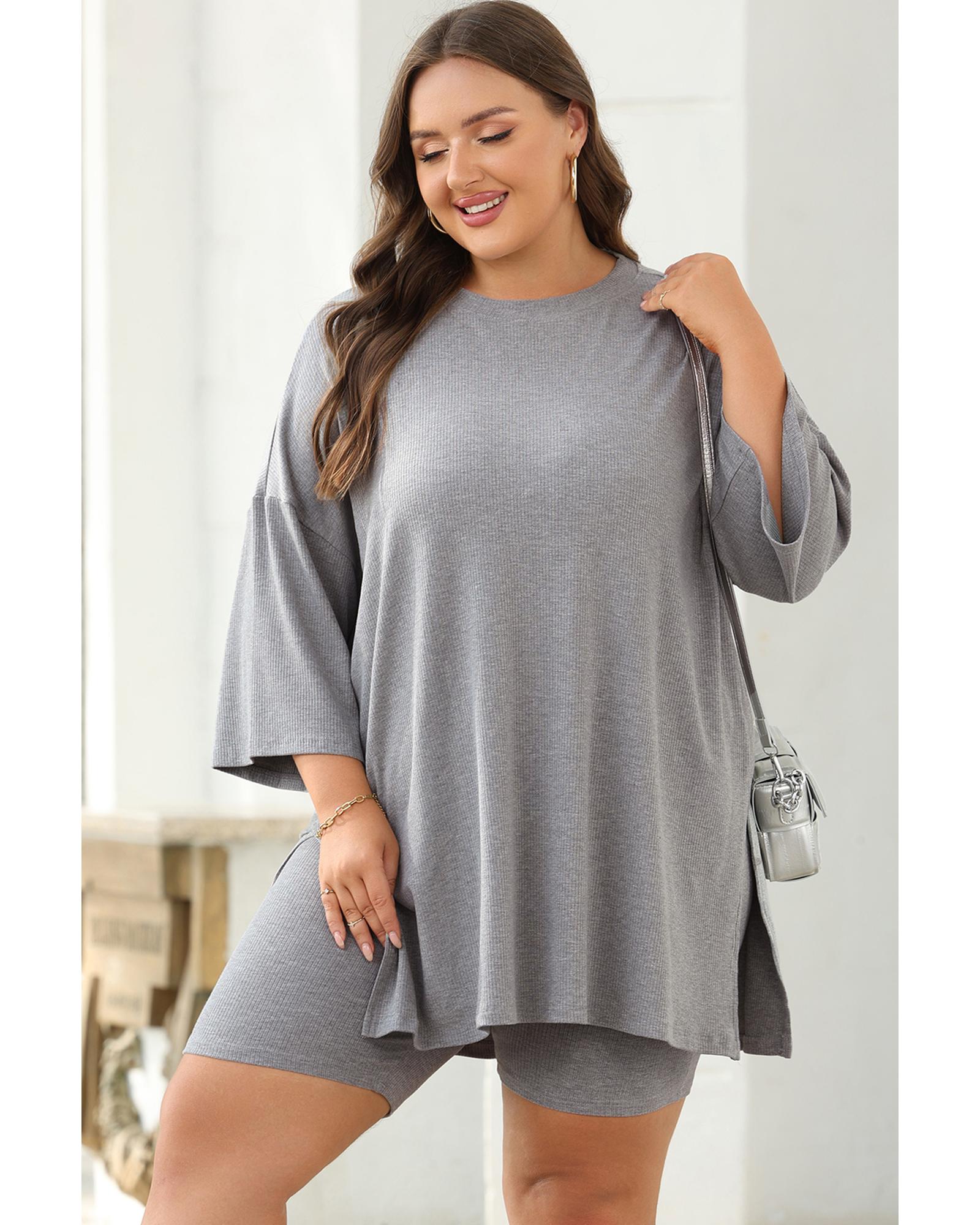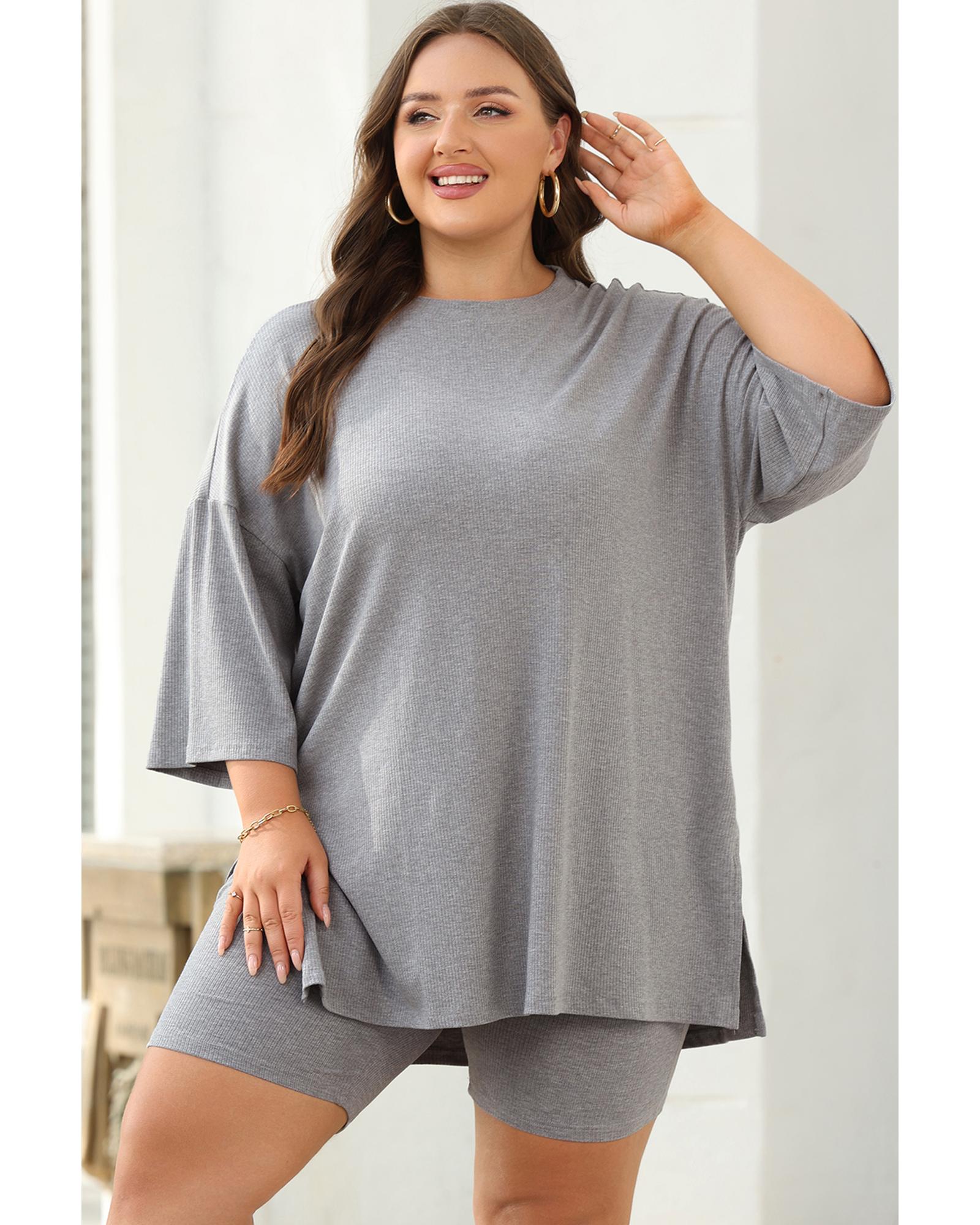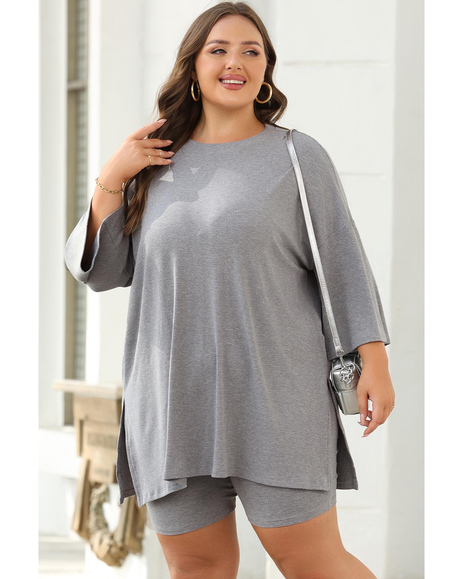 Light Grey Solid Color Loose Tunic Top and Slim Shorts Set – S