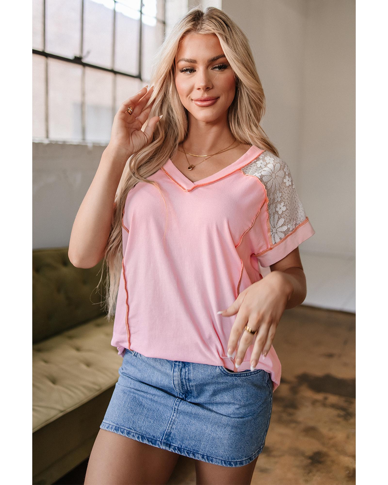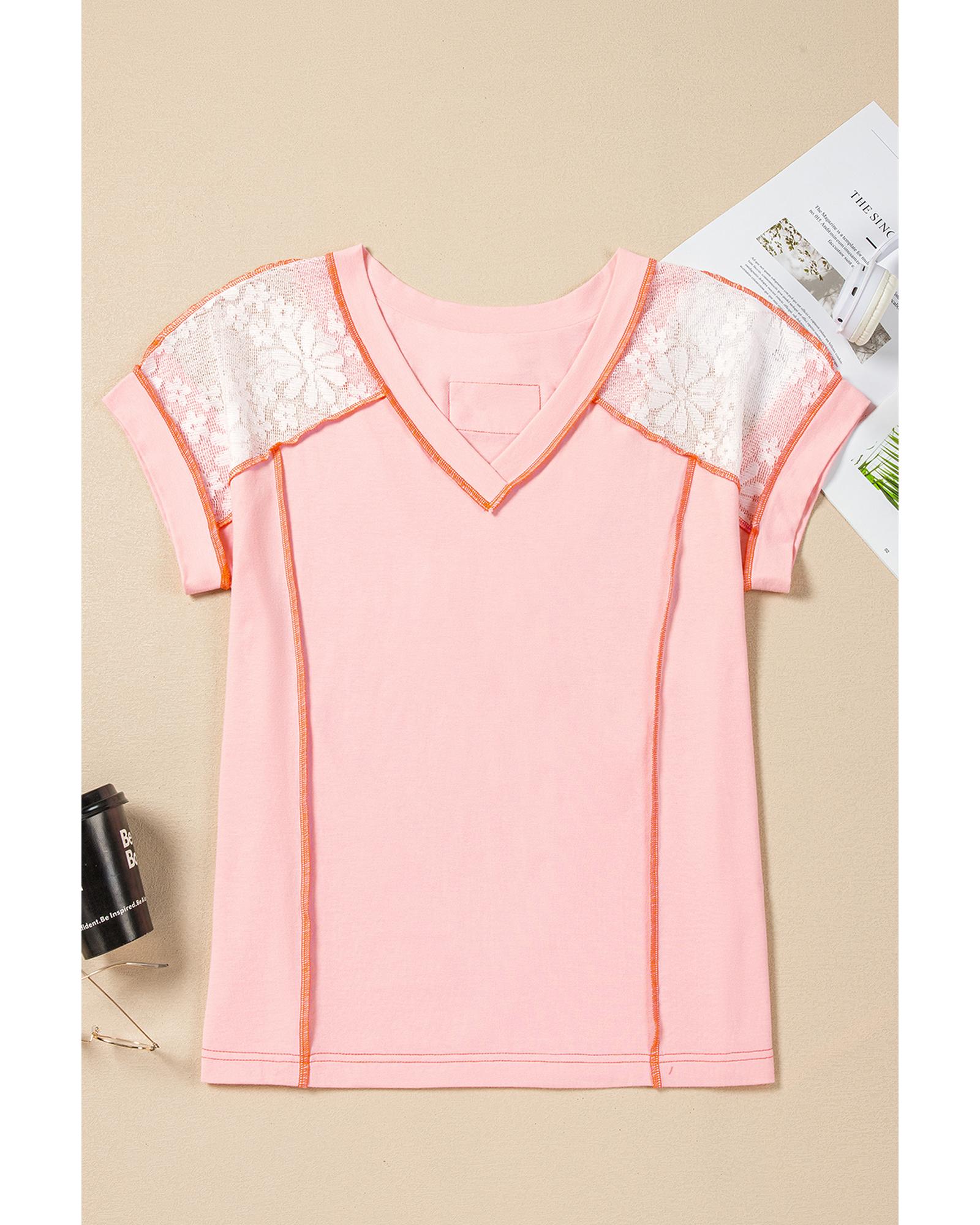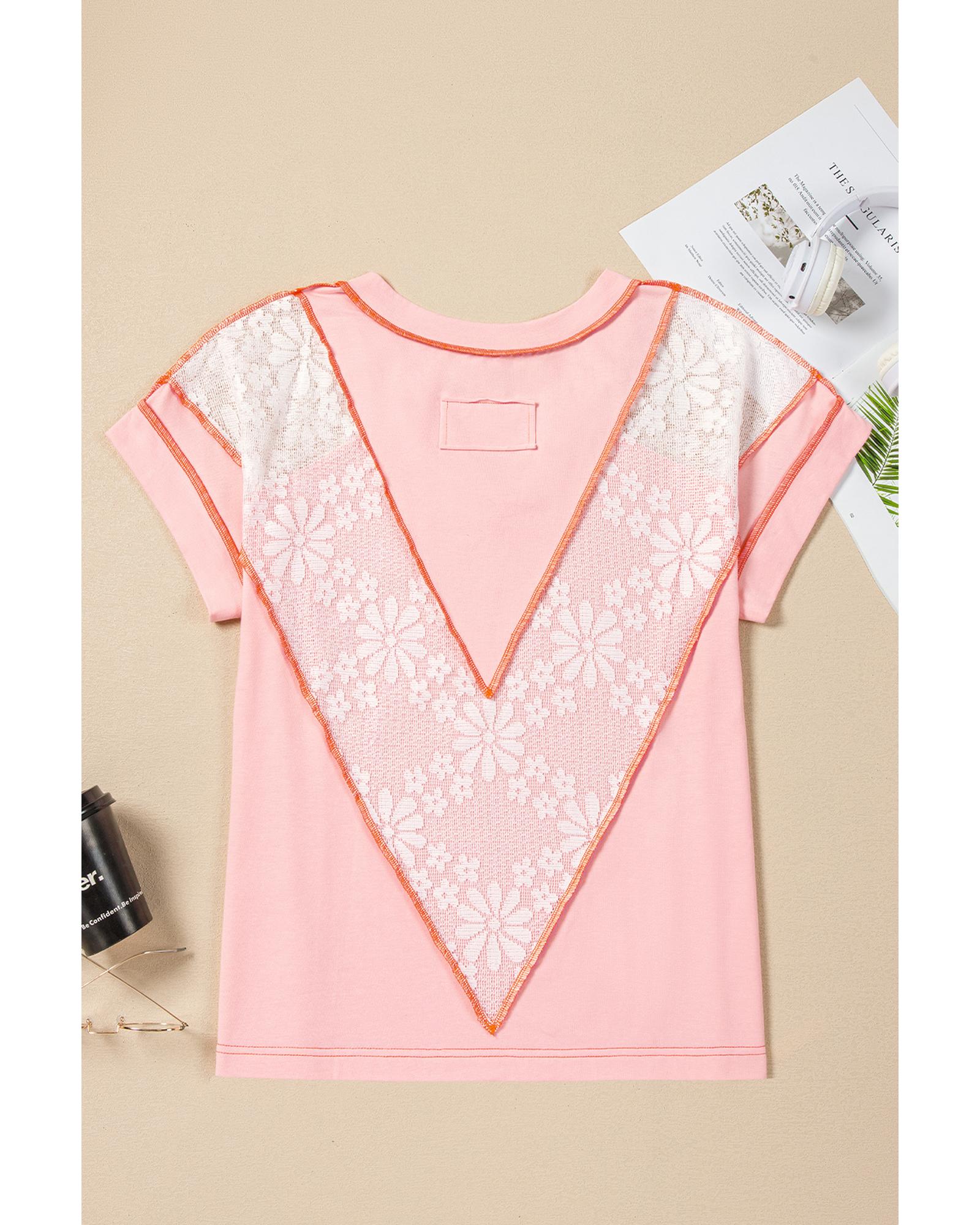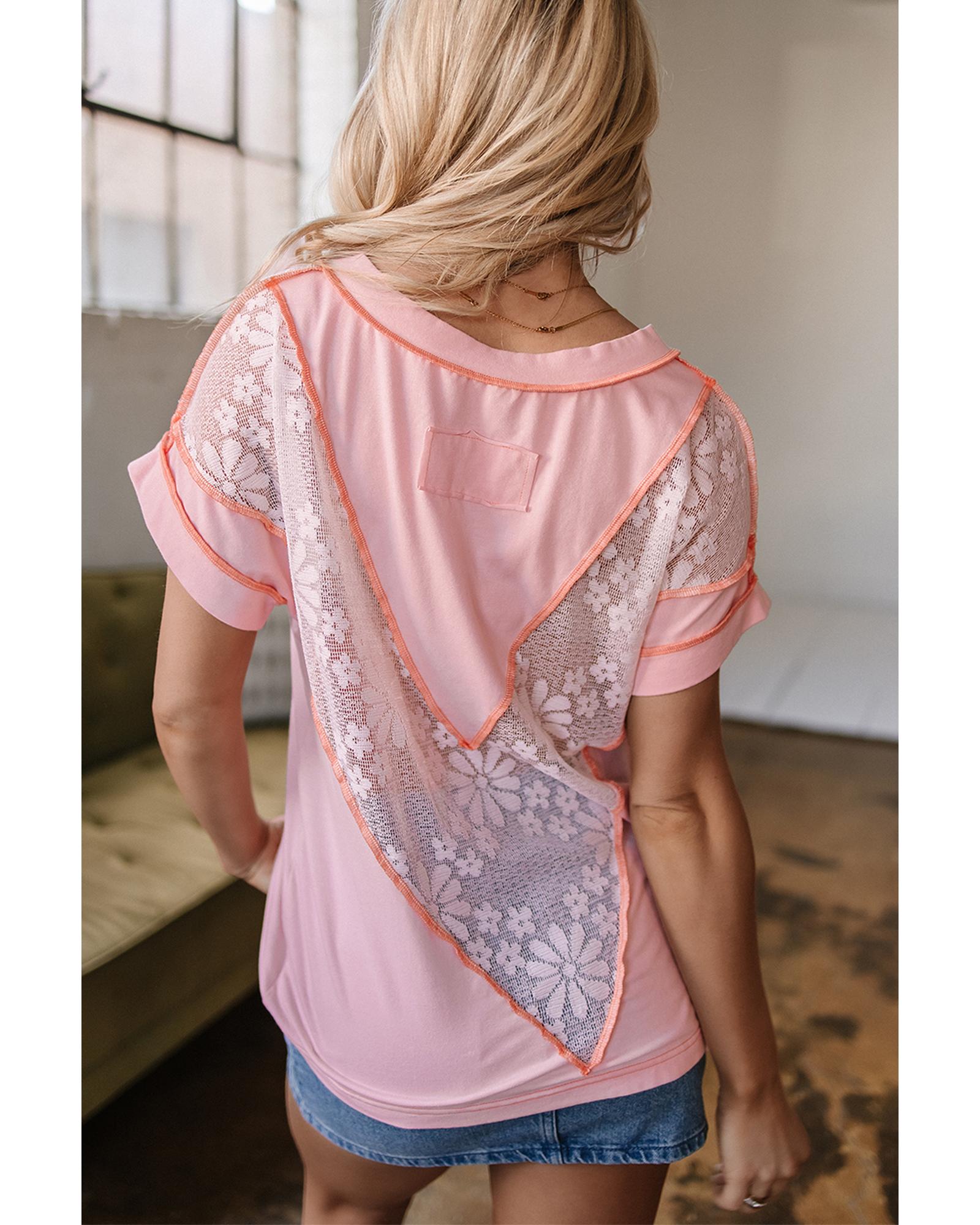 Light Pink Lace Patchwork Exposed Seam V Neck T Shirt – L