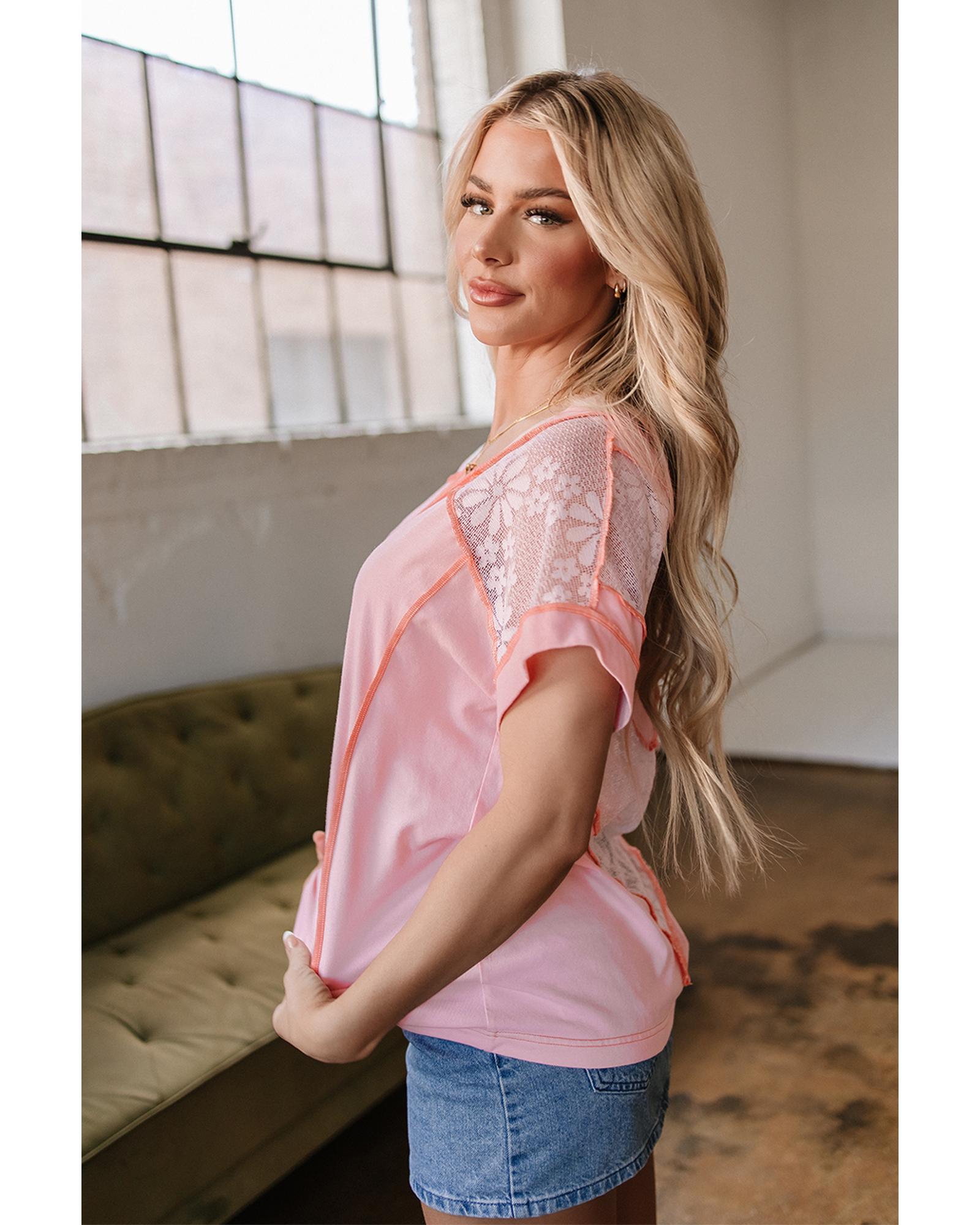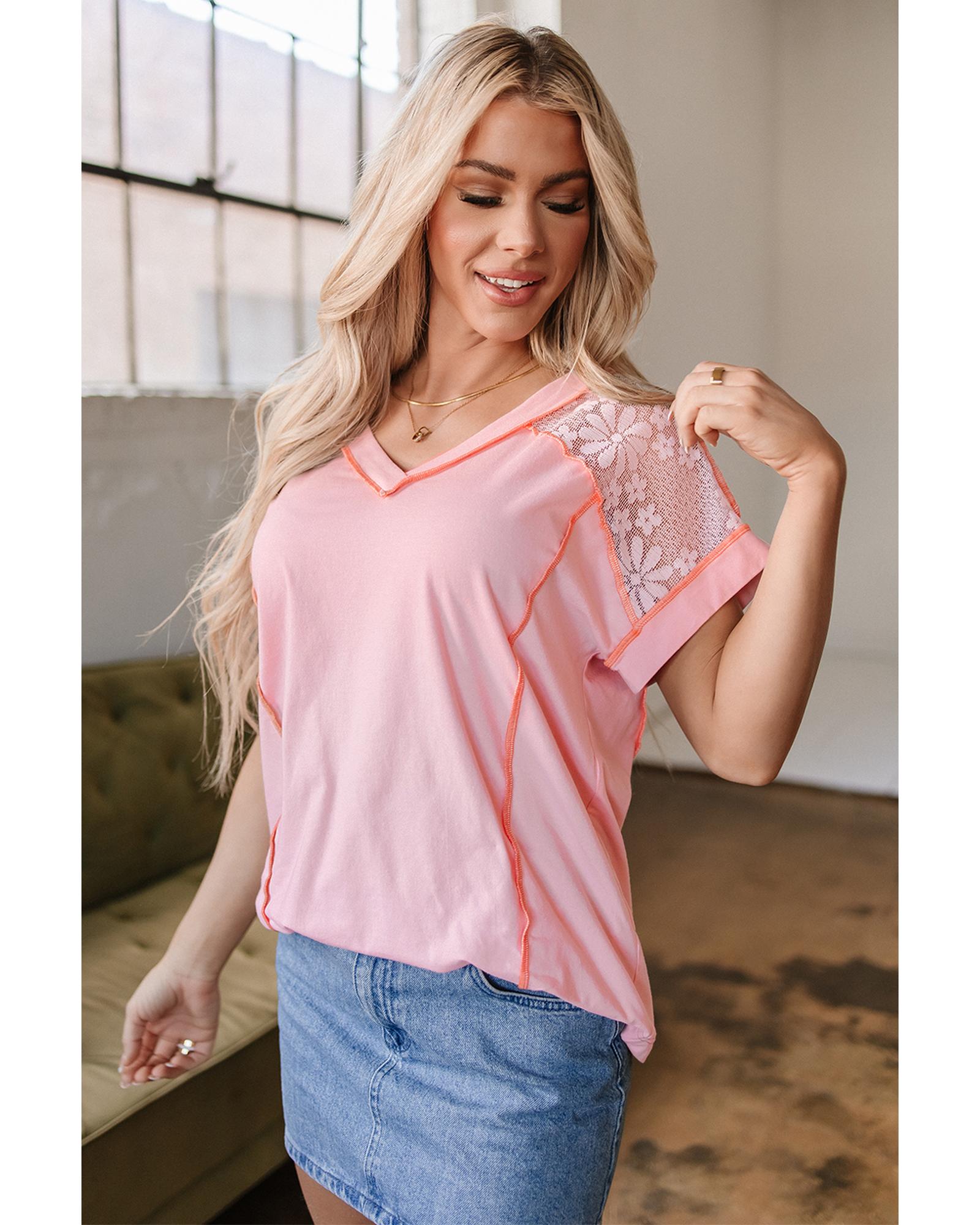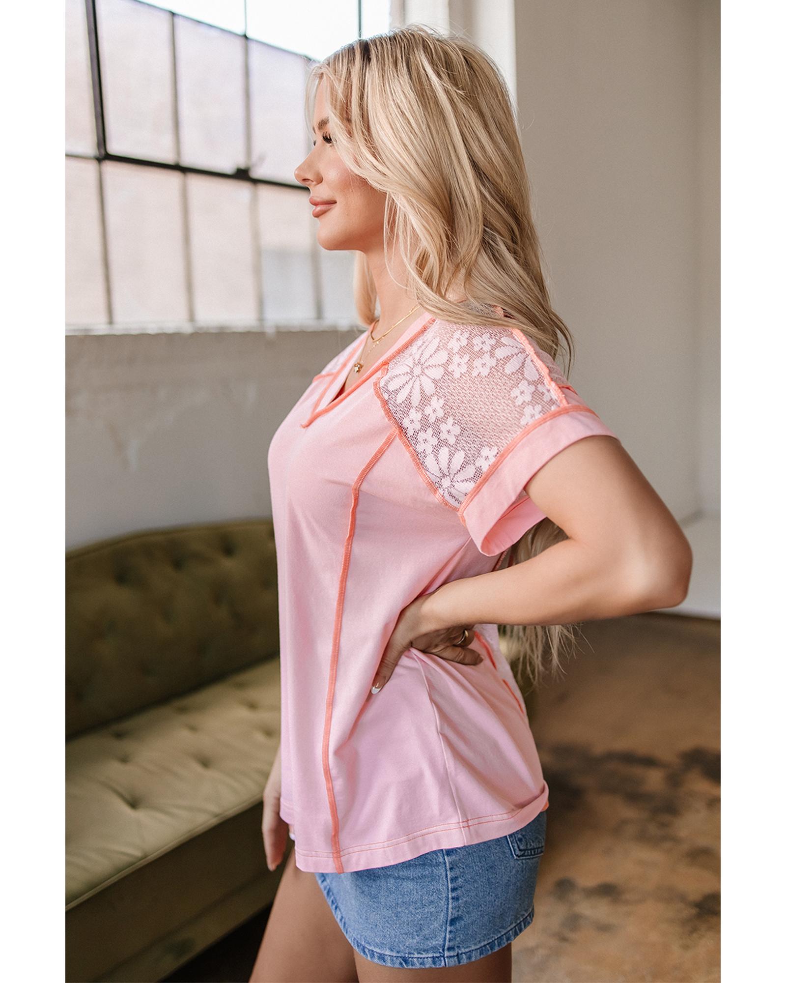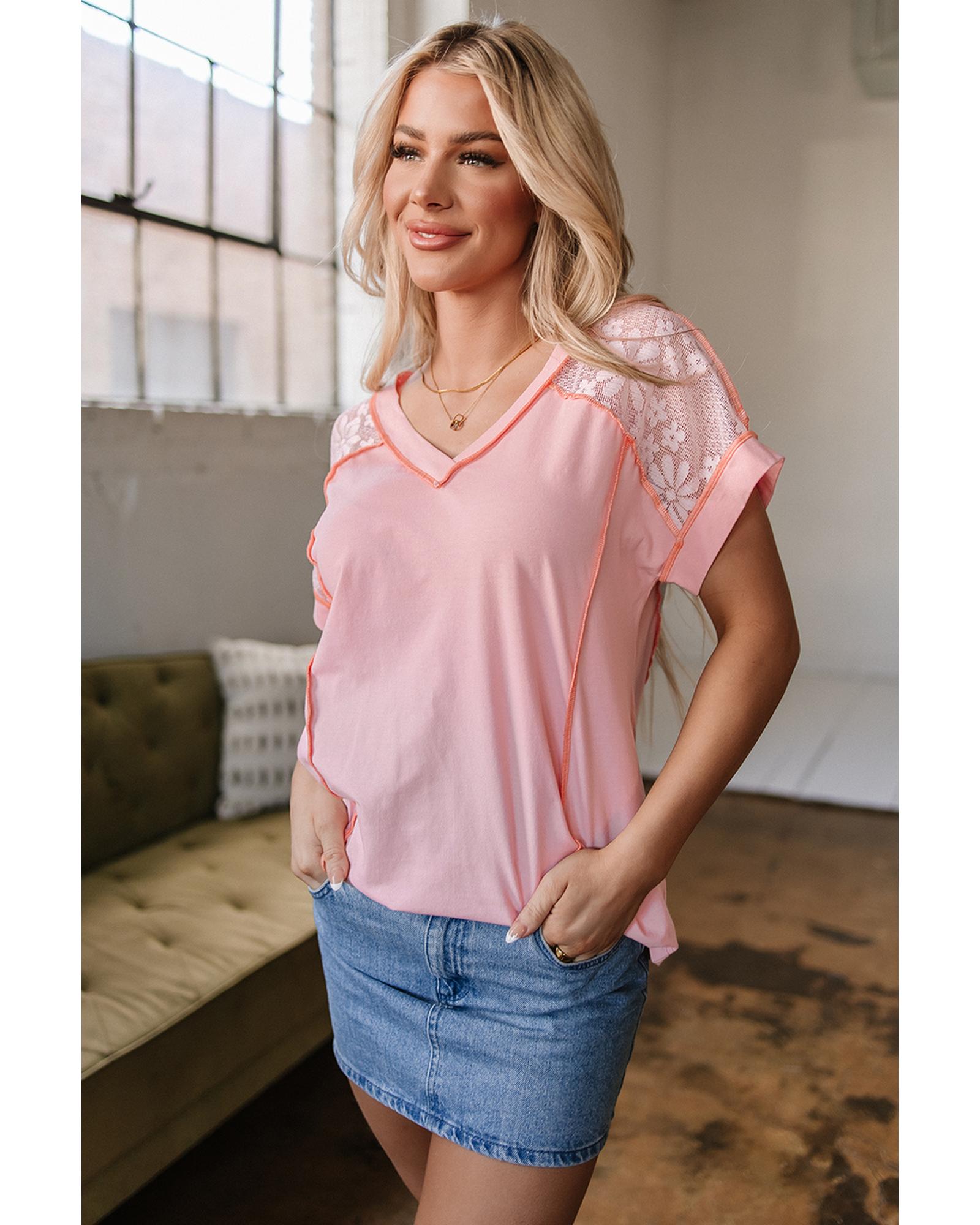 Light Pink Lace Patchwork Exposed Seam V Neck T Shirt – L