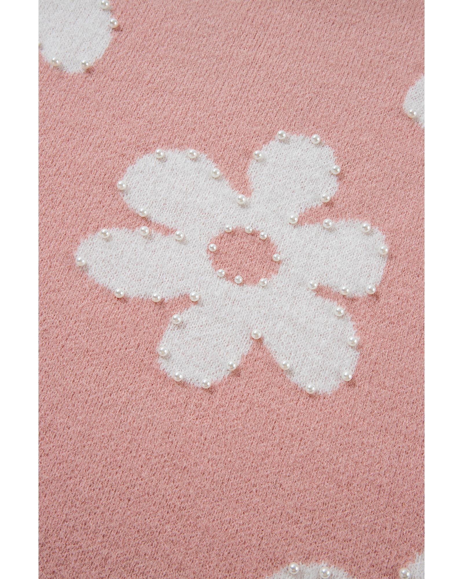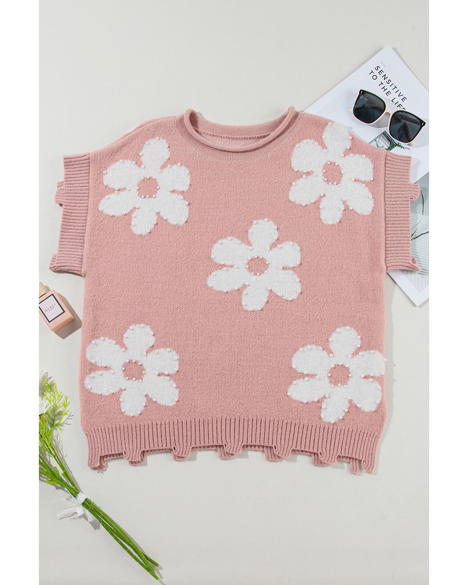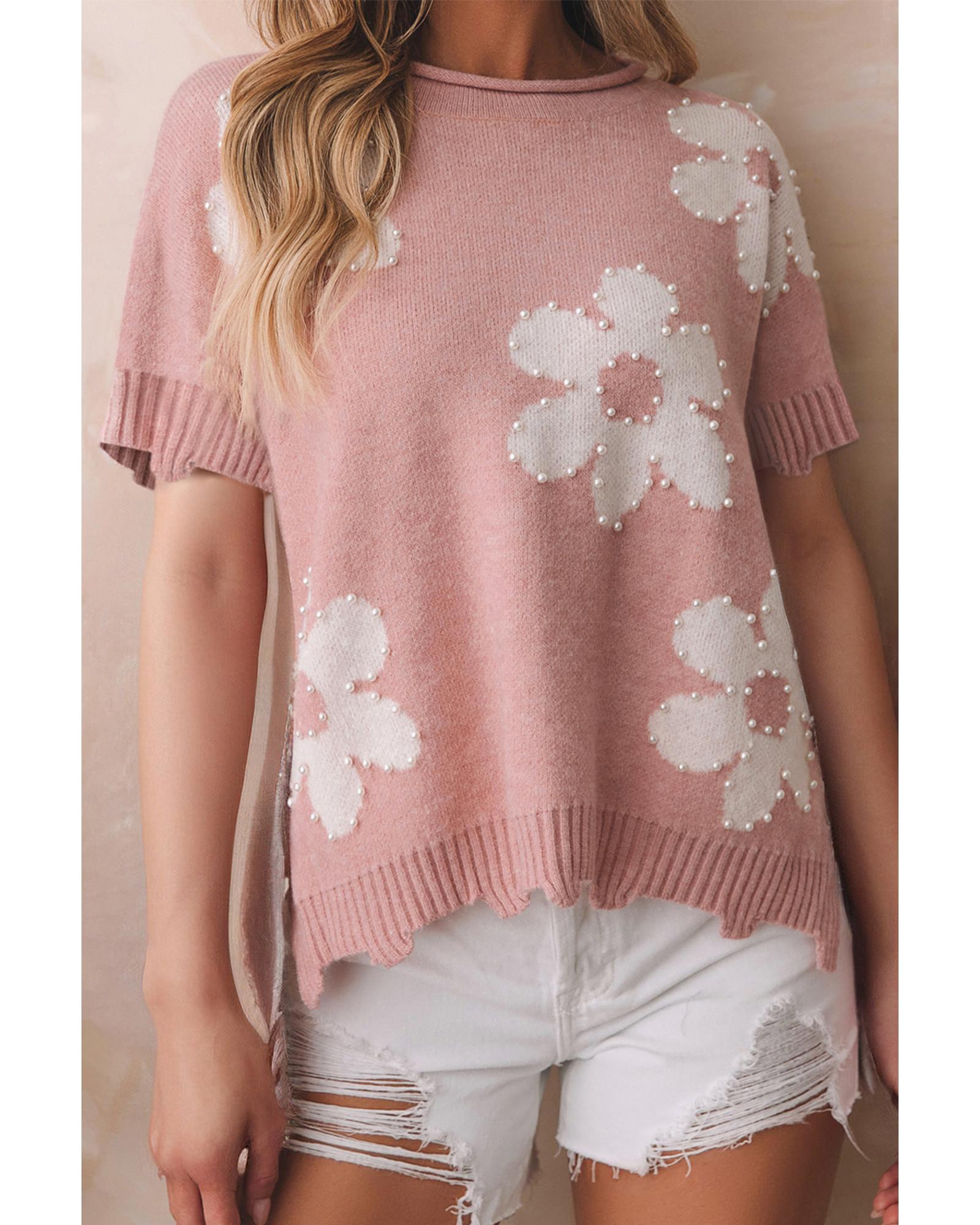 Light Pink Pearled Flower Distressed Edge Sweater T Shirt – M