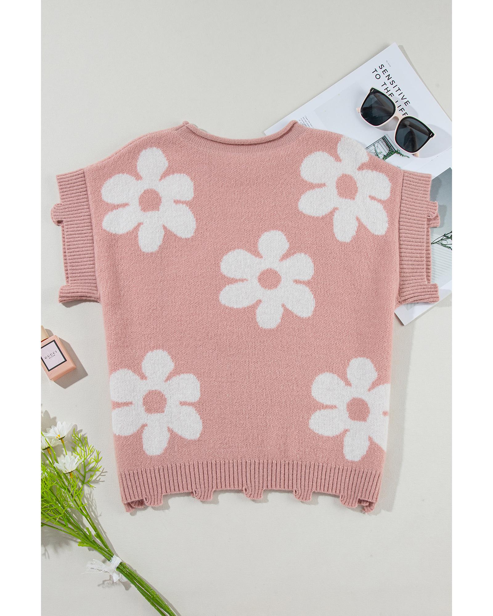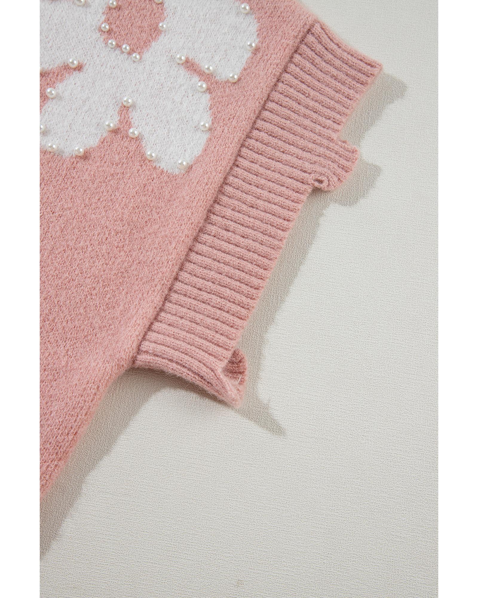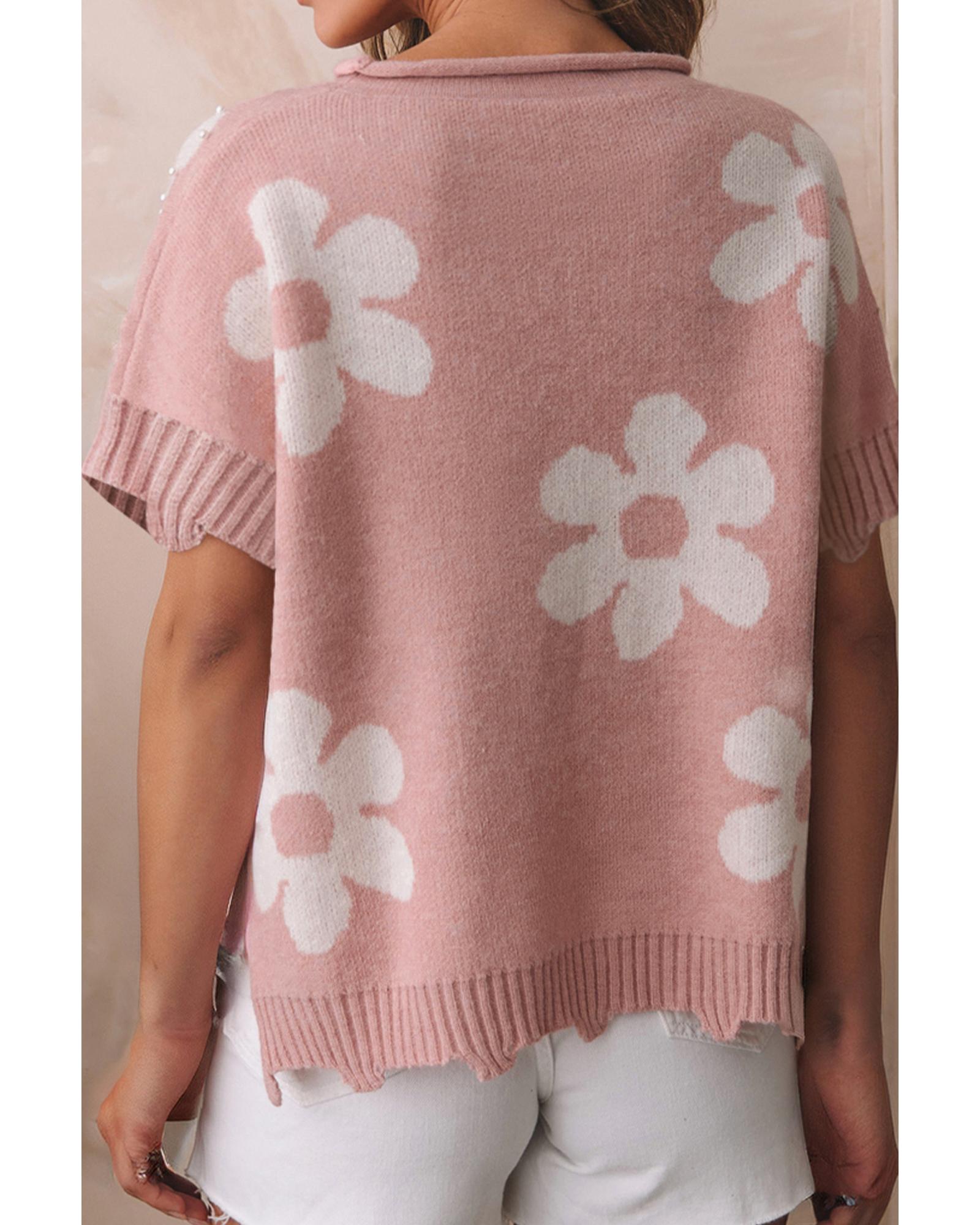 Light Pink Pearled Flower Distressed Edge Sweater T Shirt – M