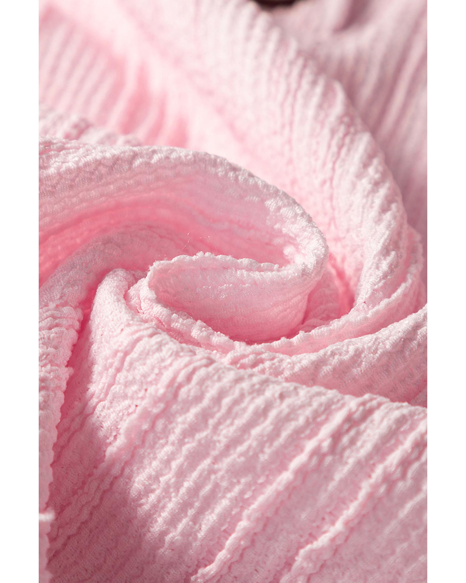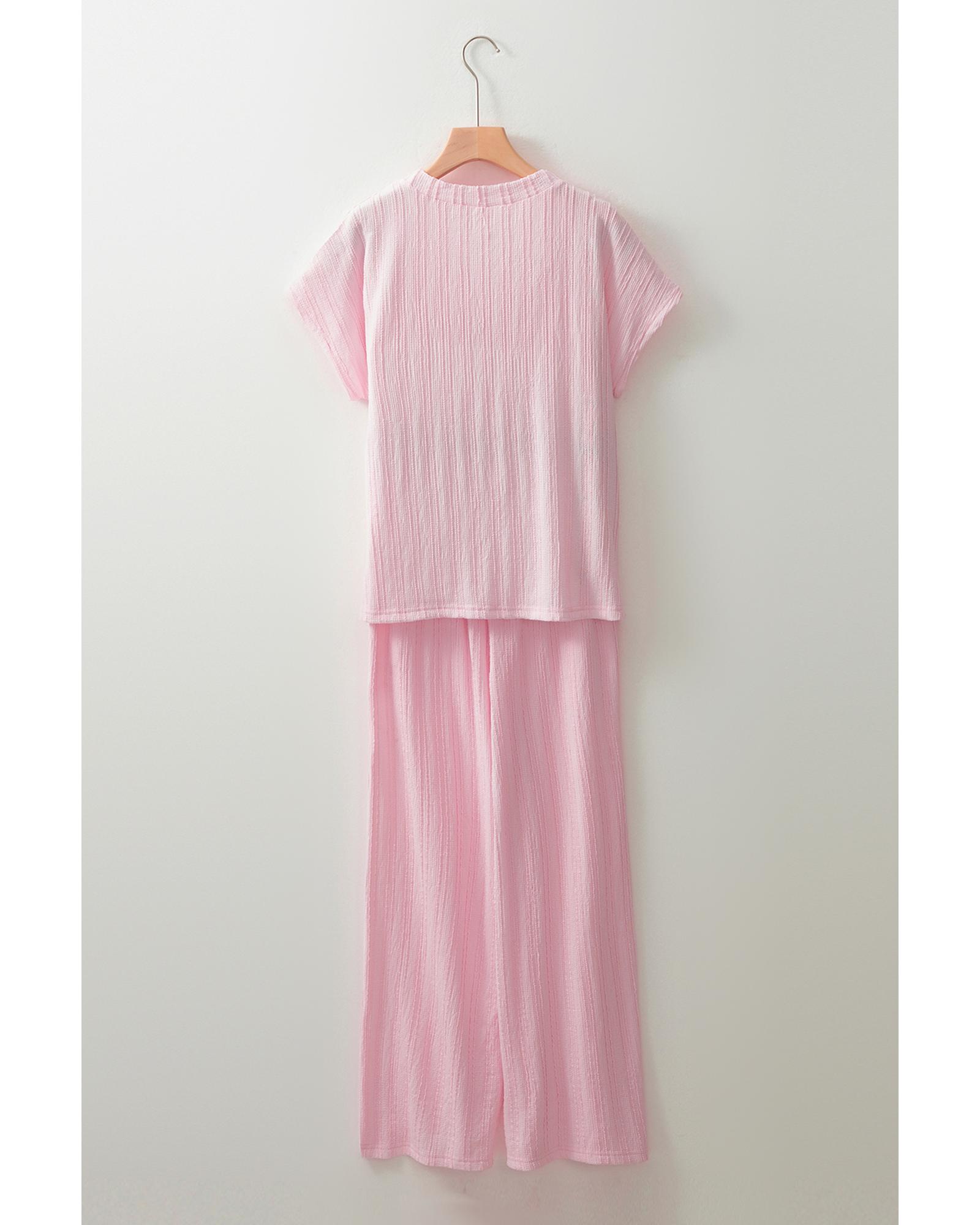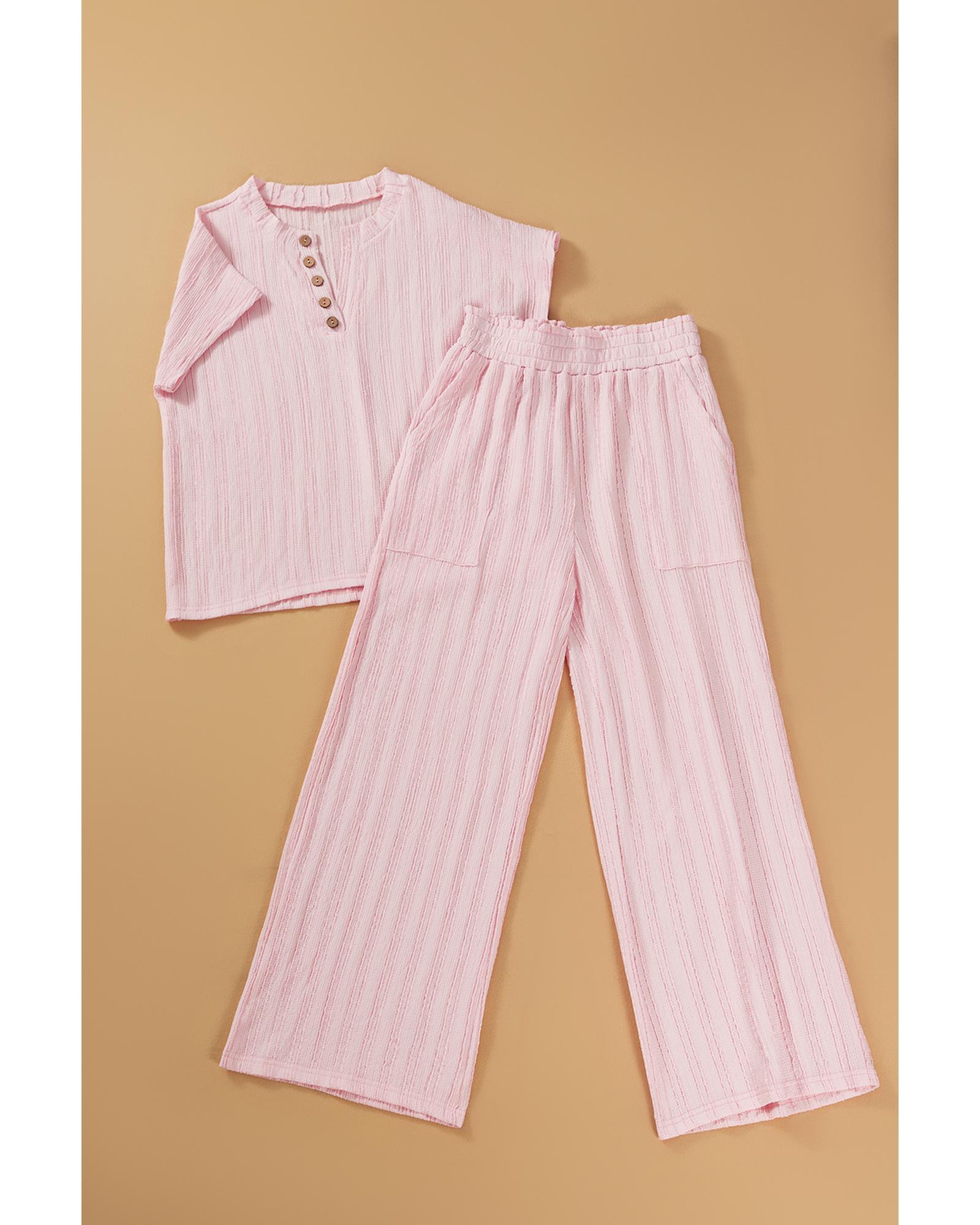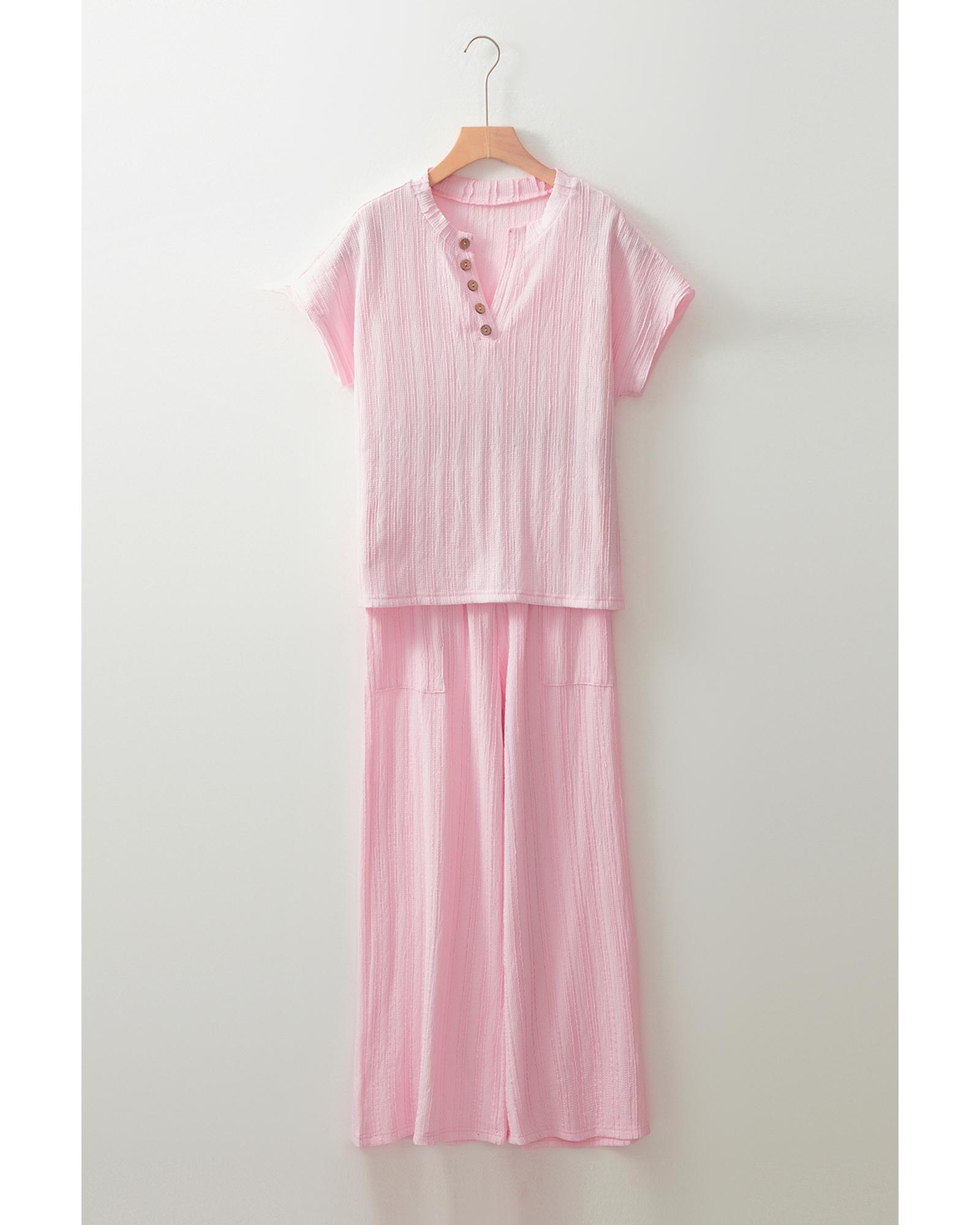 - Light Pink Textured Short Sleeve Henley Top and Pocketed Wide Leg Pants