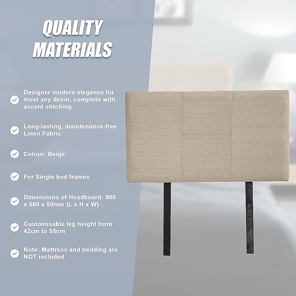 This headboard for standard Single-sized bed frames is created with quality materials, including easy-to-maintain Linen Fabric that will maintain its sophisticated look for many years to come. This particular model comes with elegant stitching accents that provide just the right level of understated pop. A neutral beige will blend seamlessly with a wide variety of bed frames and other bedroom furniture.