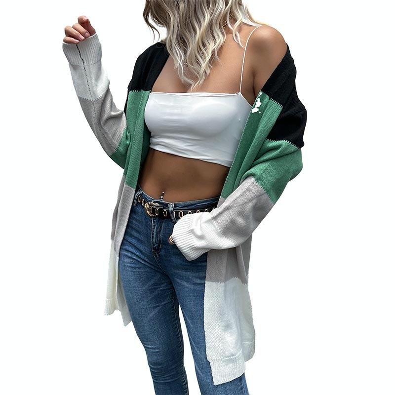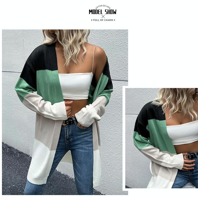 Long Cardigan Open Front Colour Block Cardigan Knit Sweaters Green – S