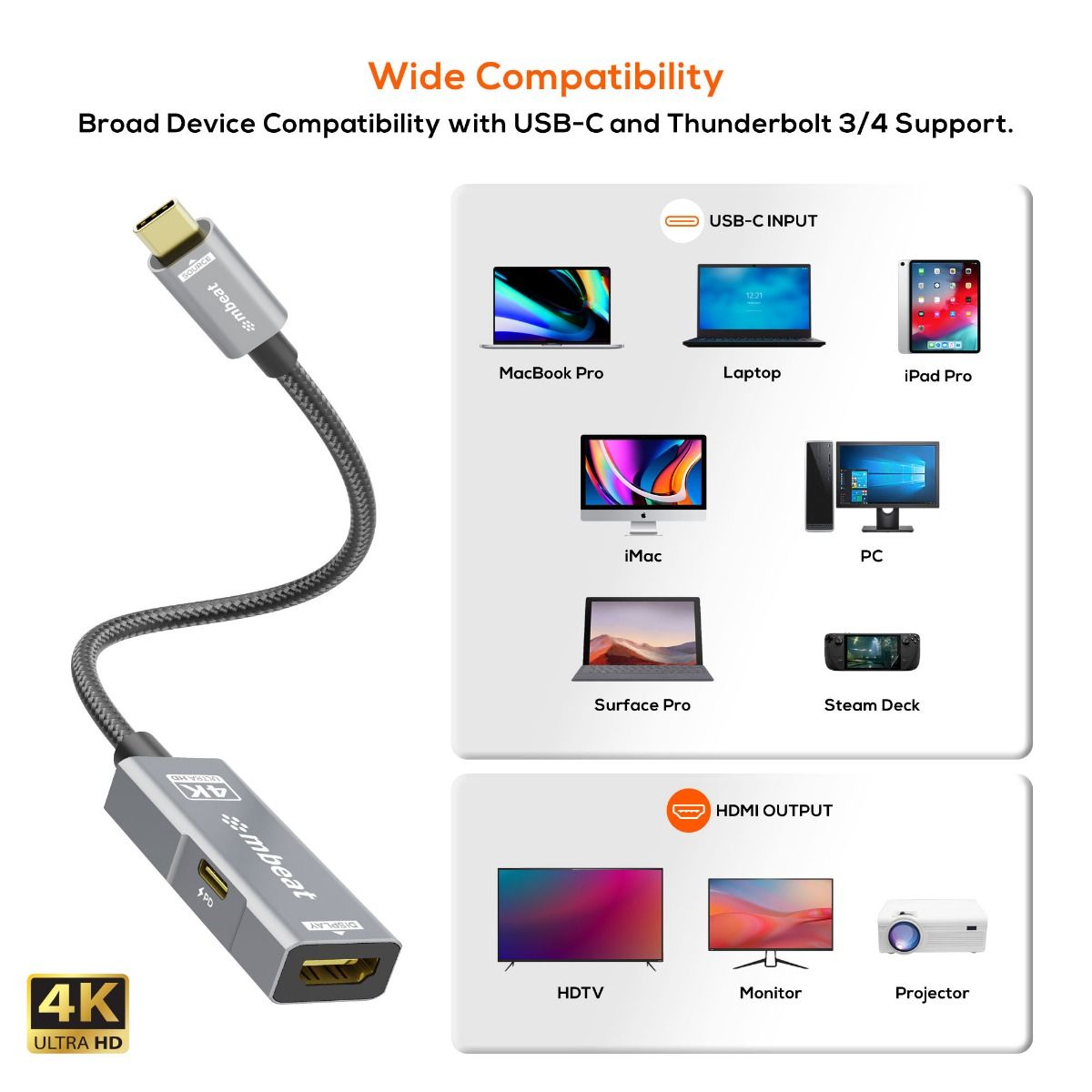 Compatible with a wide range of USB-C devices supporting DisplayPort Alt Mode and Thunderbolt 3/4, including popular models like MacBook Pro/Air, Surface Pro, Steam Deck, and other USB-C laptops and monitors with HDMI inputs.