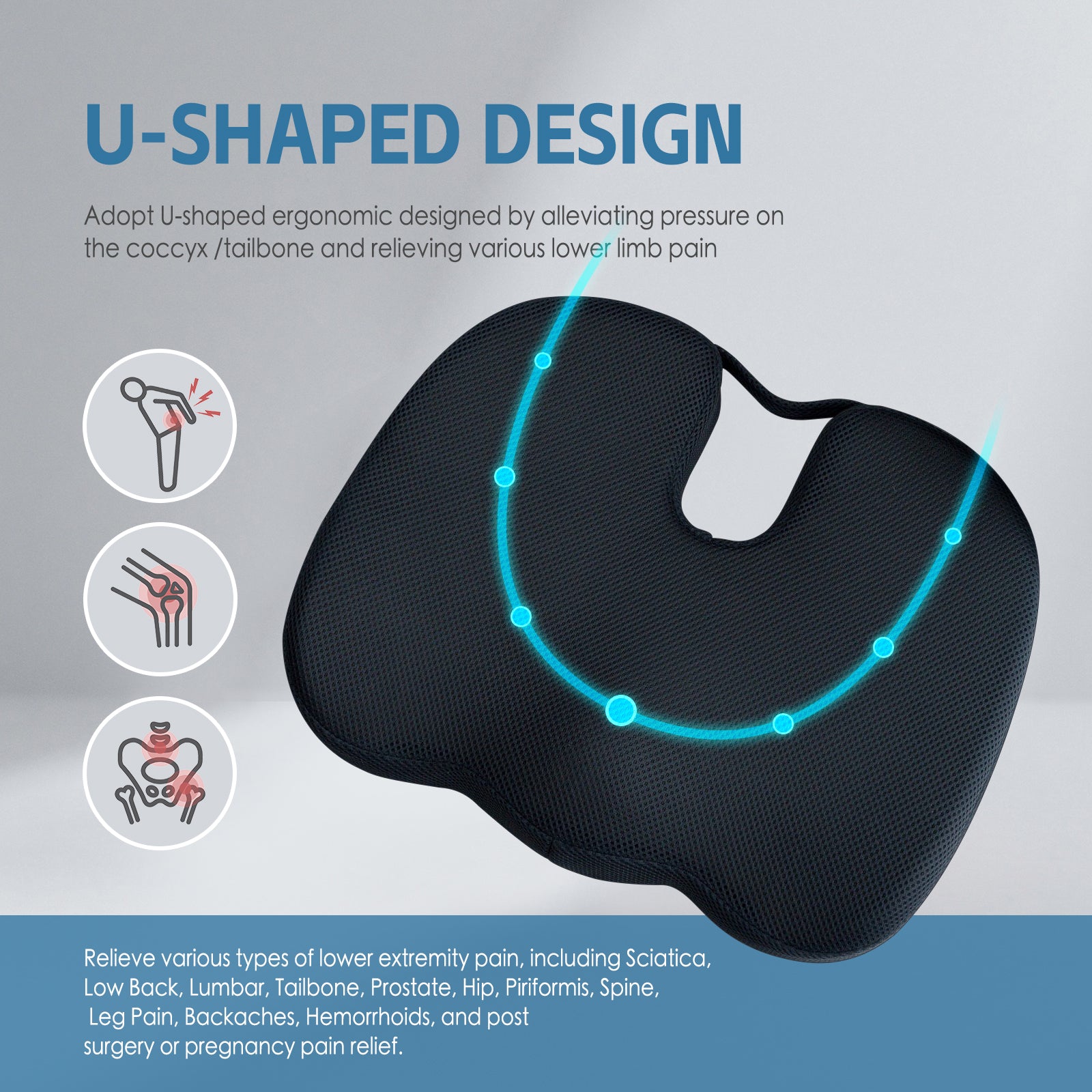 - Supports tailbone and relieves pressure.