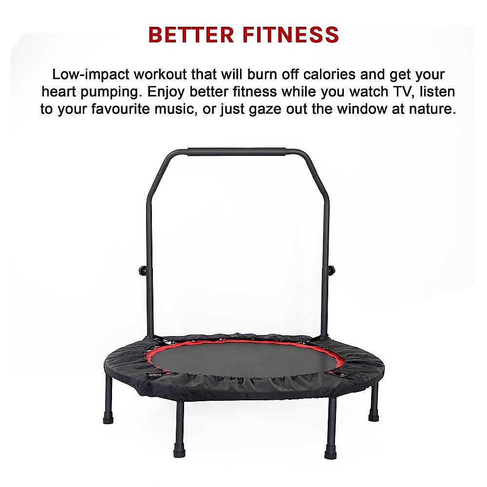 A convenient way to get in shape without ever leaving your home, this mini-rebounder trampoline from Randy Travis Machinery gives you a low-impact workout that will burn off calories and get your heart pumping. Enjoy better fitness while you watch TV, listen to your favourite music, or just gaze out the window at nature. A vaulted handrail provides stability if you lose your balance. After you finish your workout, just stash the mini-trampoline in your wardrobe. With its 40-inch diameter, it can fit easily in even the smallest spaces. Its bouncy, low-impact surface protects your joints, while its rubber-covered legs protect your floor from scratches and dents.