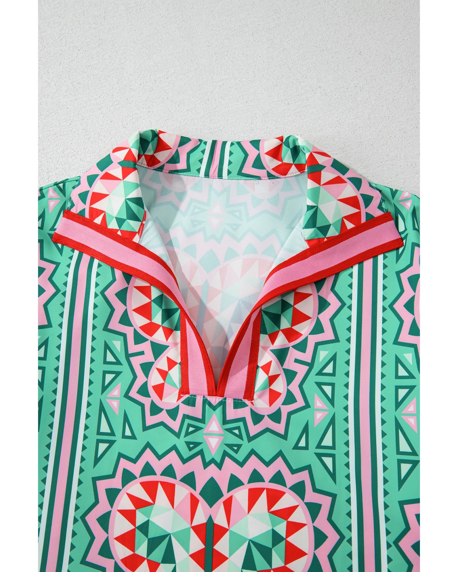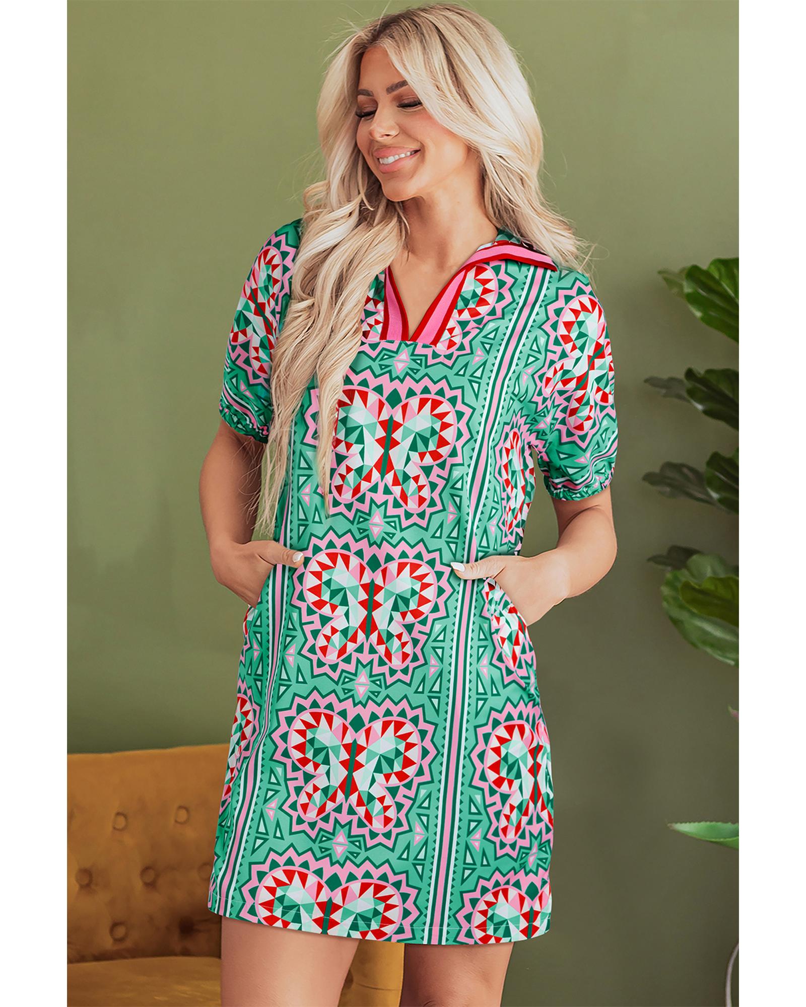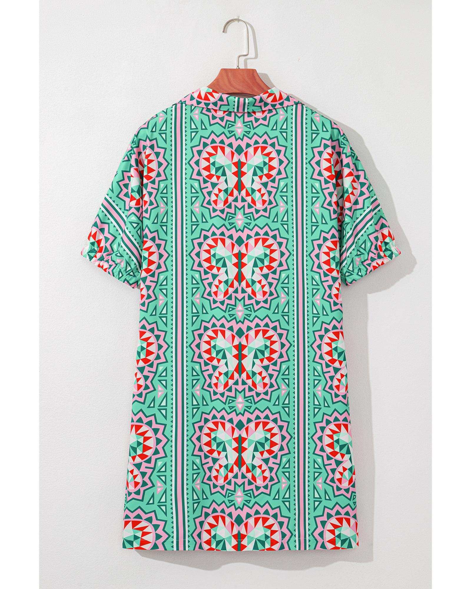 - Mint Green Geometric Butterfly Print Split Neck Short Sleeve Dress