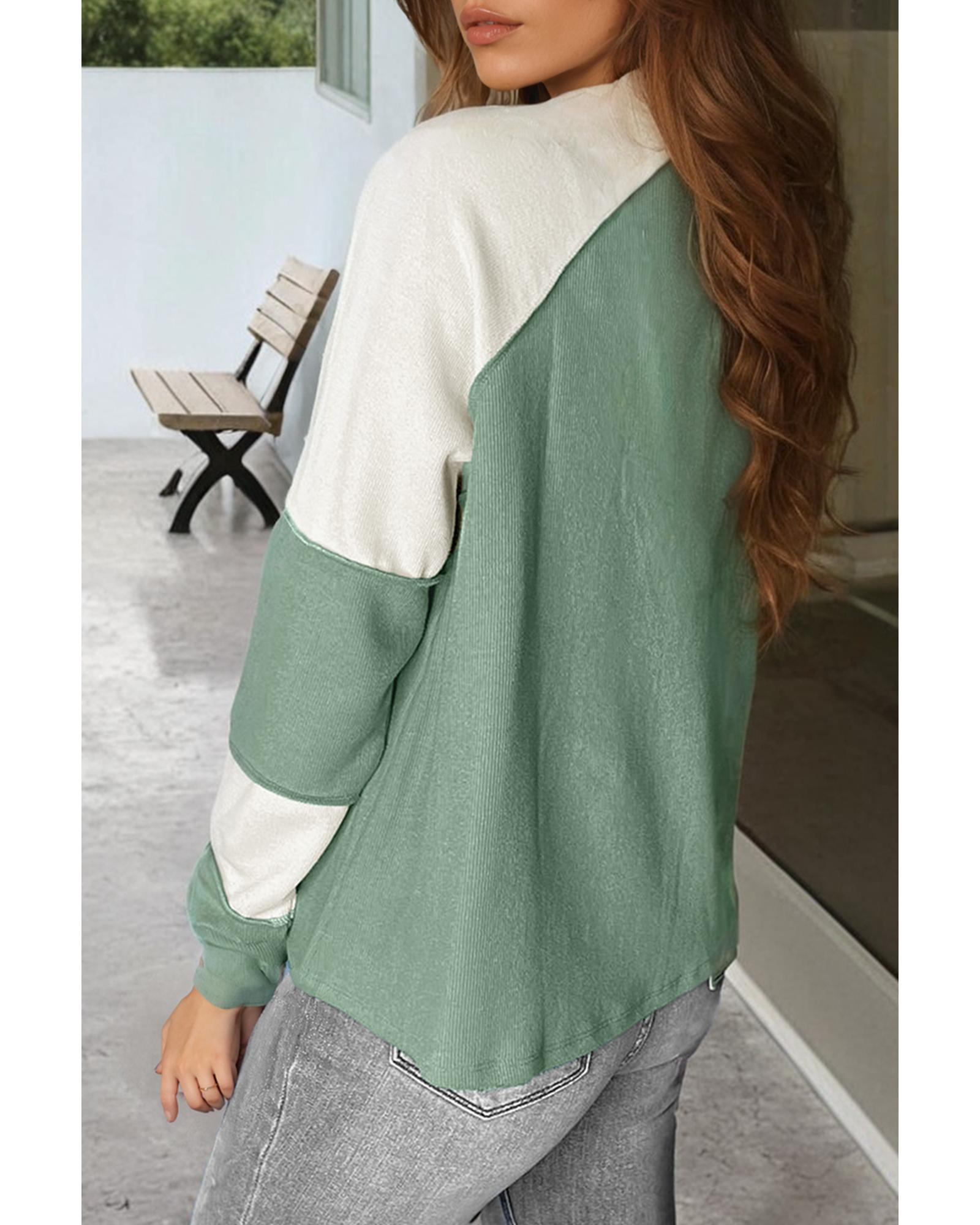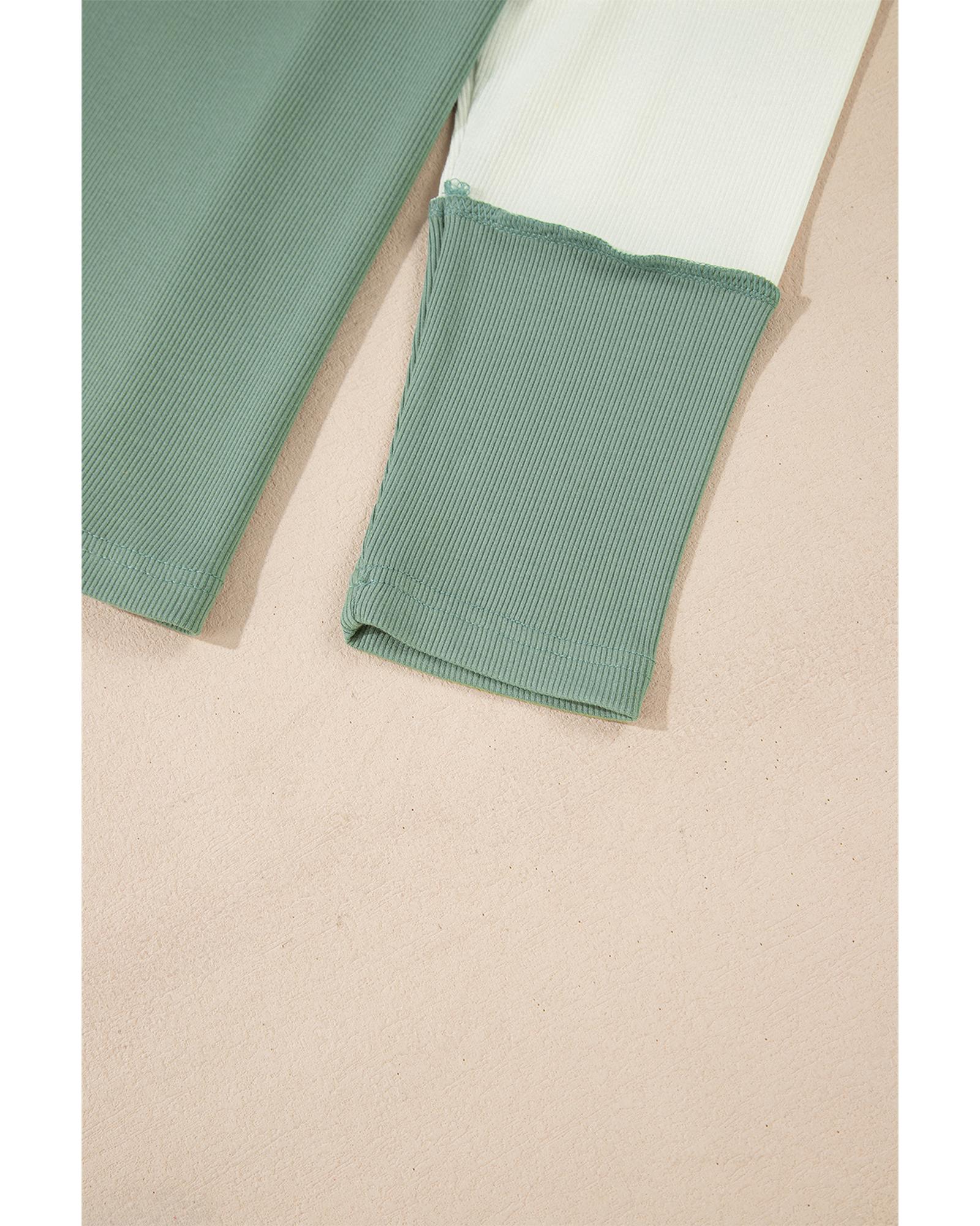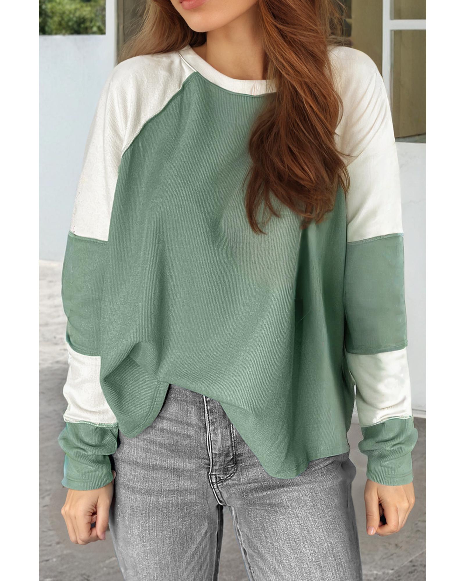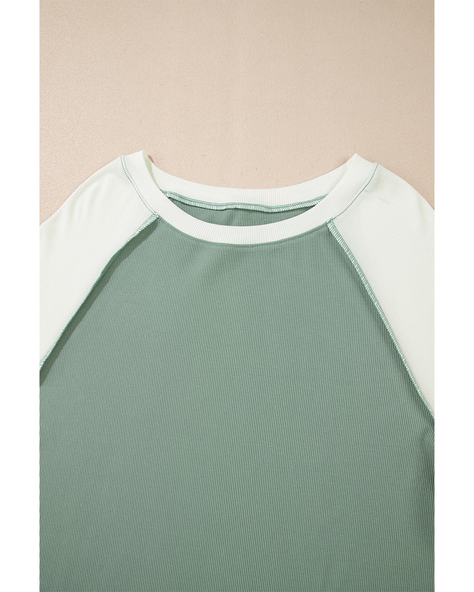 - Mint Green Ribbed Colorblock Patchwork Raglan Long Sleeve Top