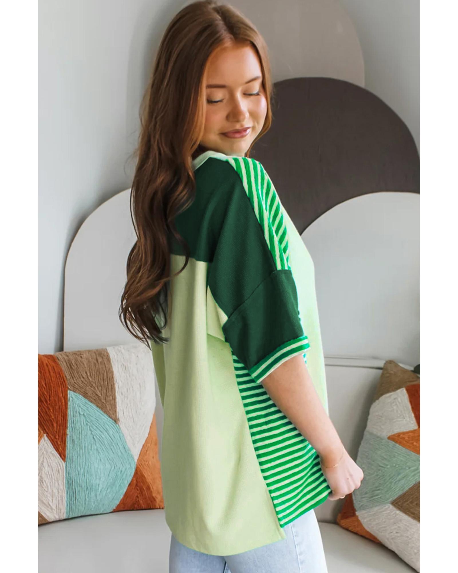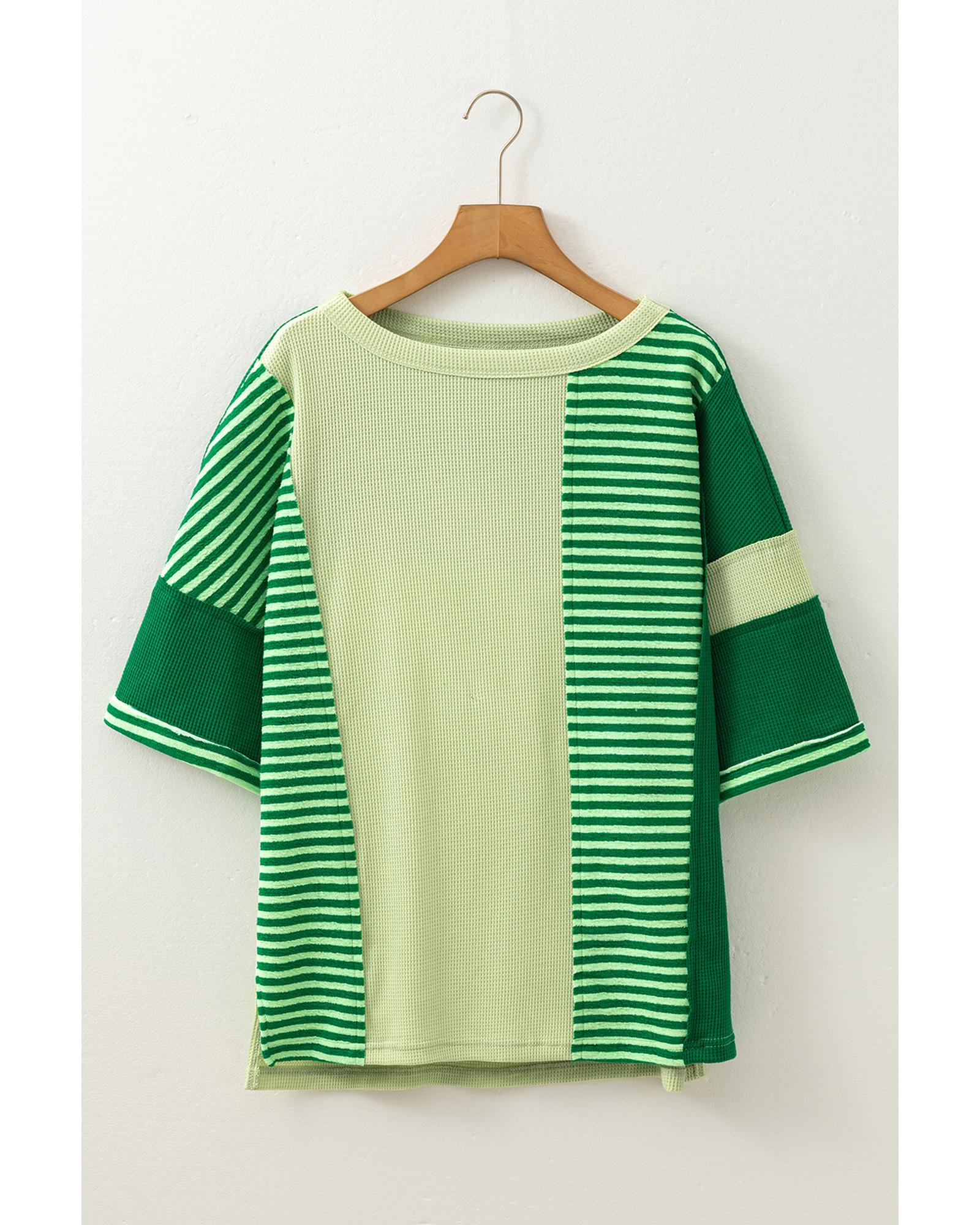 Mint Green Striped Patchwork Textured Colorblock 3/4 Sleeve Knit Top – XL