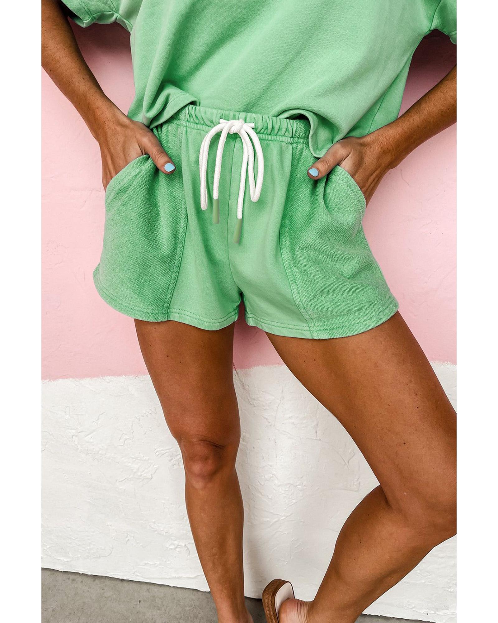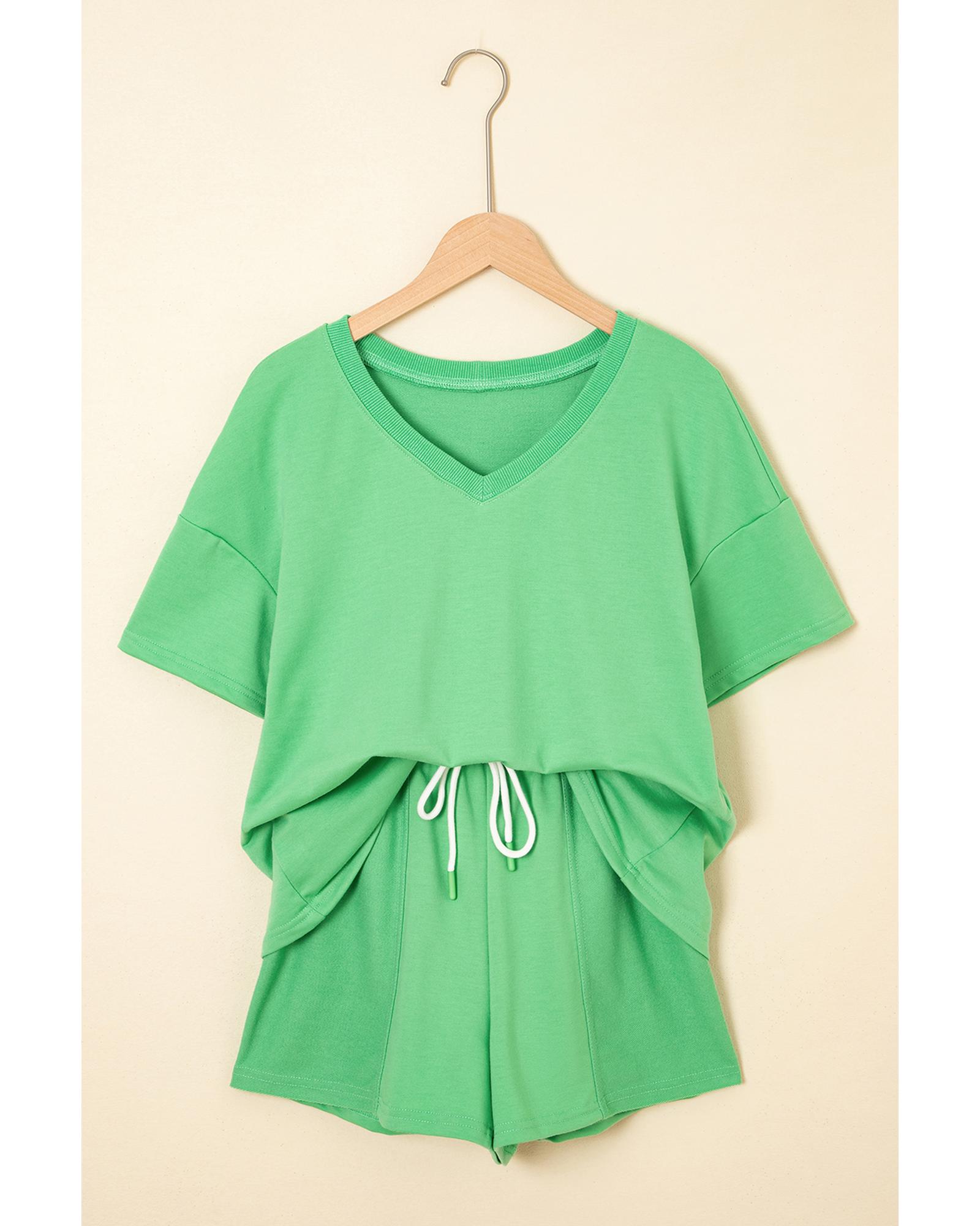 Mint Green V Neck Drop Shoulder Tee and Patchwork Drawstring Shorts Set - S Original price was: $64.99.Current price is: $34.99.