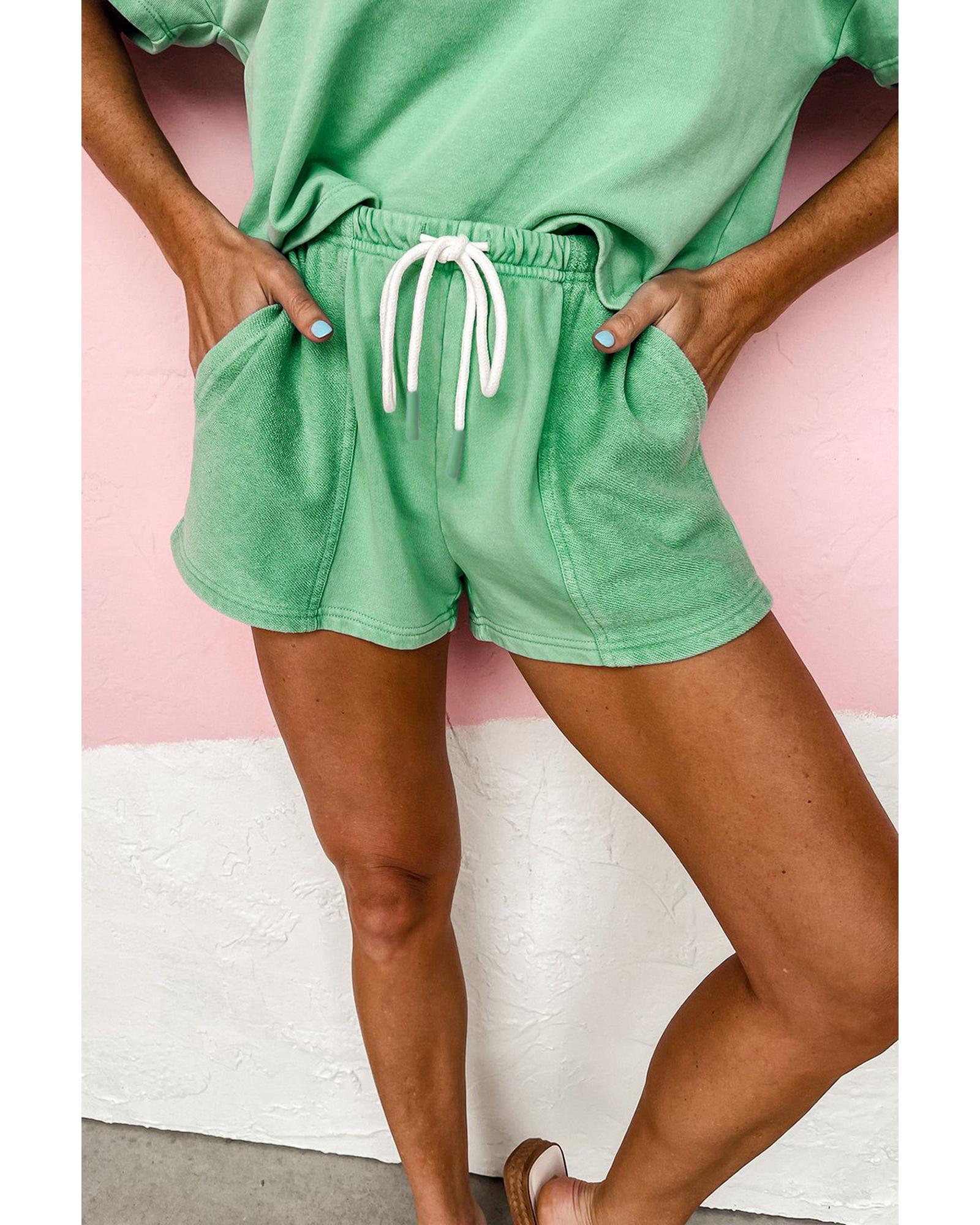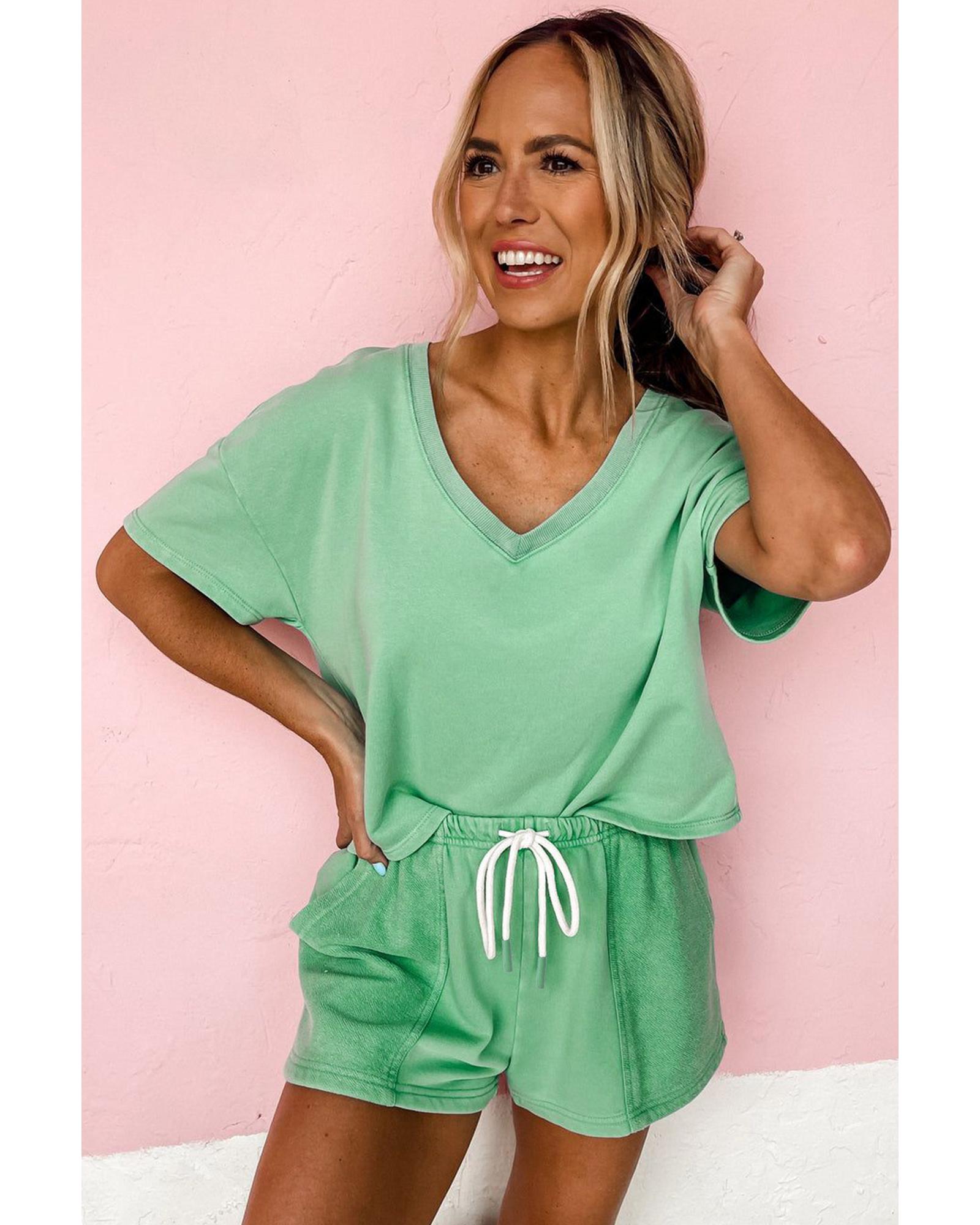 Mint Green V Neck Drop Shoulder Tee and Patchwork Drawstring Shorts Set – S