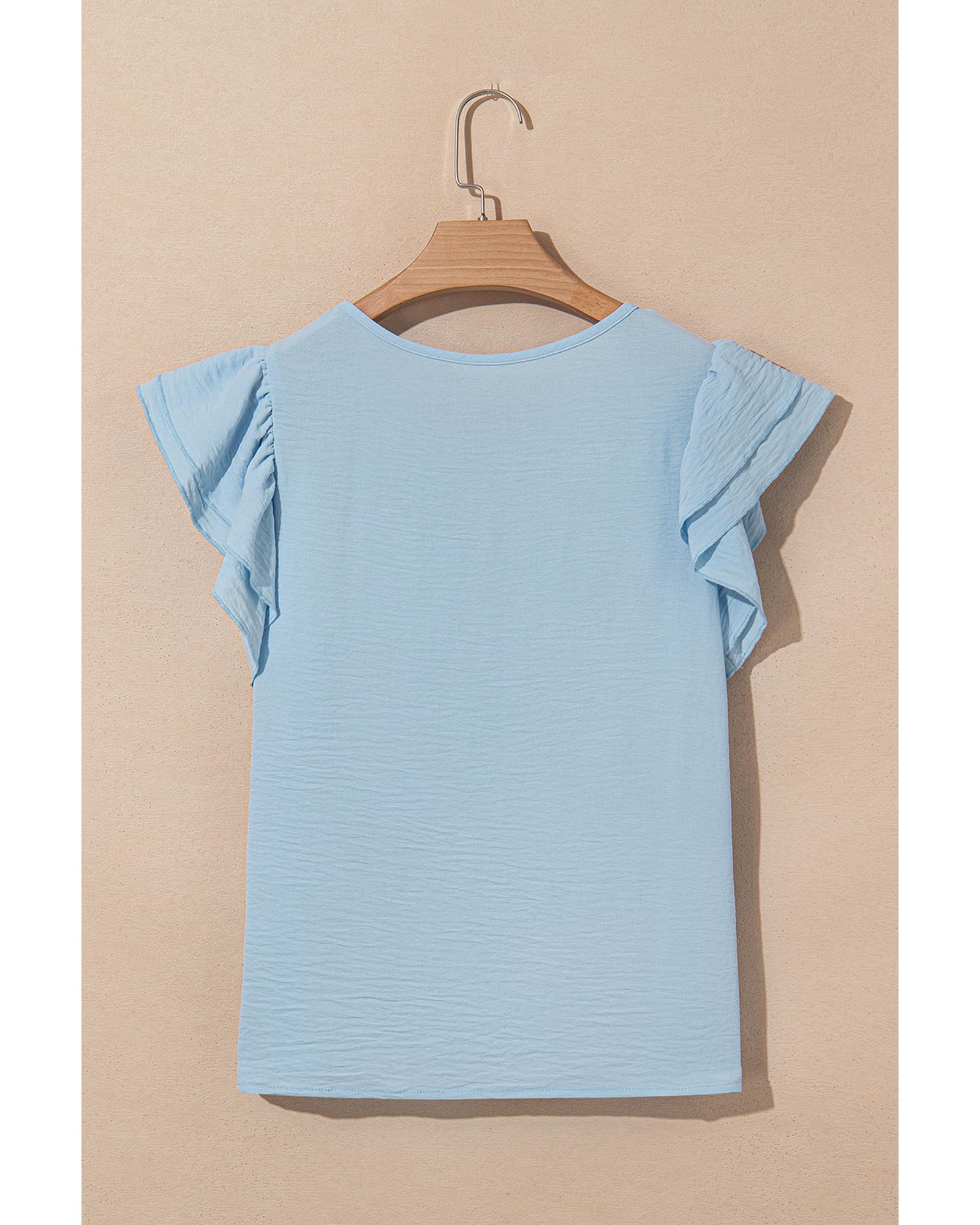 Mist Blue Solid Color Ruffled Short Sleeve Casual Blouse – M