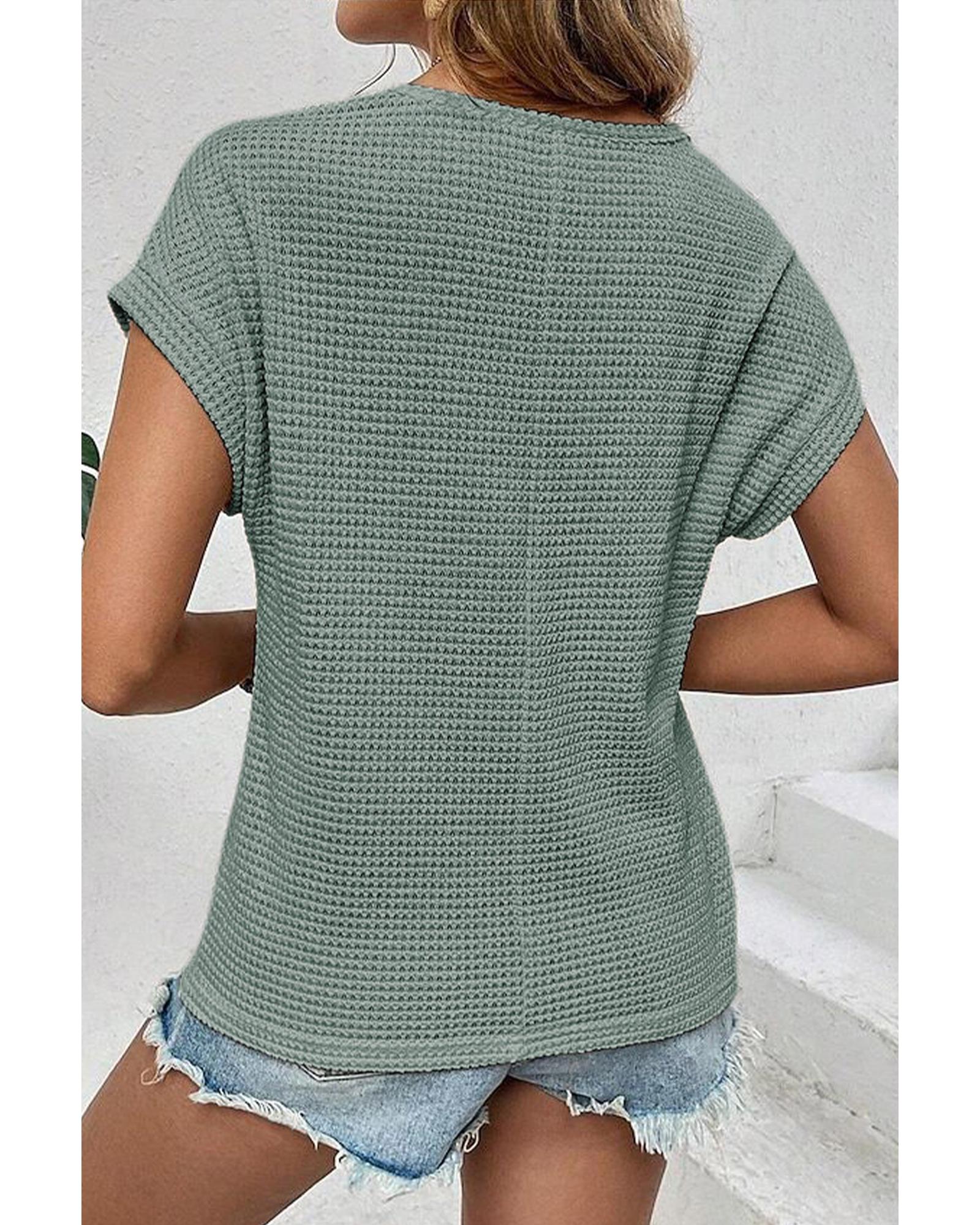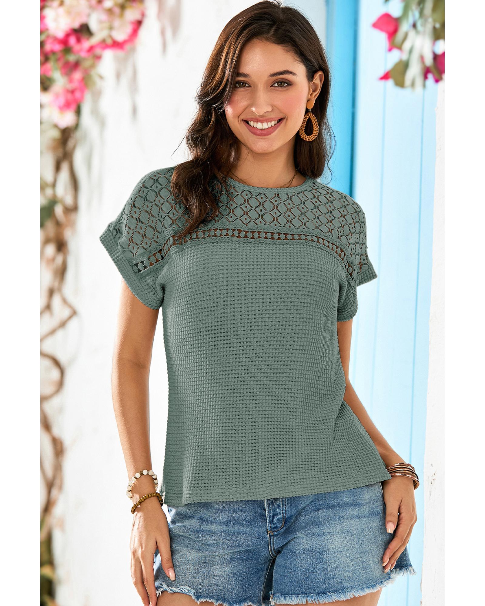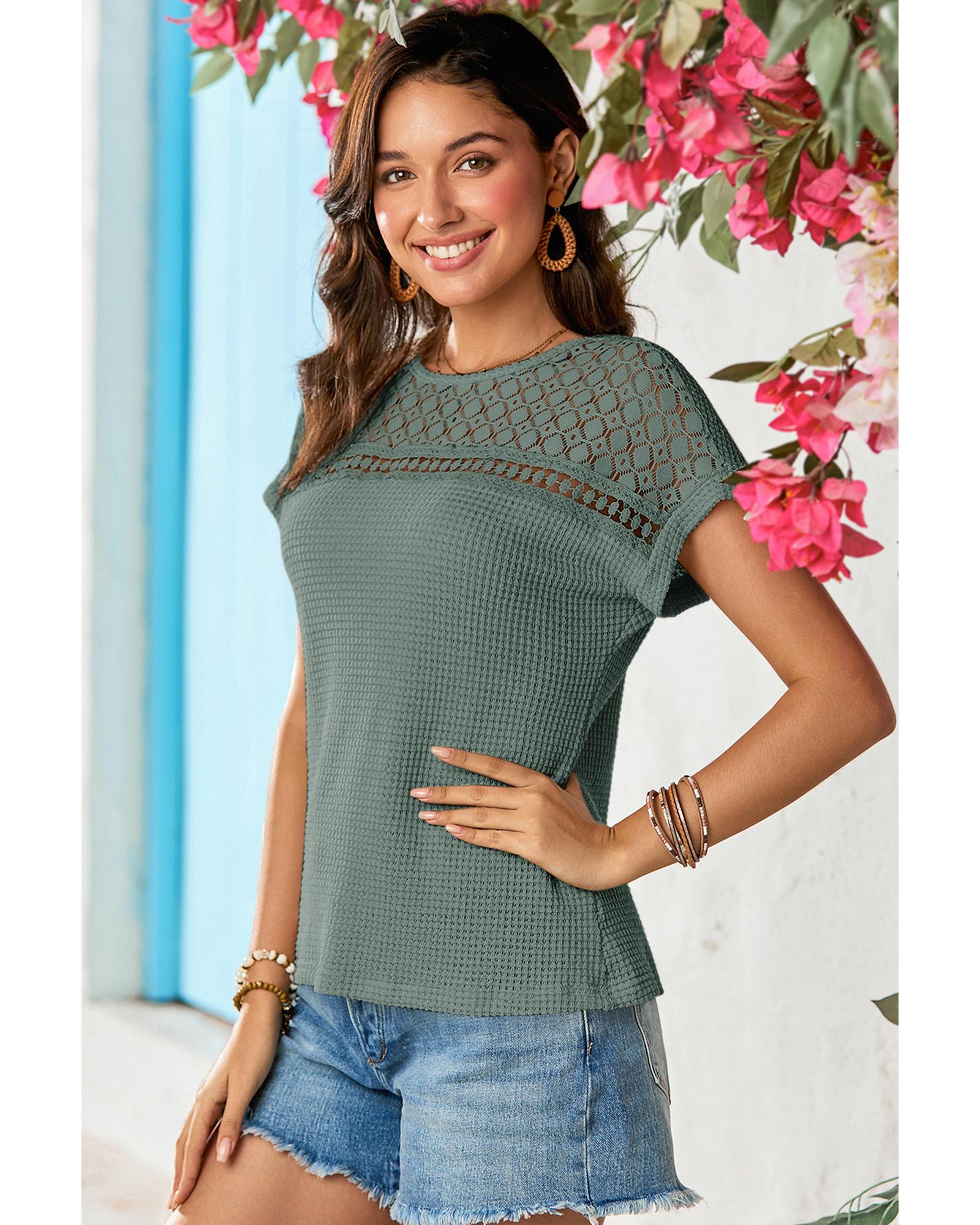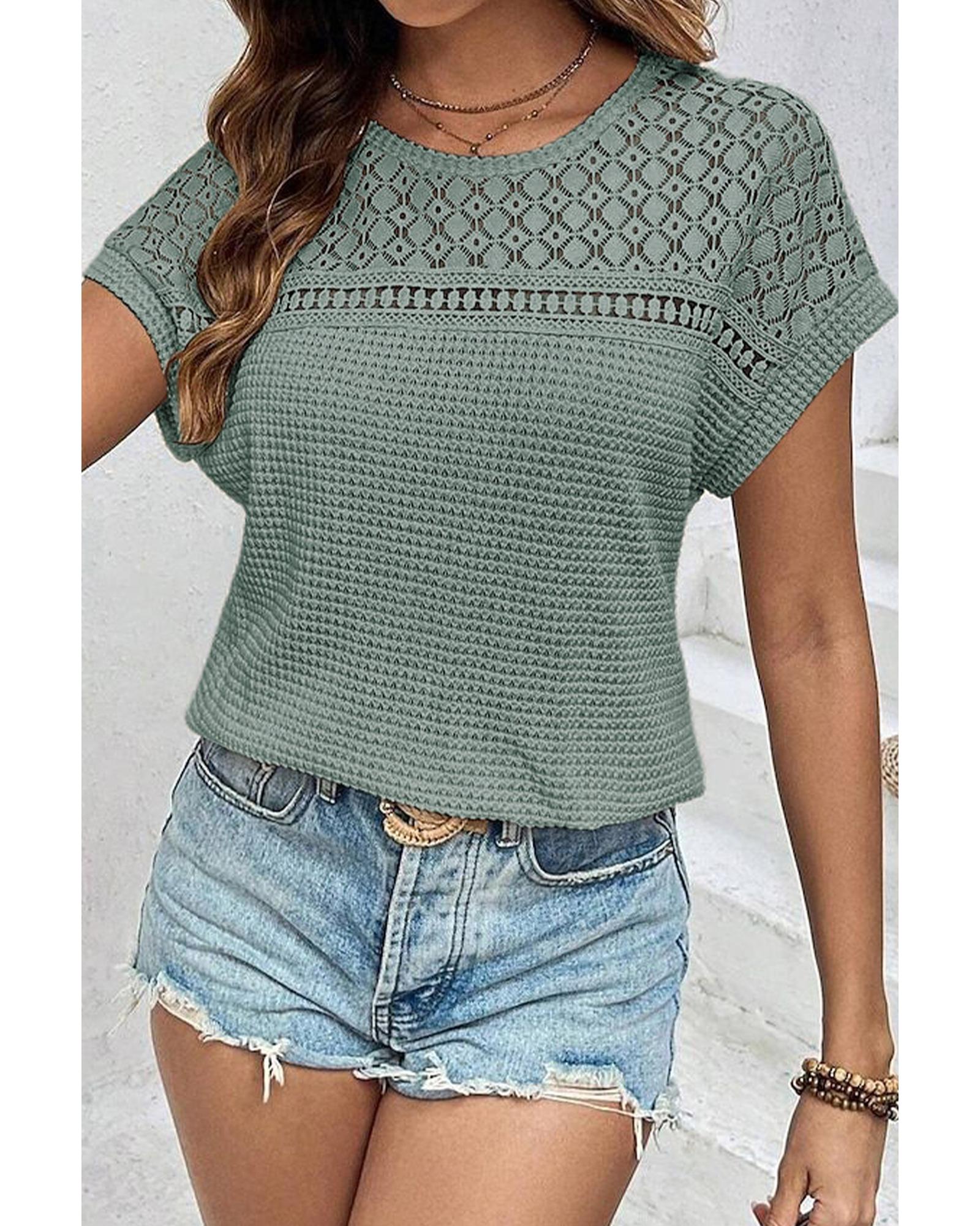 Mist Green Lace Patchwork Waffle Short Sleeve Top – S