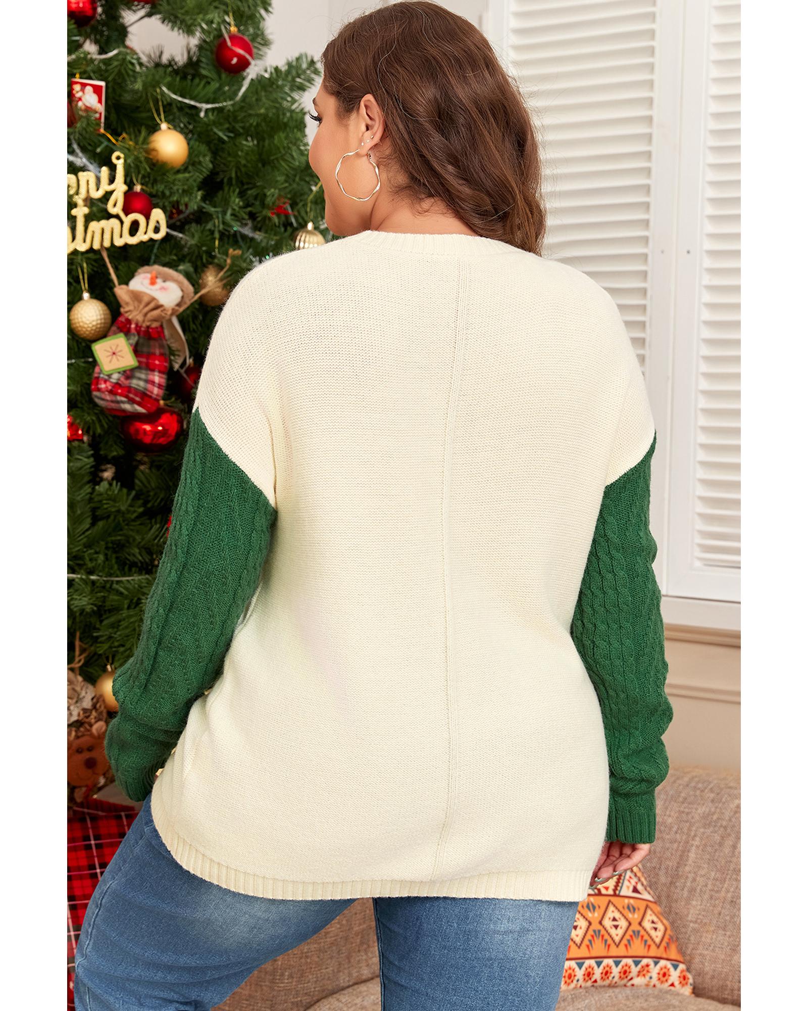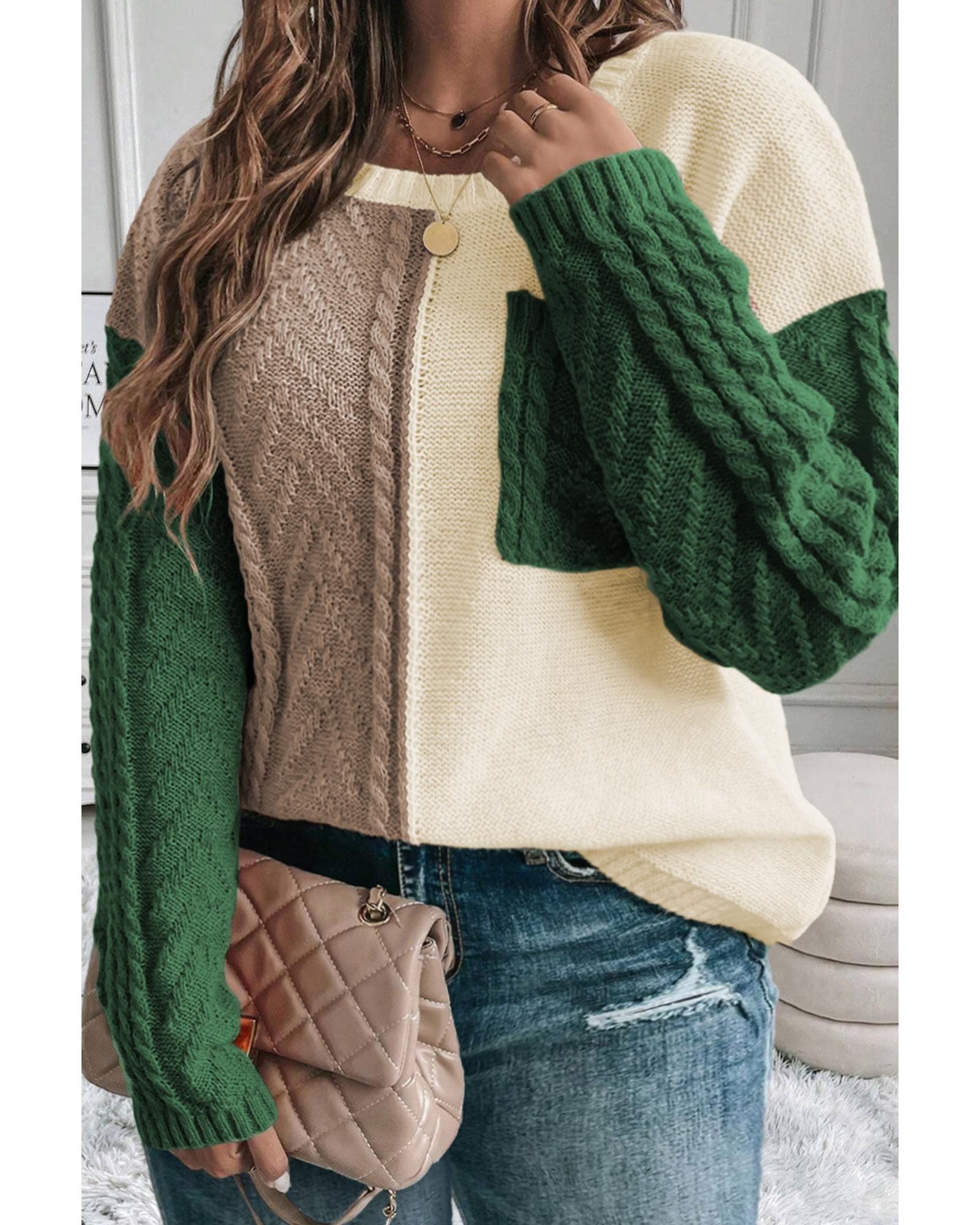 Mist Green Plus Size Cable Knit Color Block Drop Shoulder Sweater – 1X